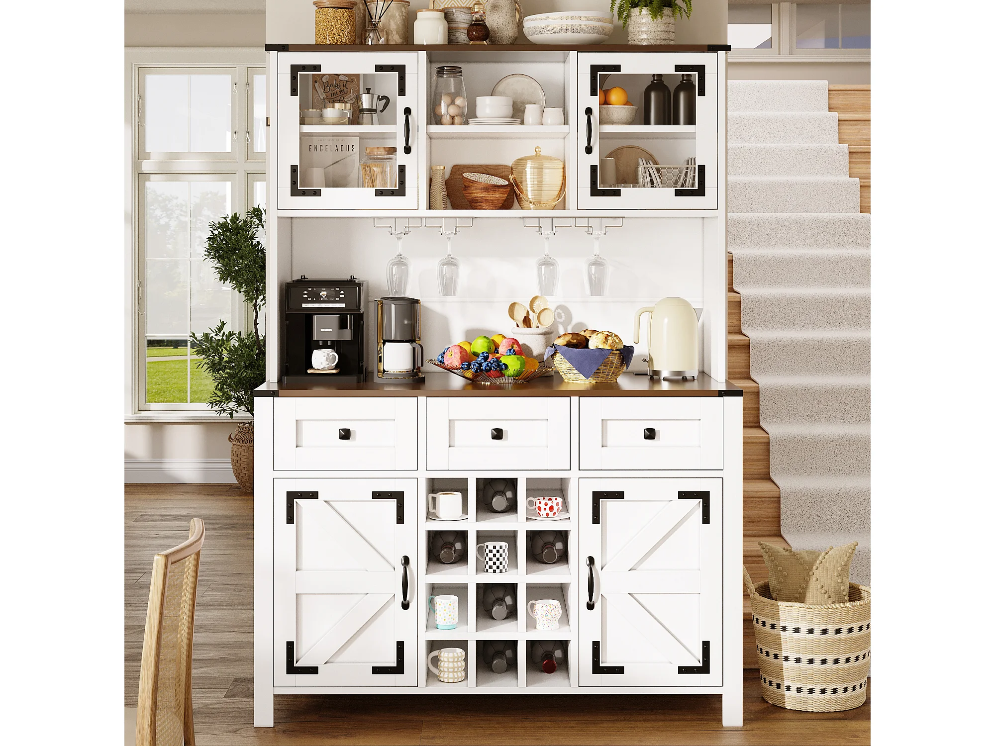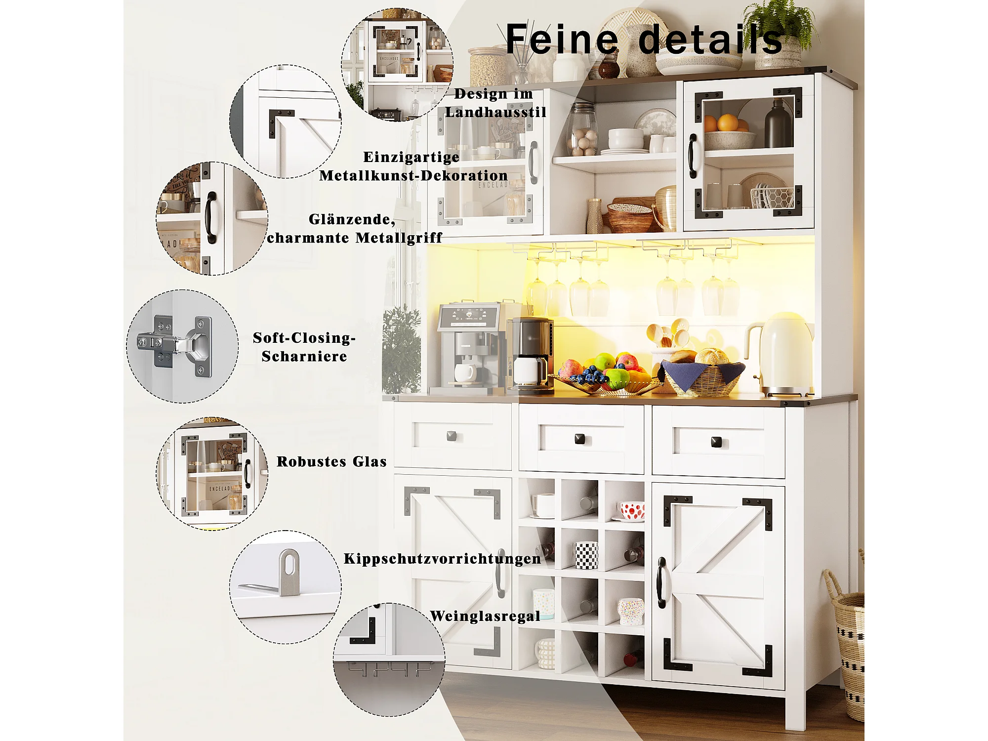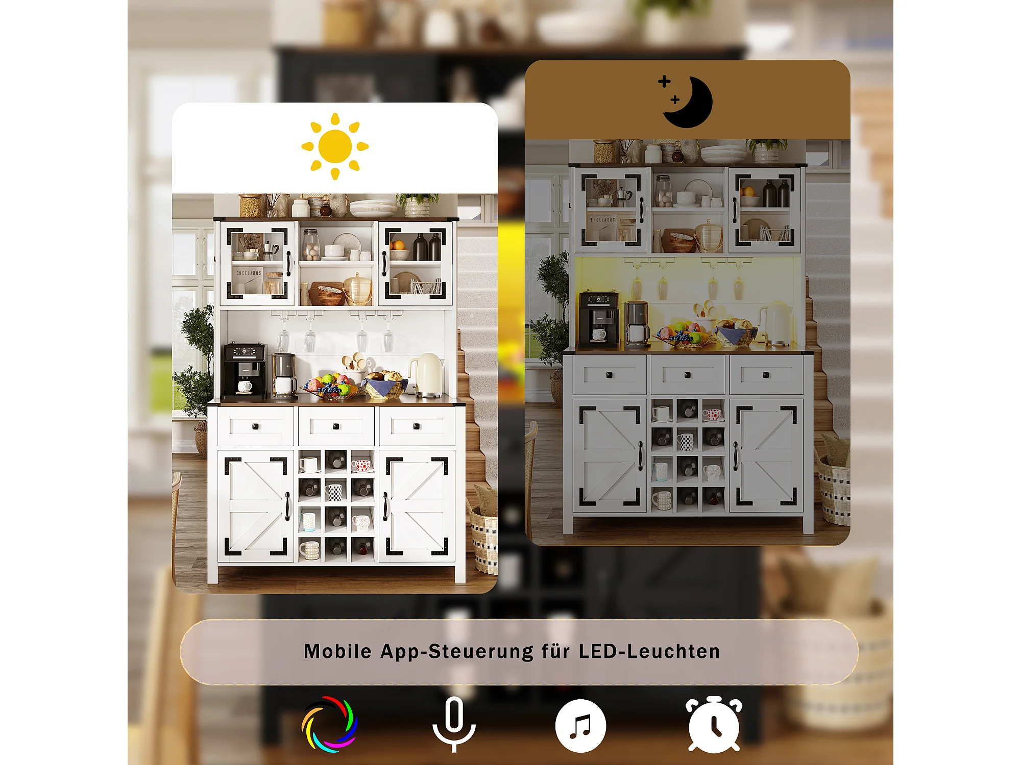 Buffet haut de cuisine moderne - 120 x 40 x 170 cm - avec Leds + USB + 4 portes + 3 tiroirs + étagères - MDF + verre - blanc