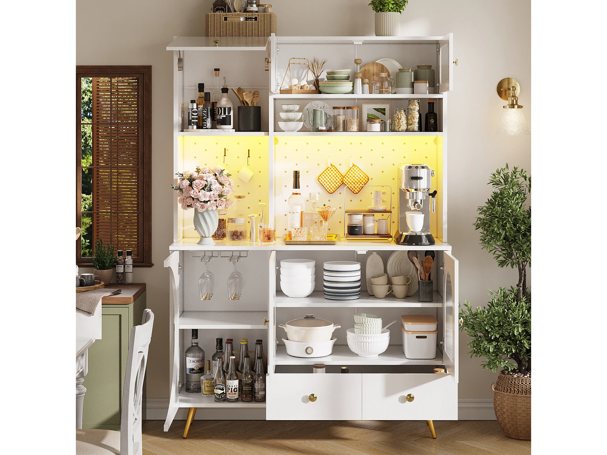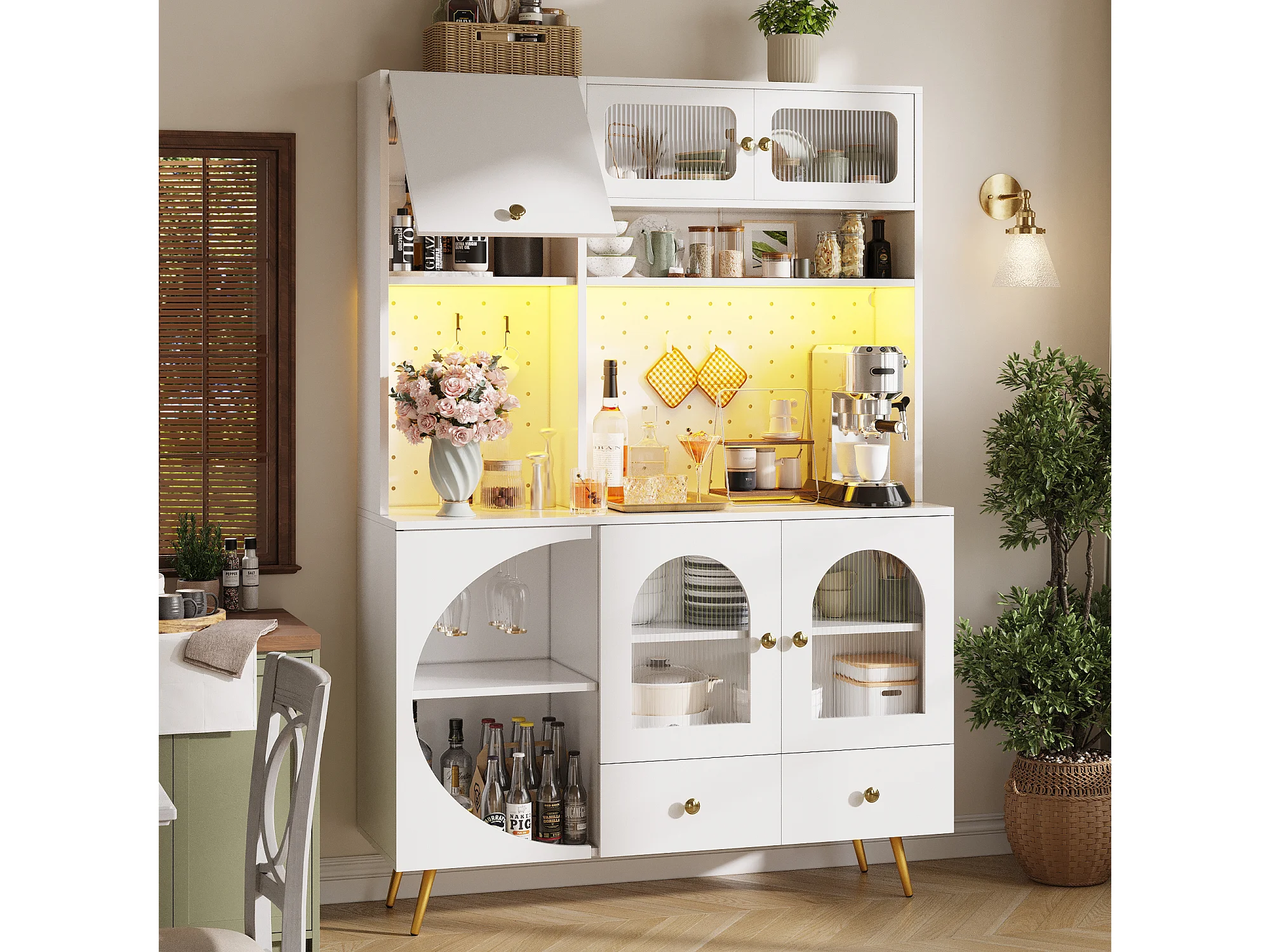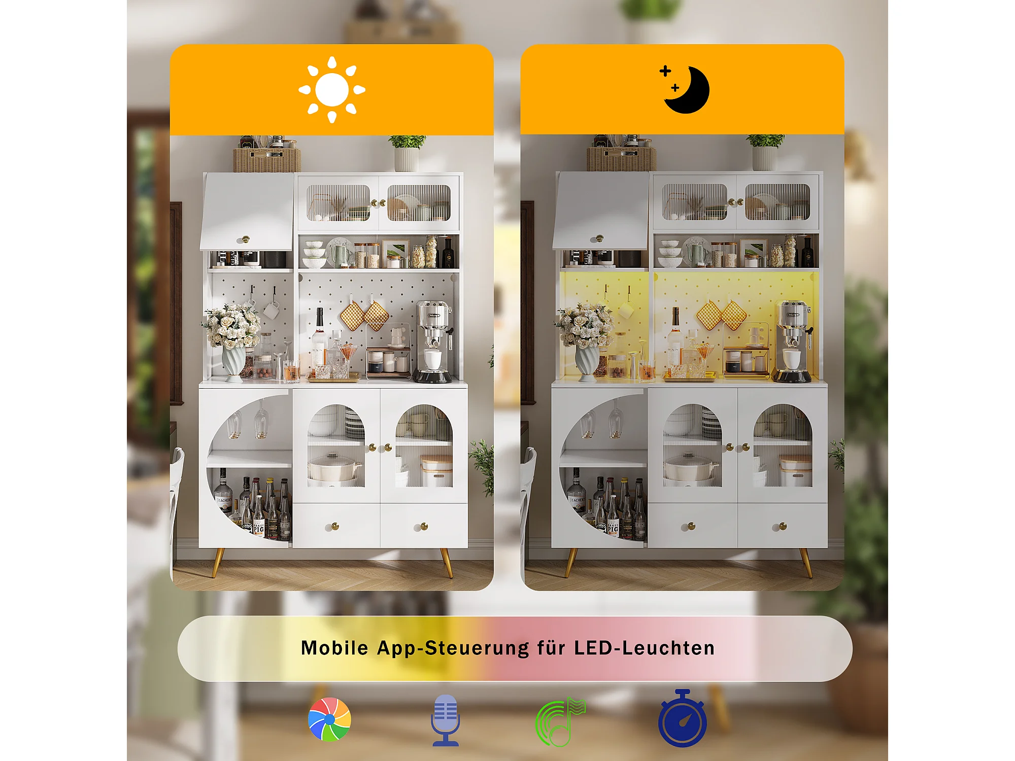 Buffet haut de cuisine moderne - 120 x 40 x 176 cm - avec Leds + USB + portes + tiroir + étagères en verre - MDF + verre - blanc