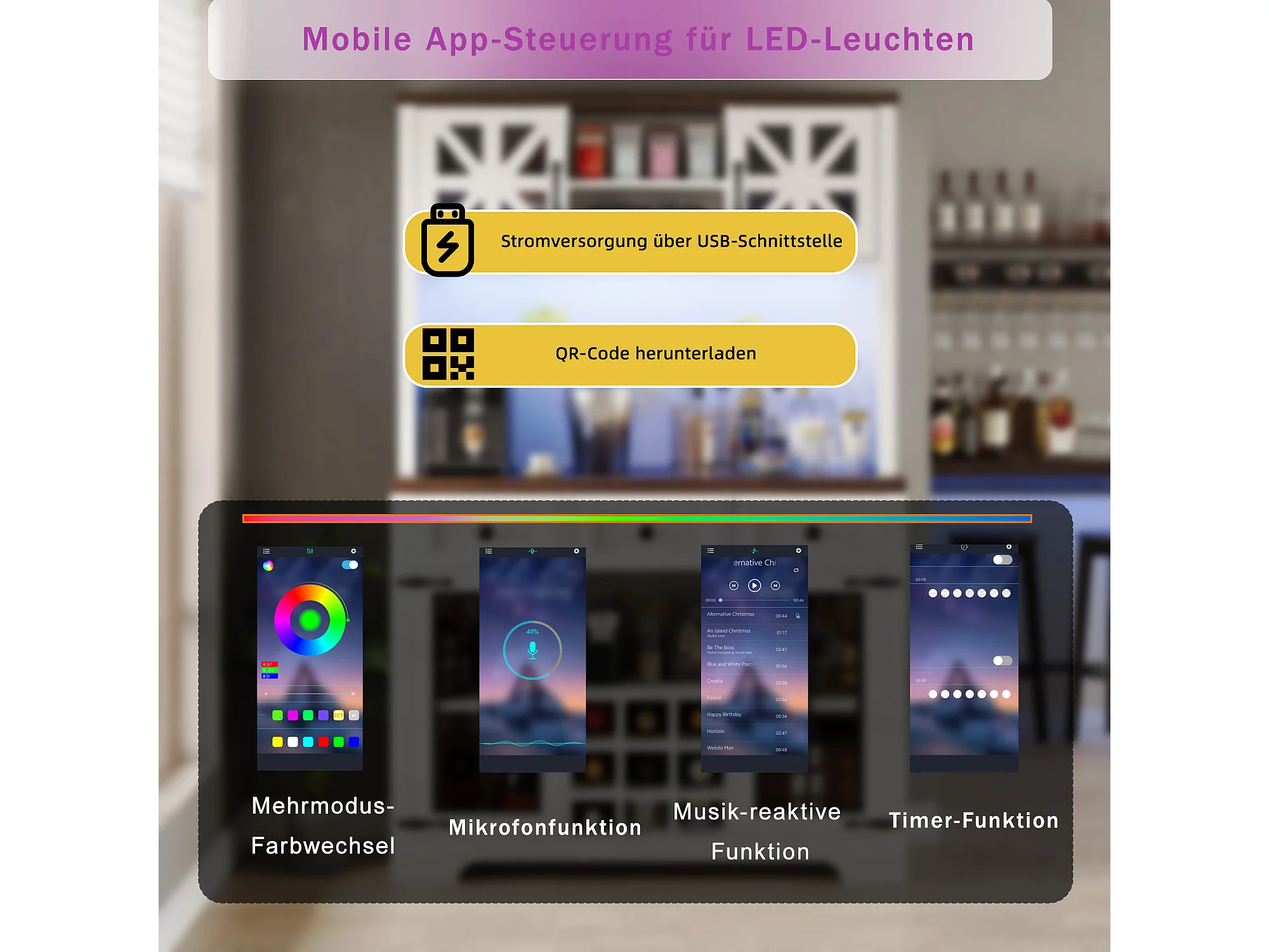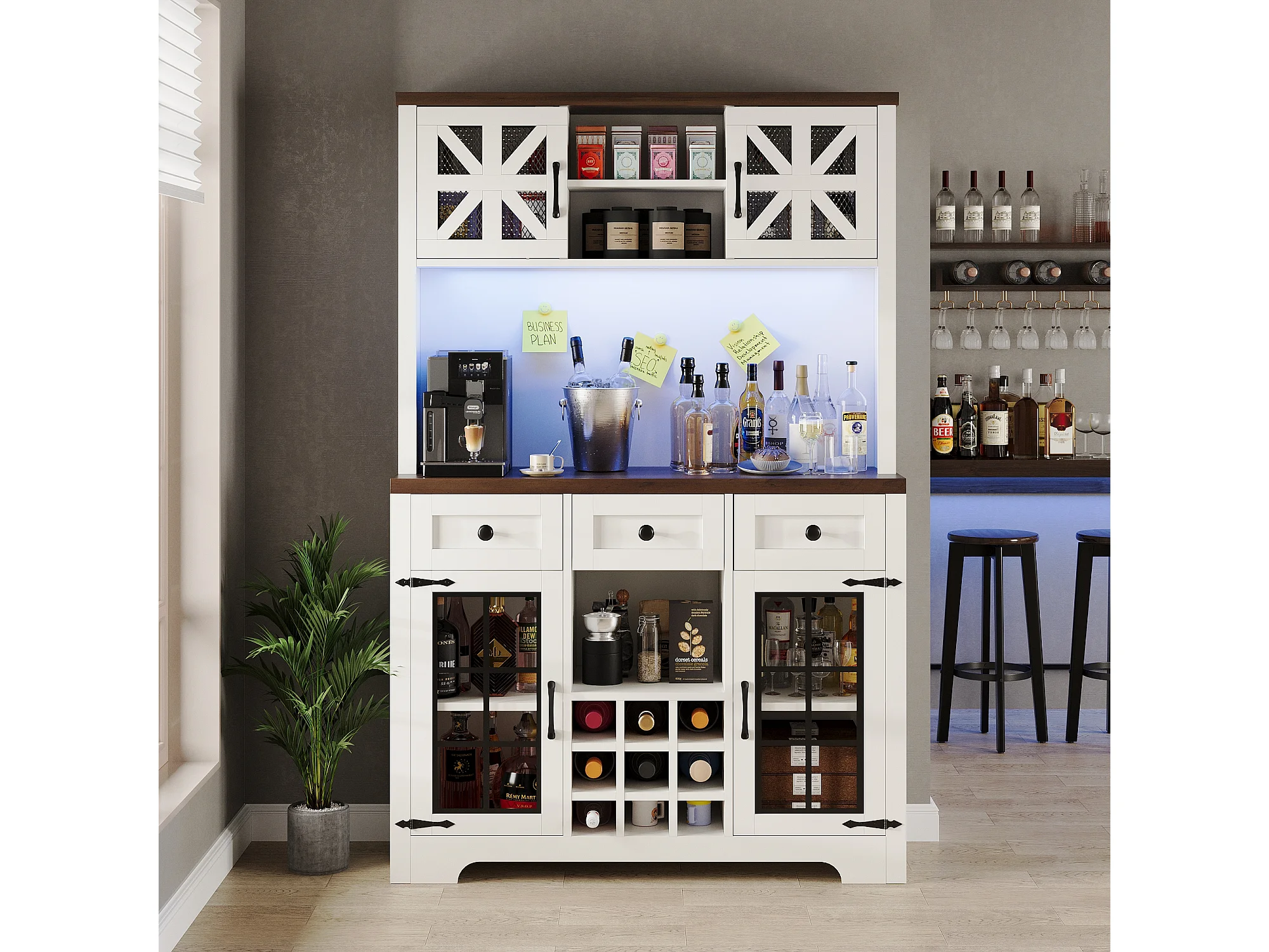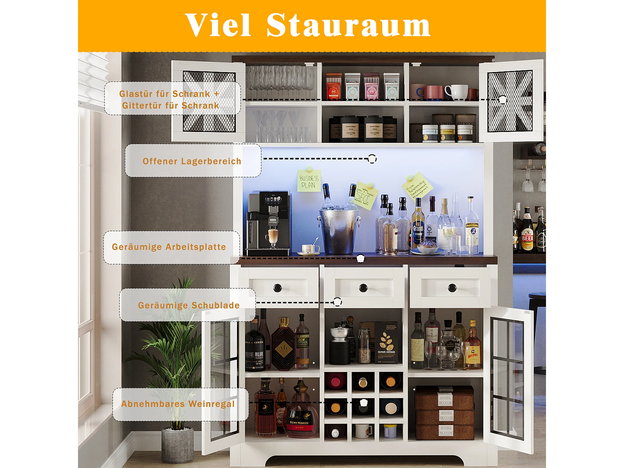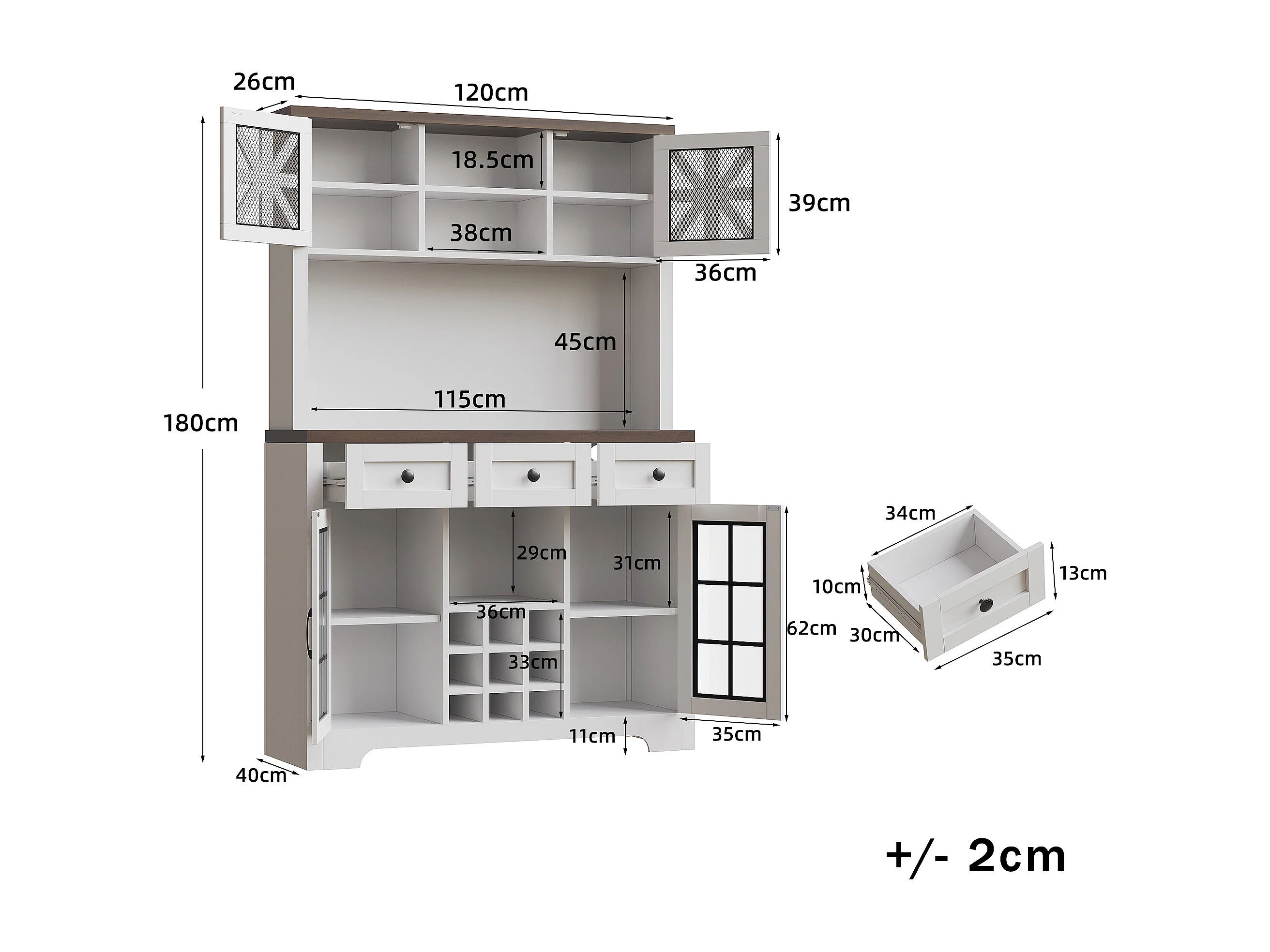 Buffet haut de cuisine moderne - 120 x 40 x 180 cm - avec 4 portes en verre + 3 tiroirs + étagères + Leds - MDF + verre - blanc