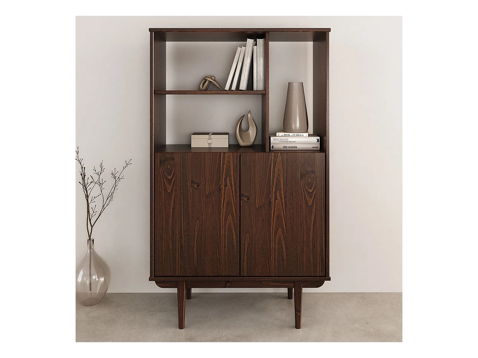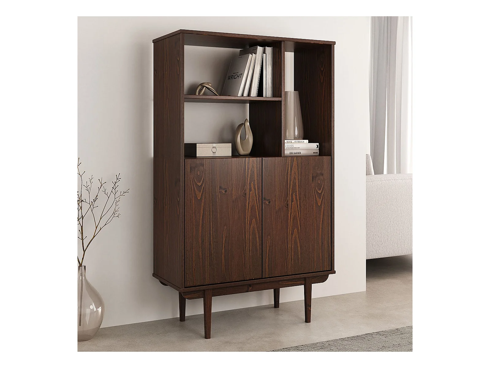 Buffet haut SIMONA 80x133 cm en Bois massif coloris noyer avec 2 Portes et Étagères, Vaisselier en hauteur