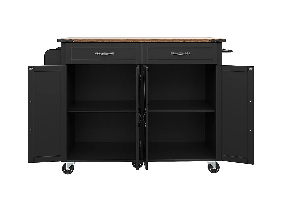 Buffet îlot de cuisine noir avec plan de travail coulissant veinure bois 4 portes 2 tiroirs meuble de rangement multifonction moderne