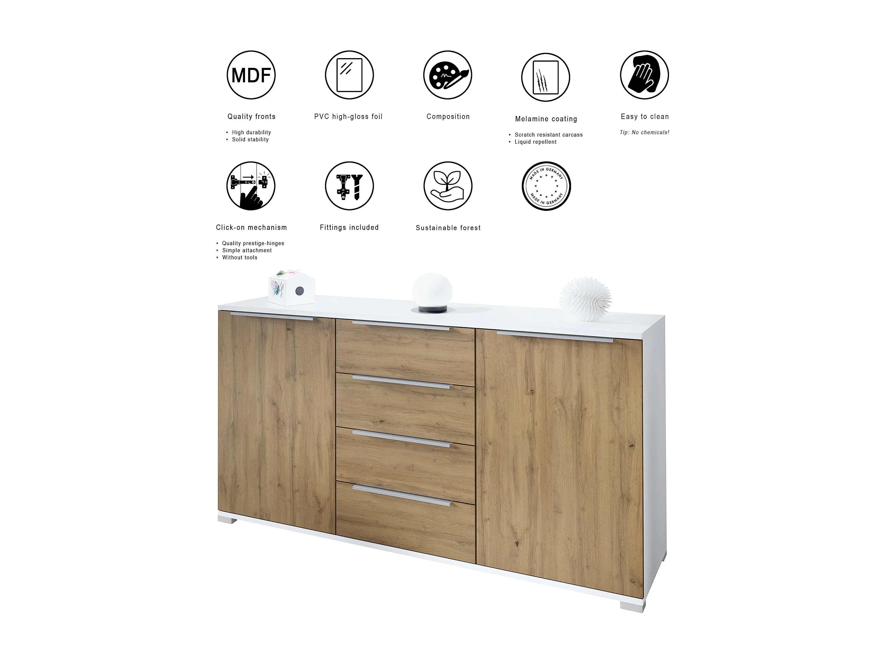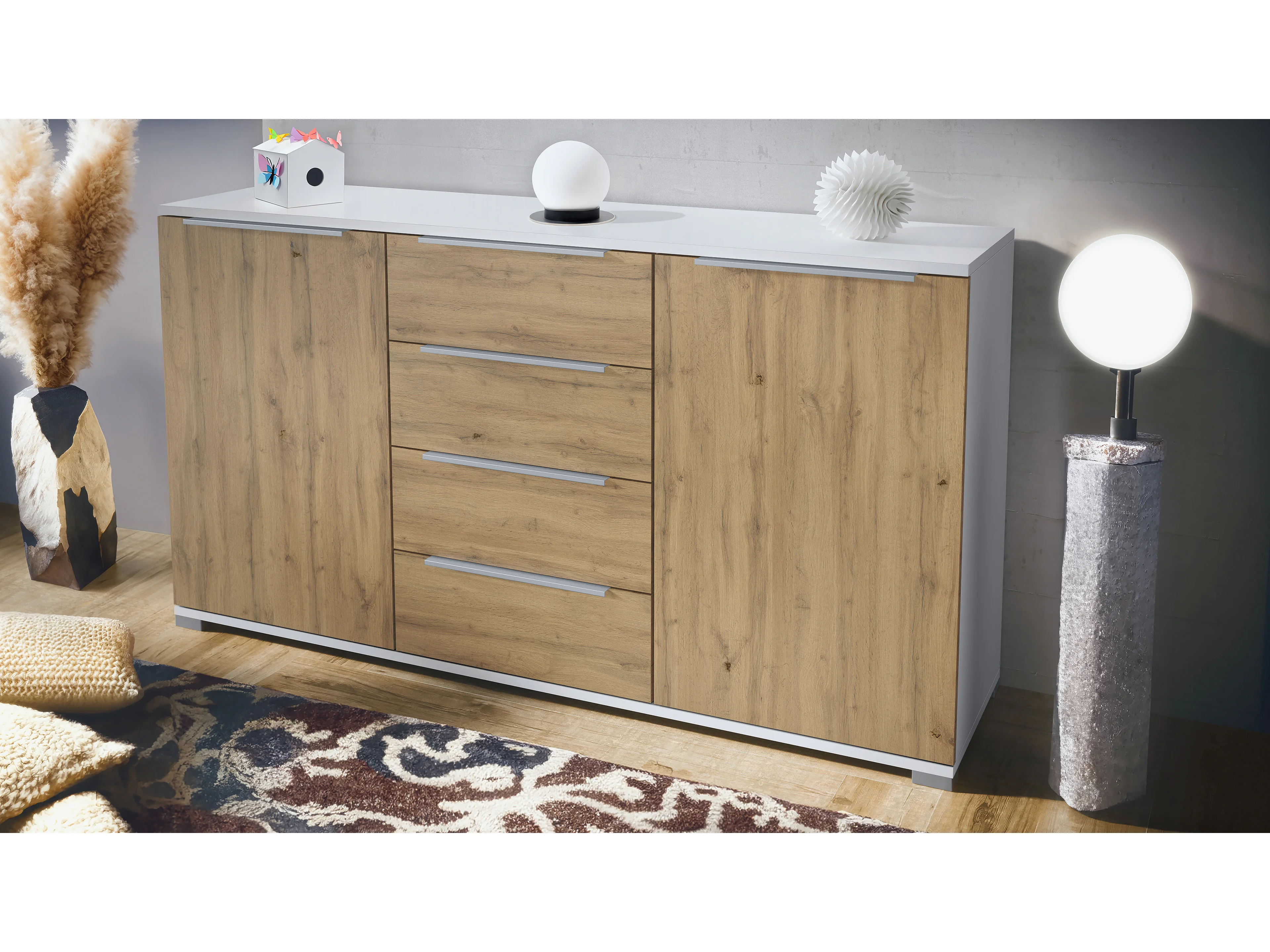 Buffet Linio V1, Enfilade avec 2 portes et 4 tiroirs, blanc mat / Chêne Evoke (138,5 x 75,5 x 35 cm)