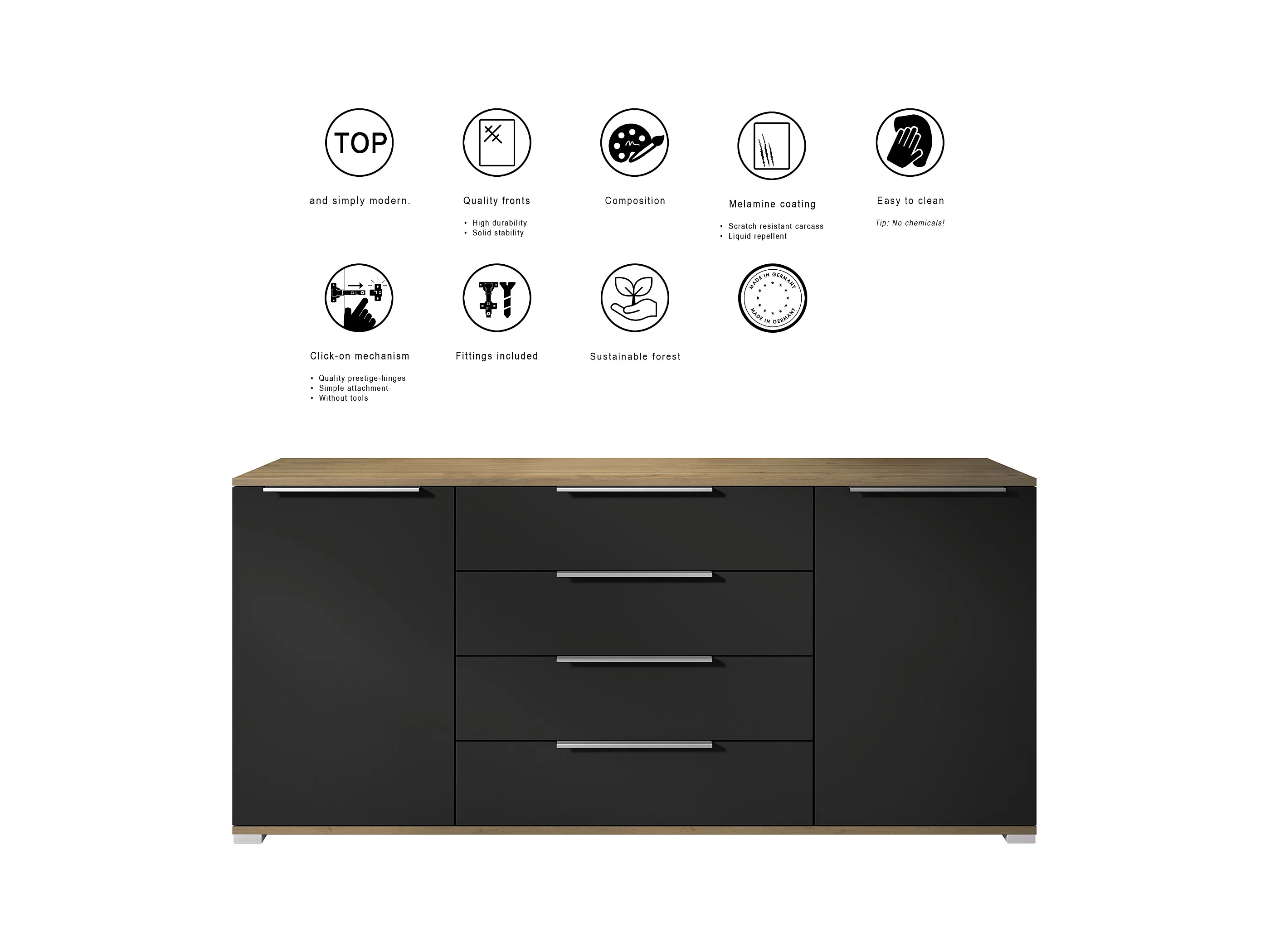 Buffet Linio V2 – Commode moderne avec 2 portes et 4 tiroirs, Chêne Evoke/blanc haute brillance, 166,5 x 75,5 x 35 cm (L x H x P) – Meuble de rangement bahut