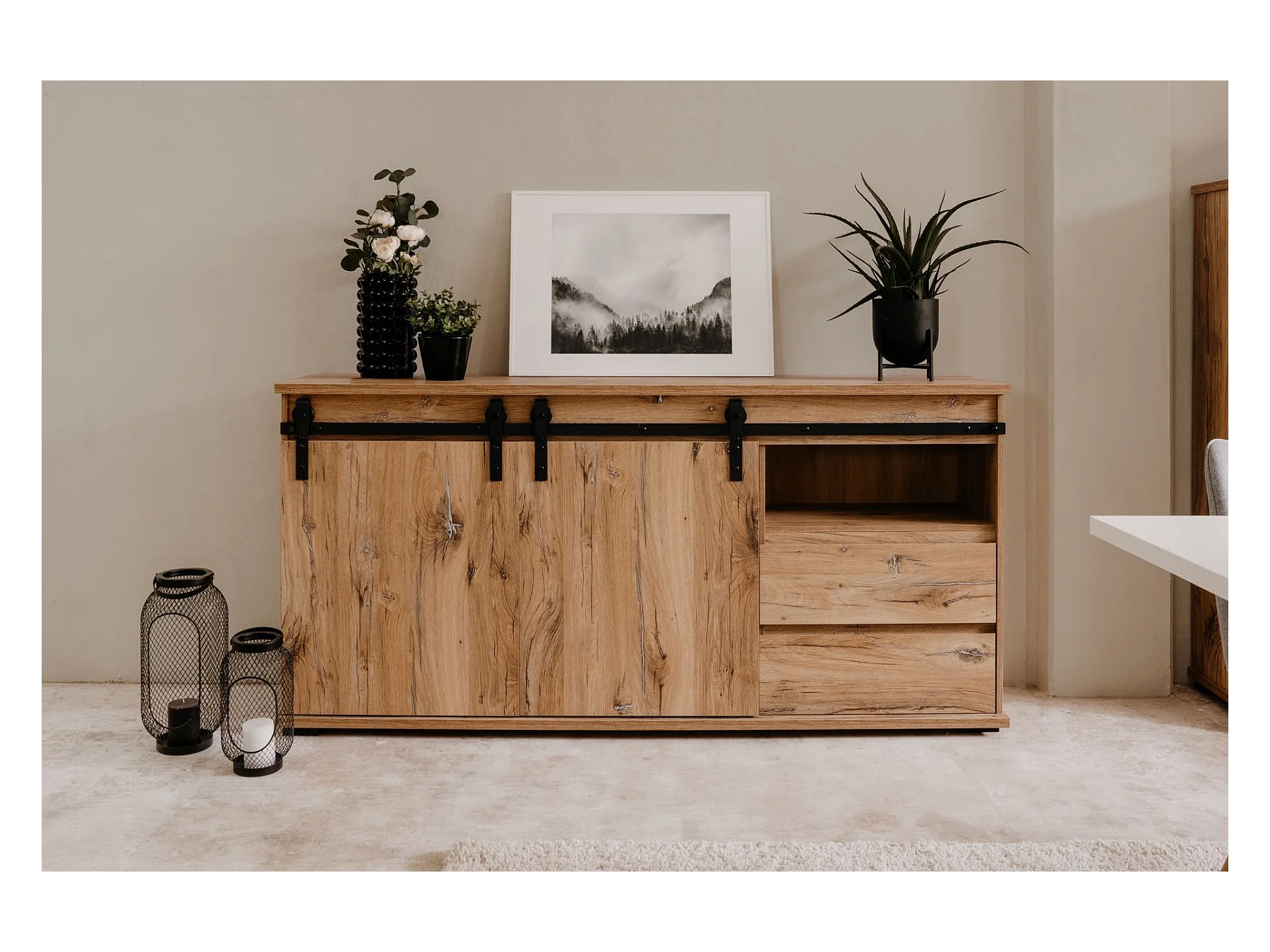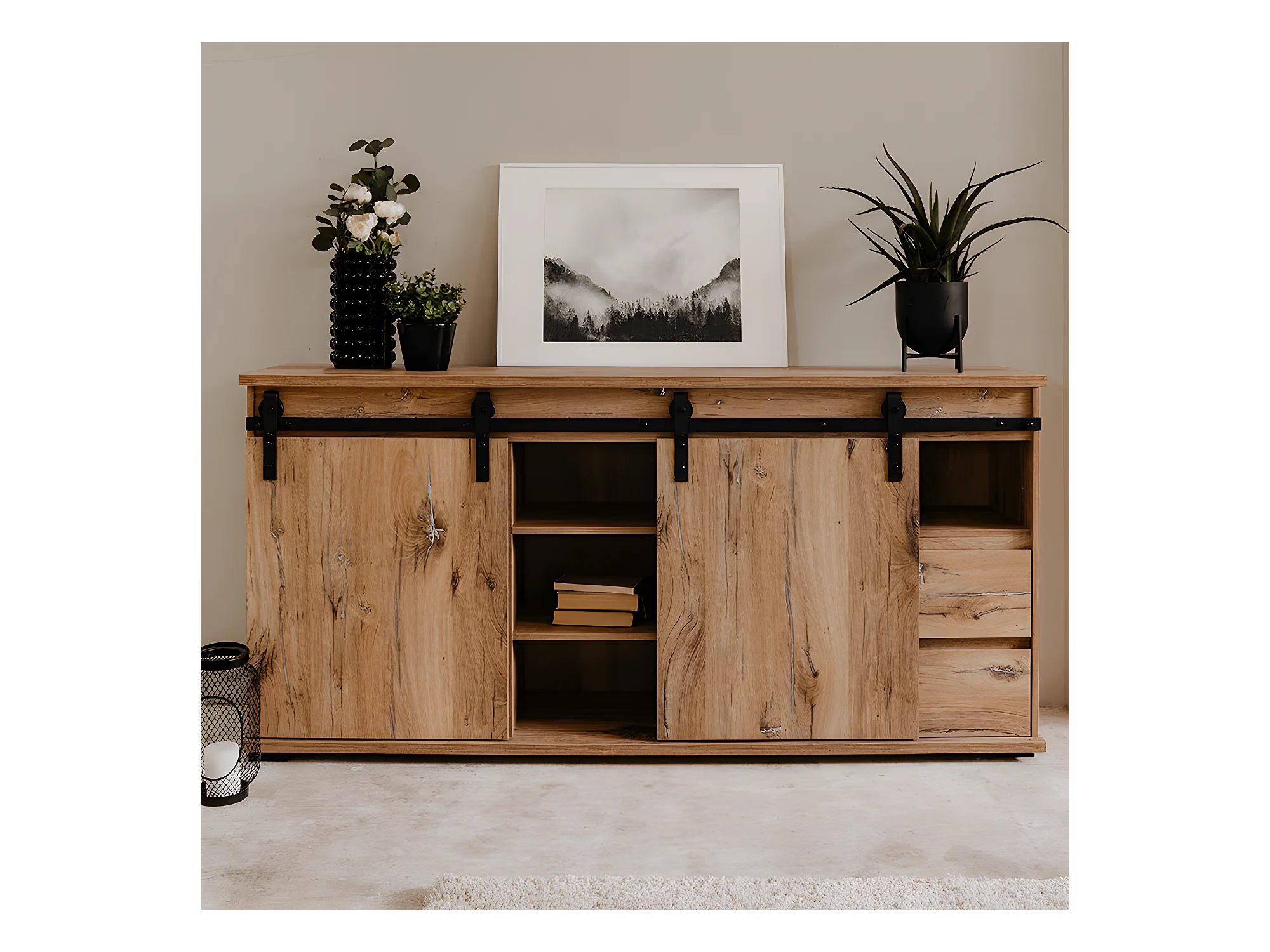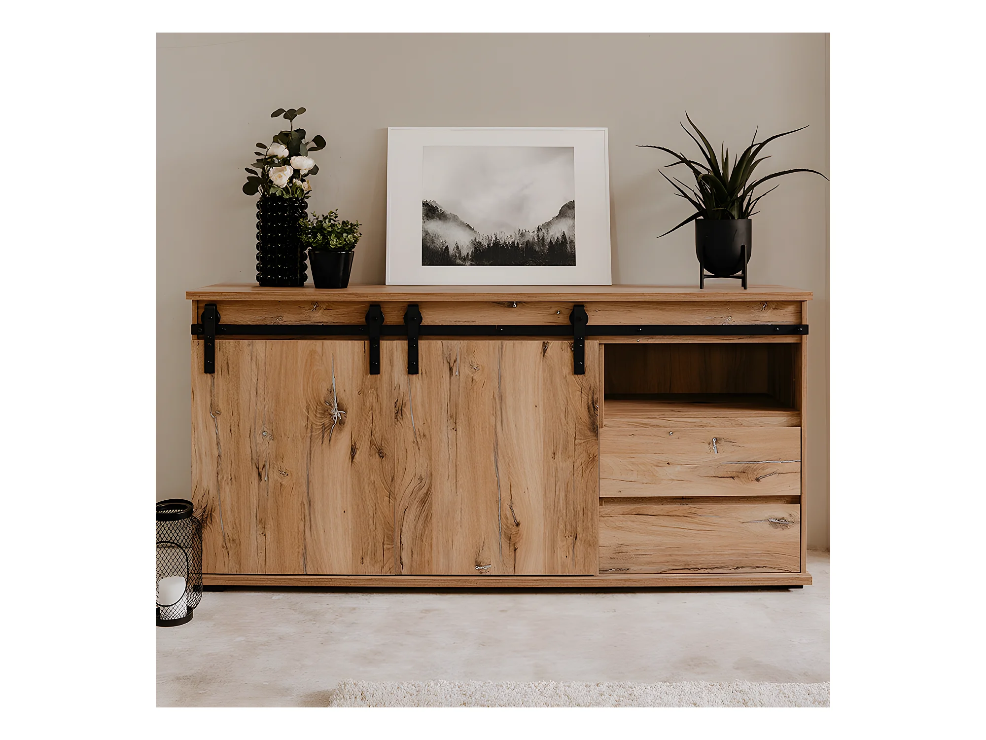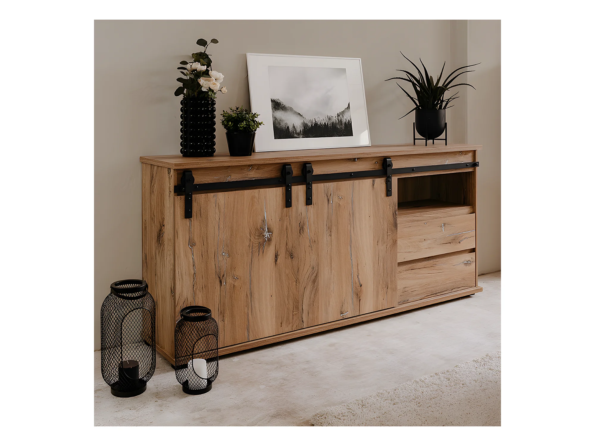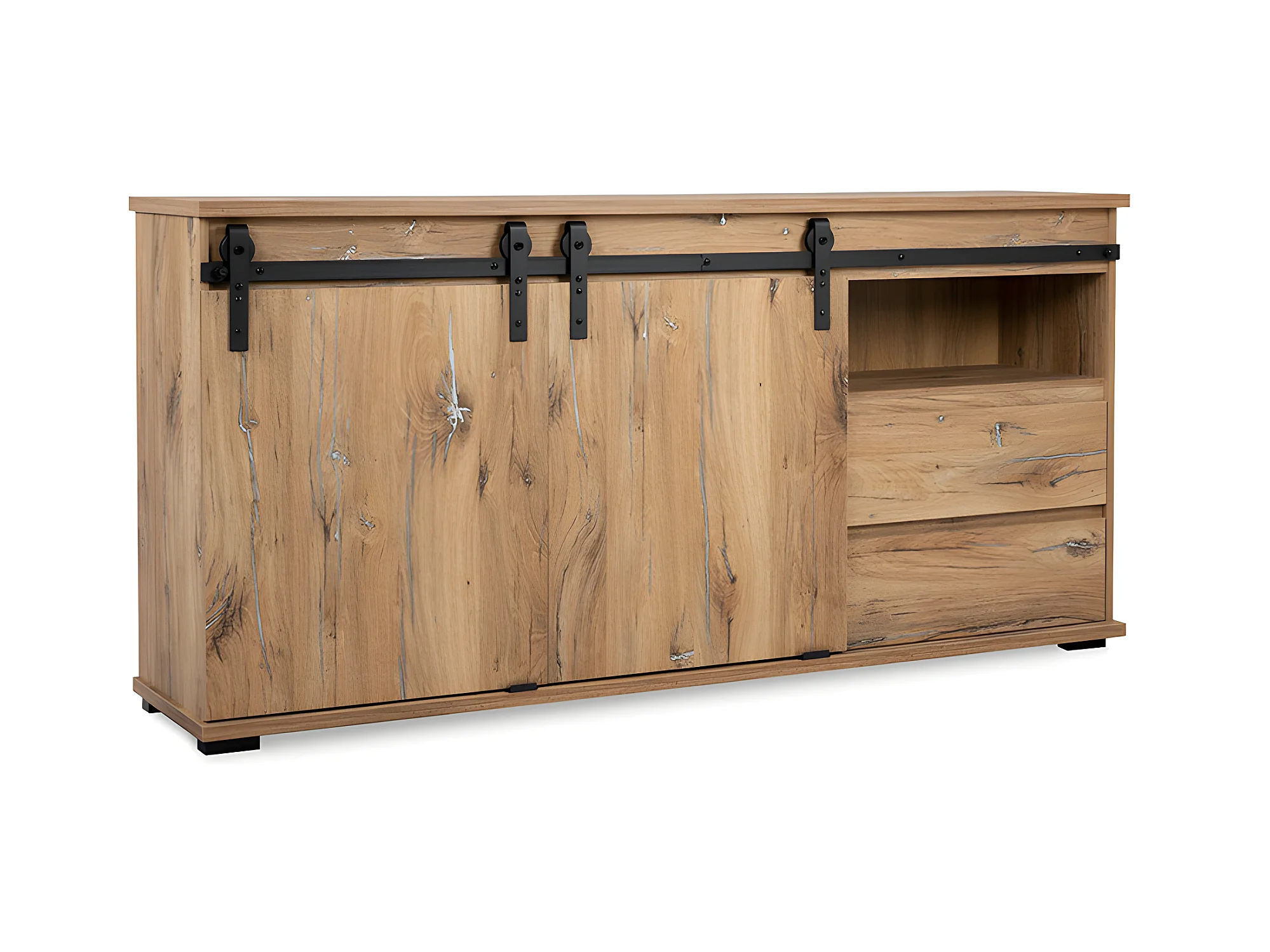 Buffet Manzano - Panneaux de particules - Chene Flagstaff - 2 portes coulissantes, 2 tiroirs, 1 niche - L 180 x H 87 x l 40 cm