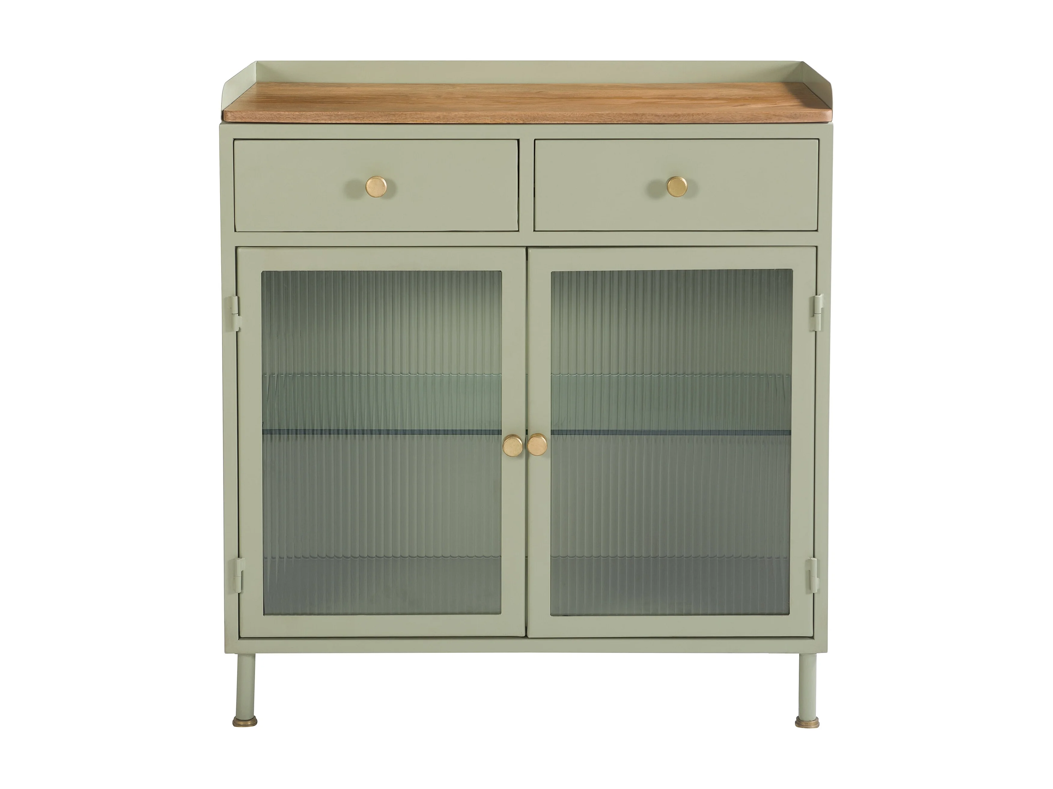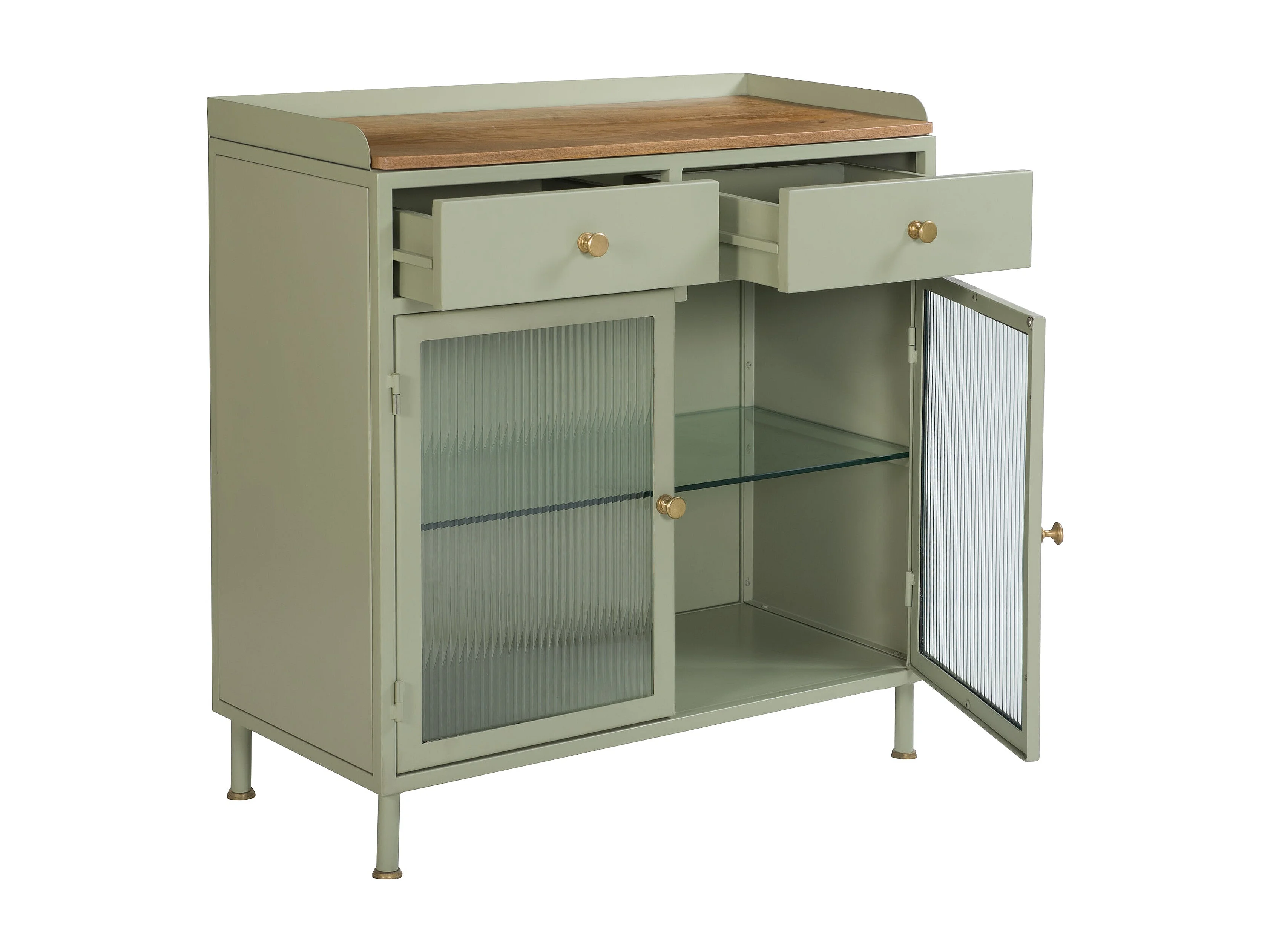 Buffet 2 portes 2 tiroirs en métal vert, manguier et verre - Marnie