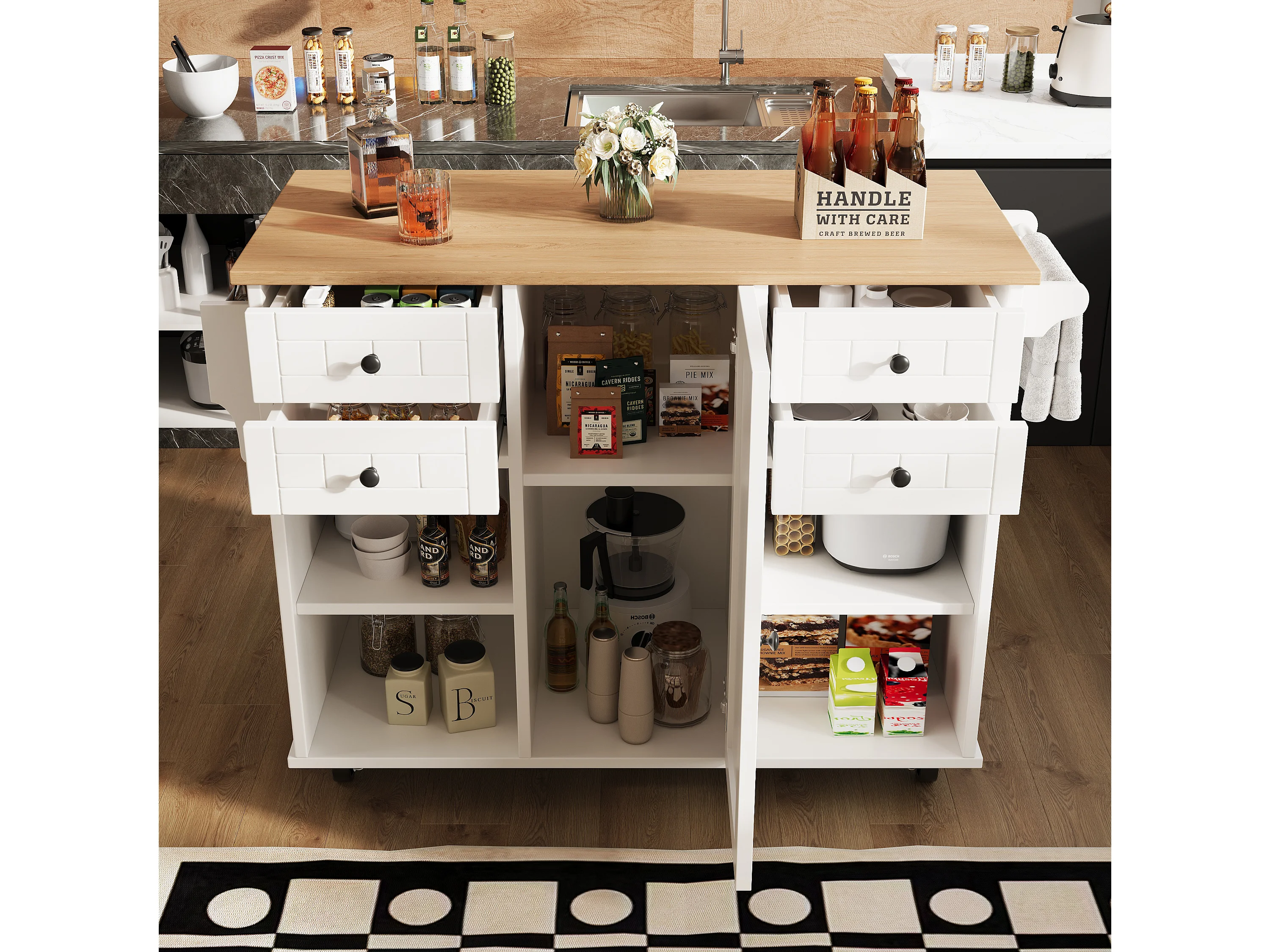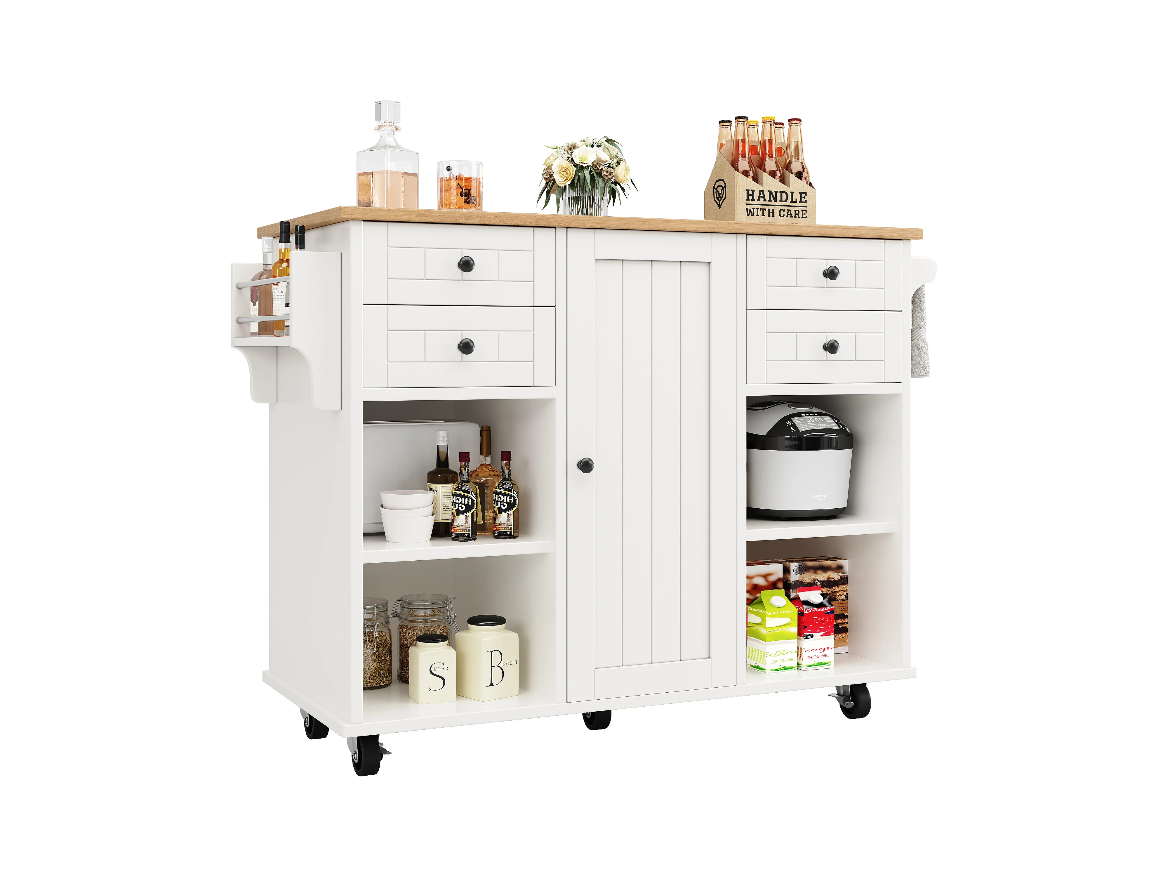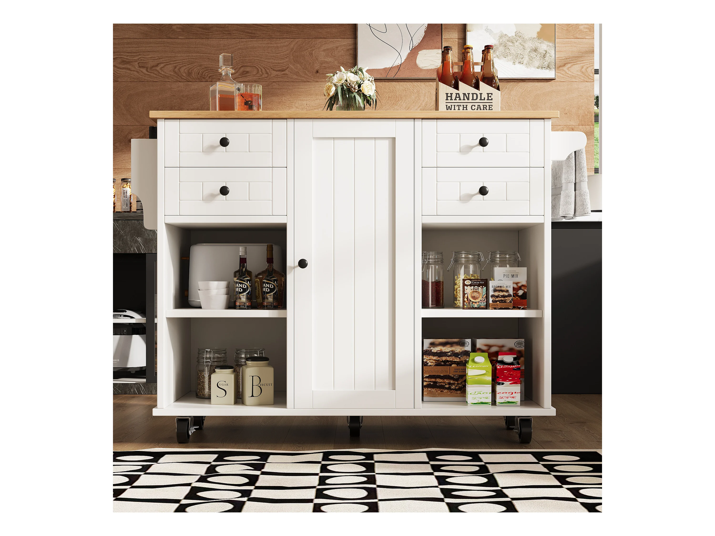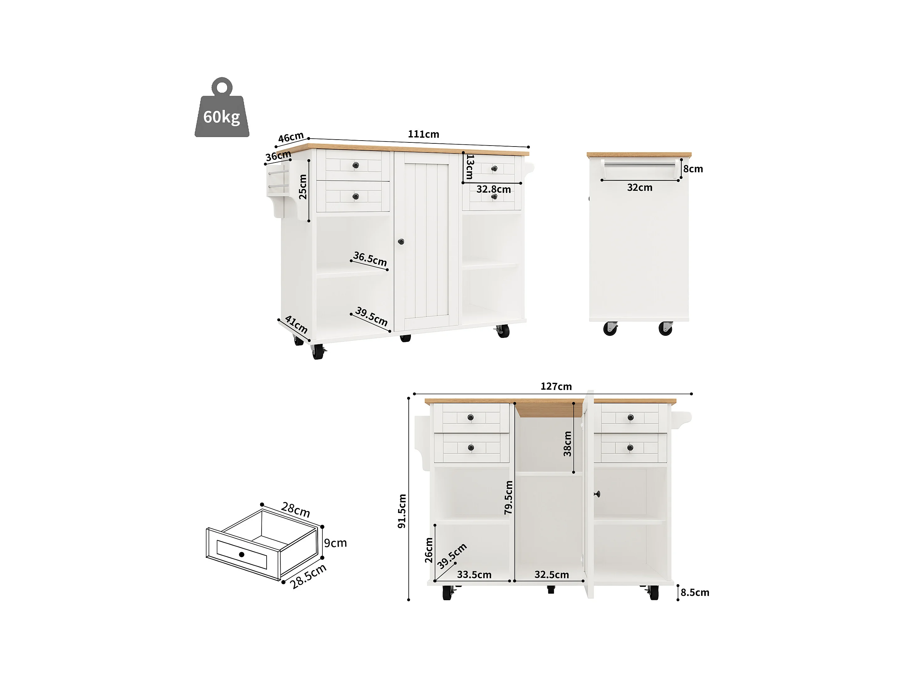 Ilot central de cuisine mobile avec 1 porte et 4 tiroirs - 111x46x91.5 cm - Bois MDF - Blanc et naturel