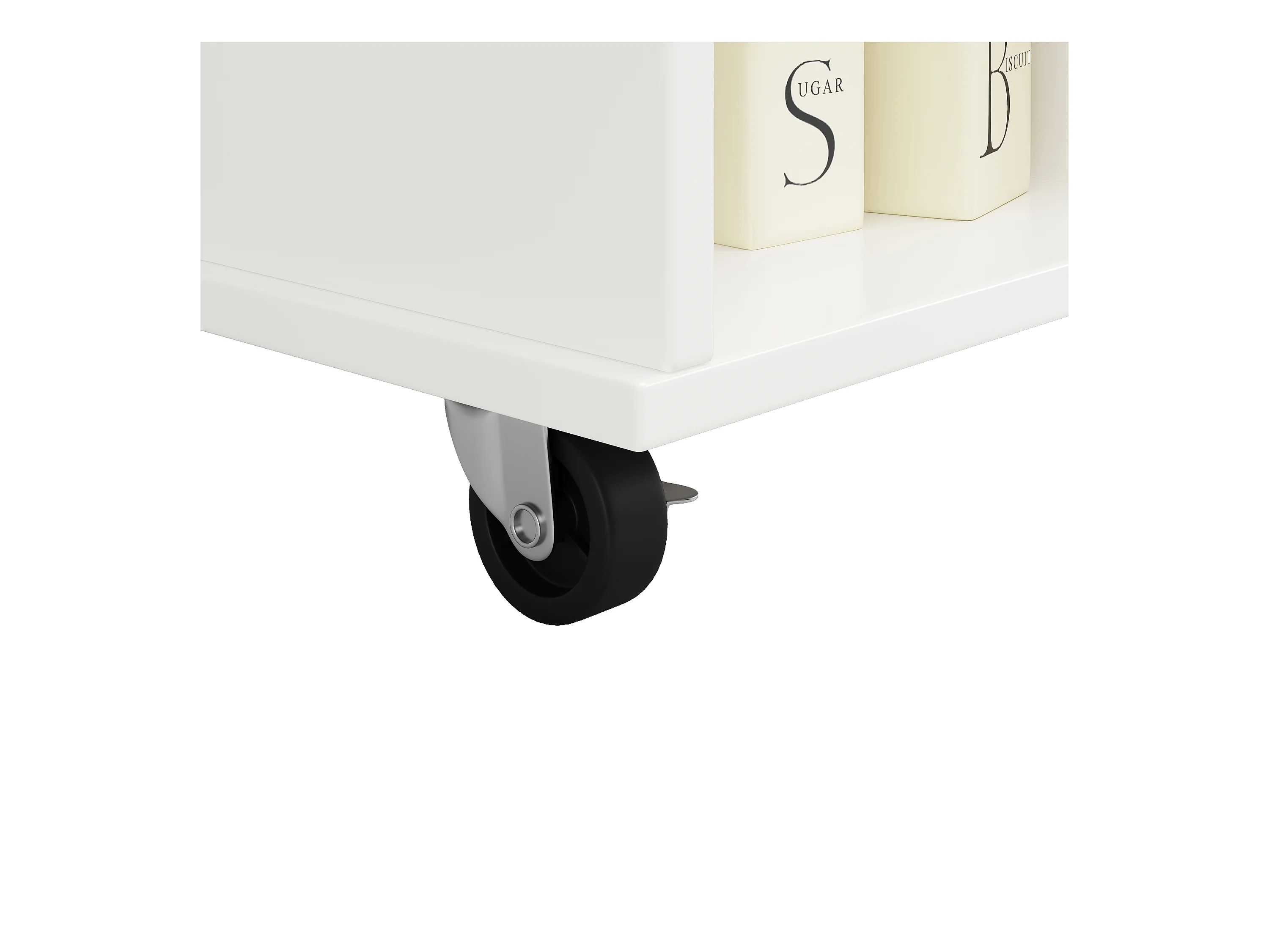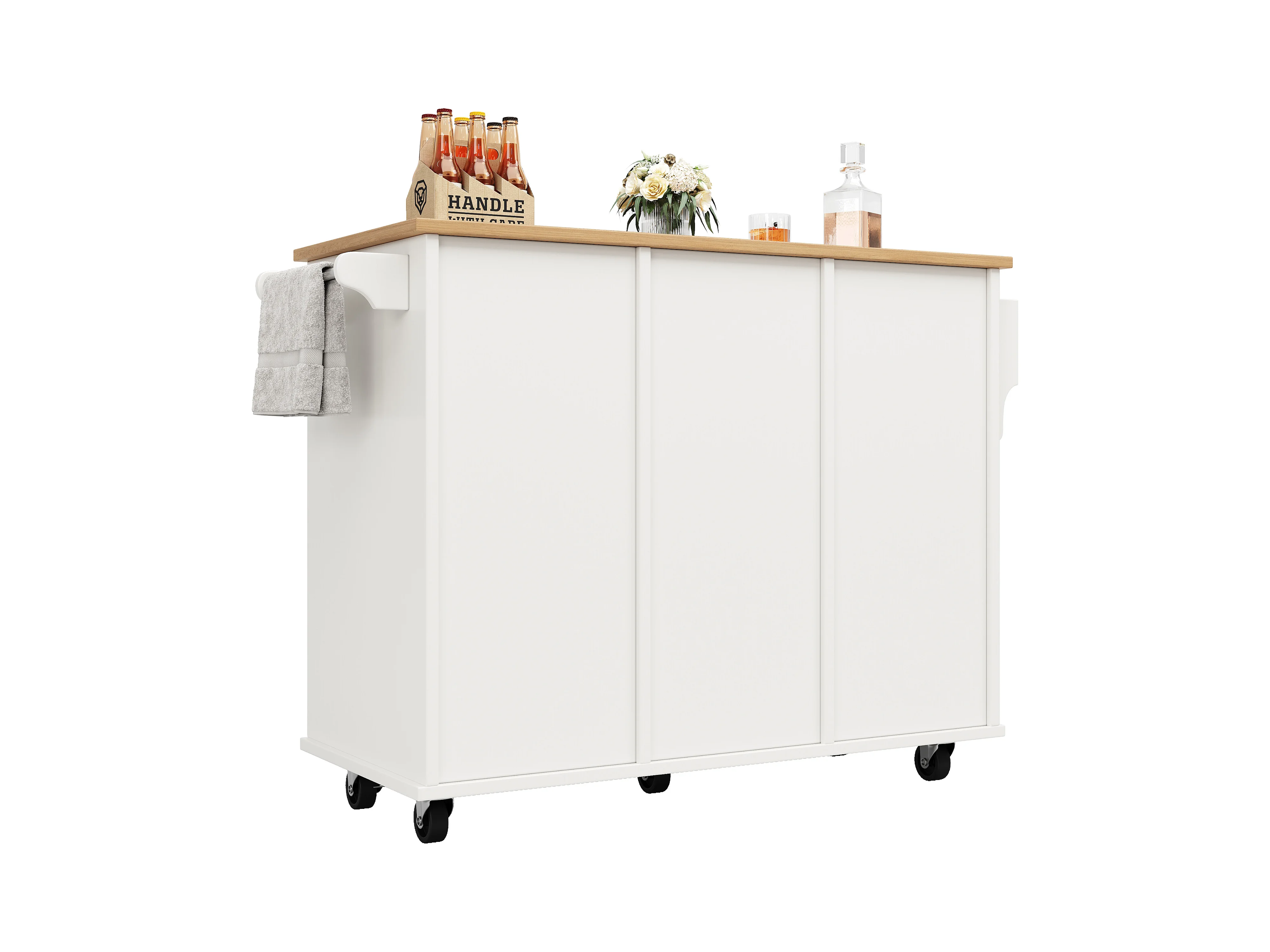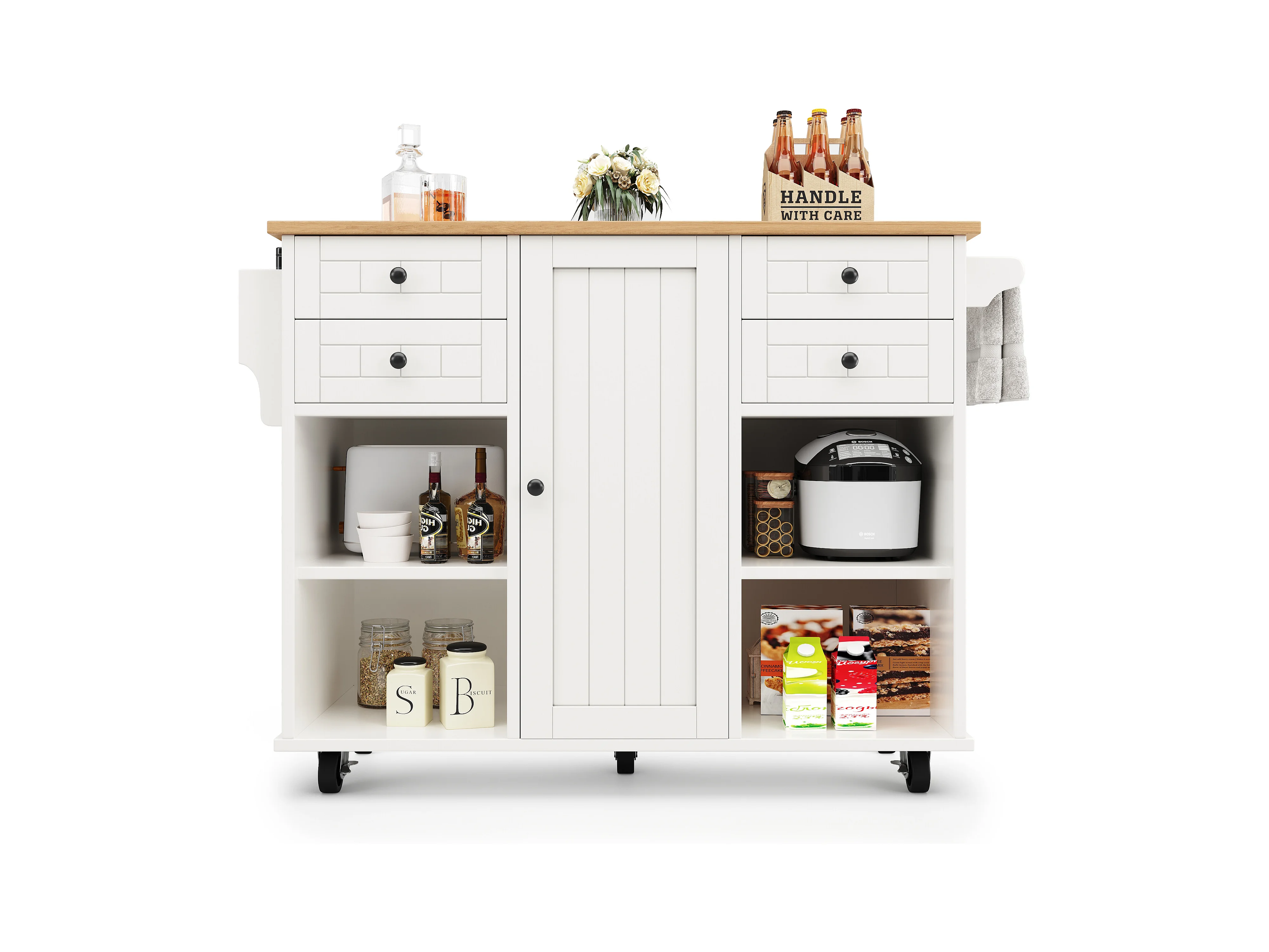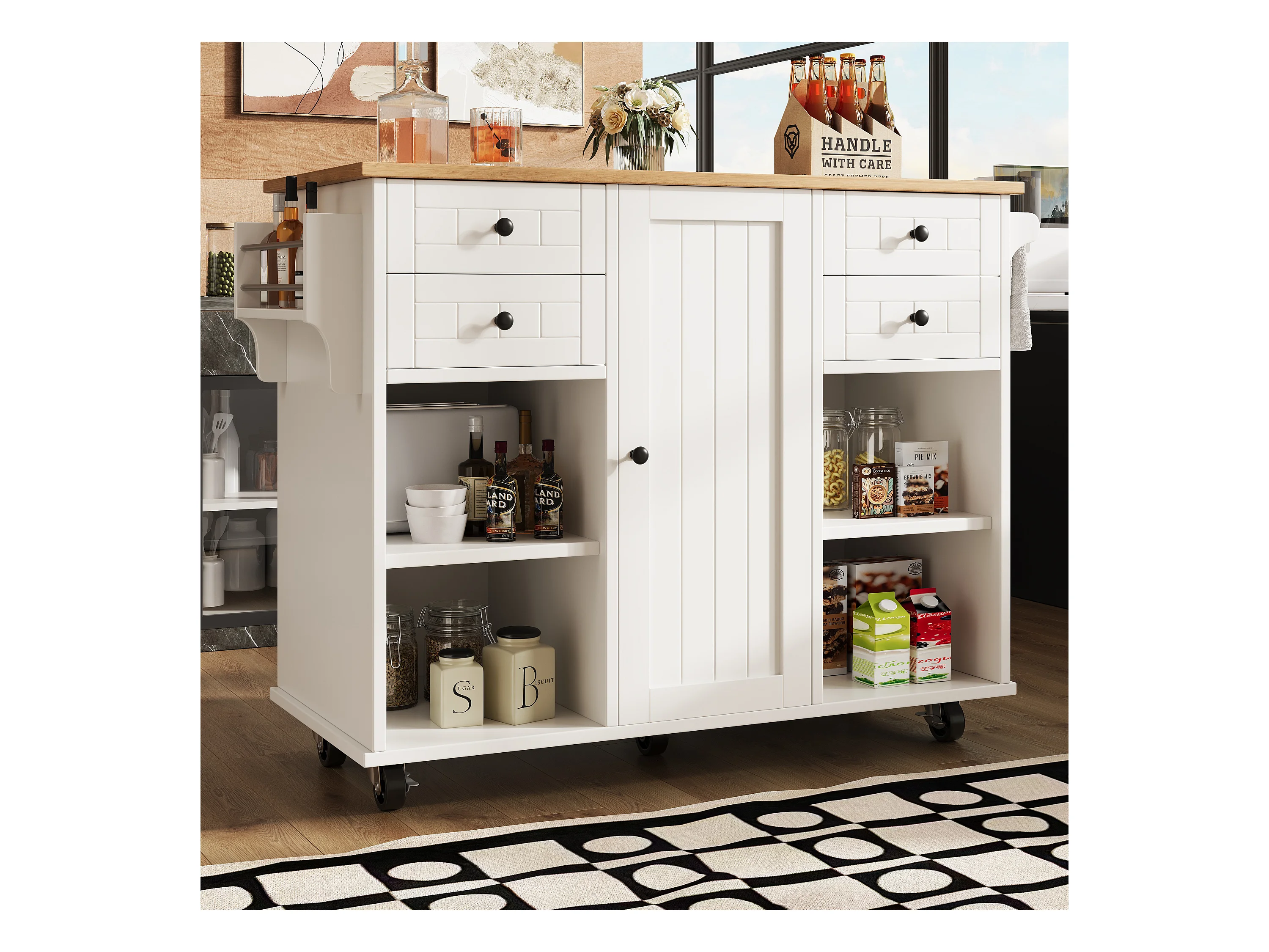 Ilot central de cuisine mobile avec 1 porte et 4 tiroirs - 111x46x91.5 cm - Bois MDF - Blanc et naturel