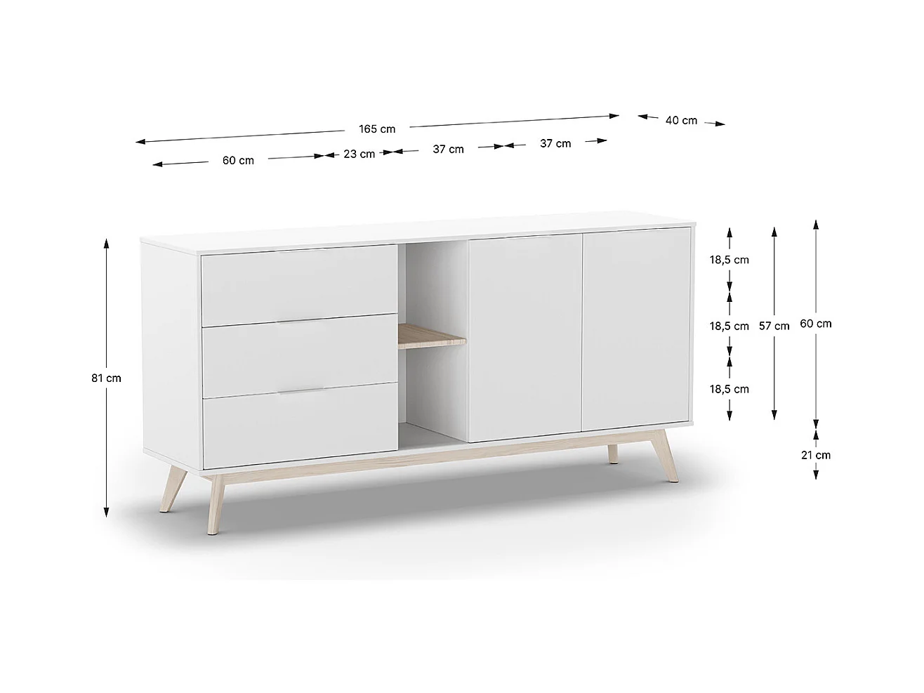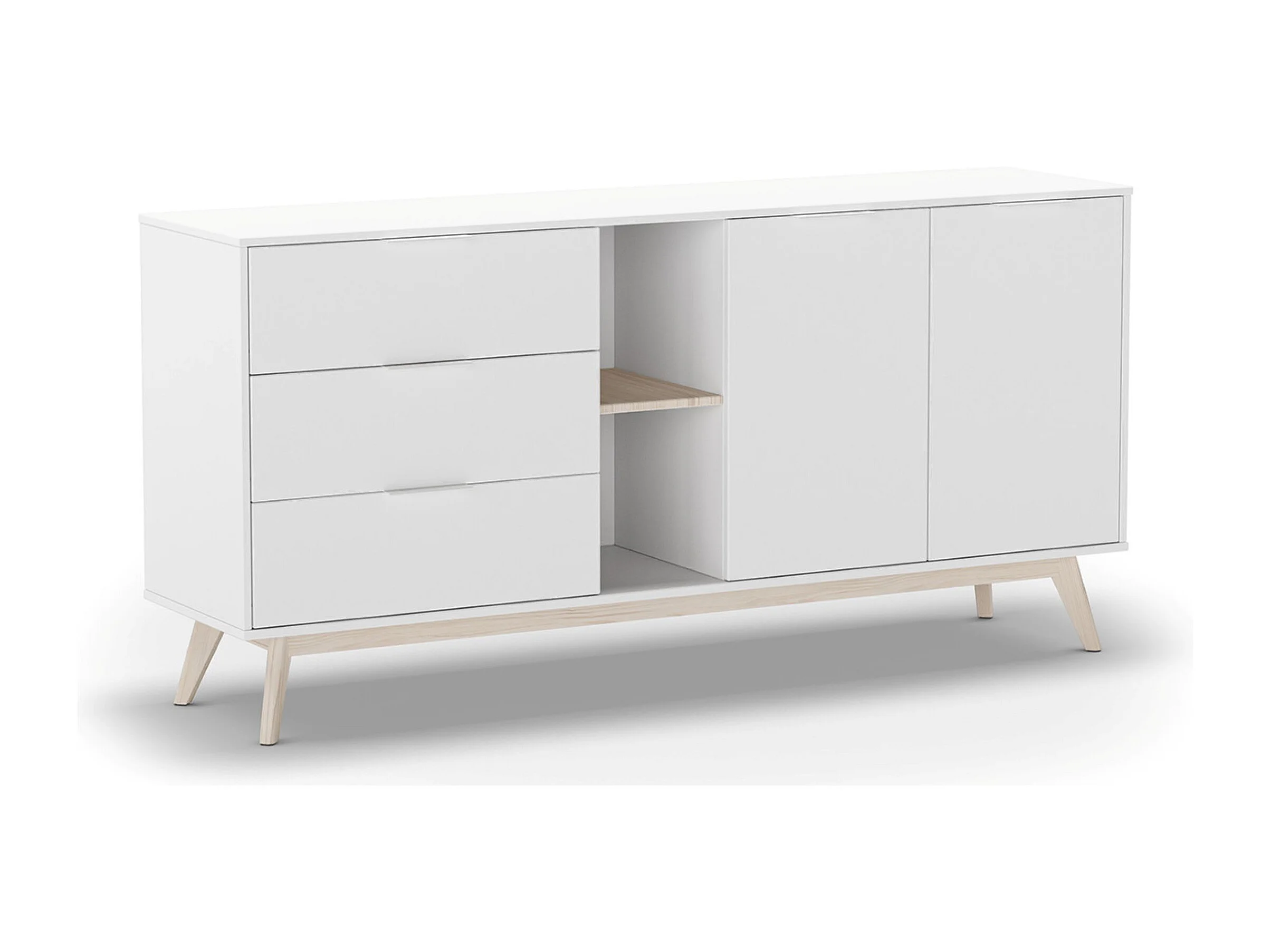 Buffet, meuble de rangement avec 2 portes, 2 niches et 3 tiroirs en pin coloris blanc/naturel -Longueur 165 x Profondeur 40 x Hauteur 81 cm