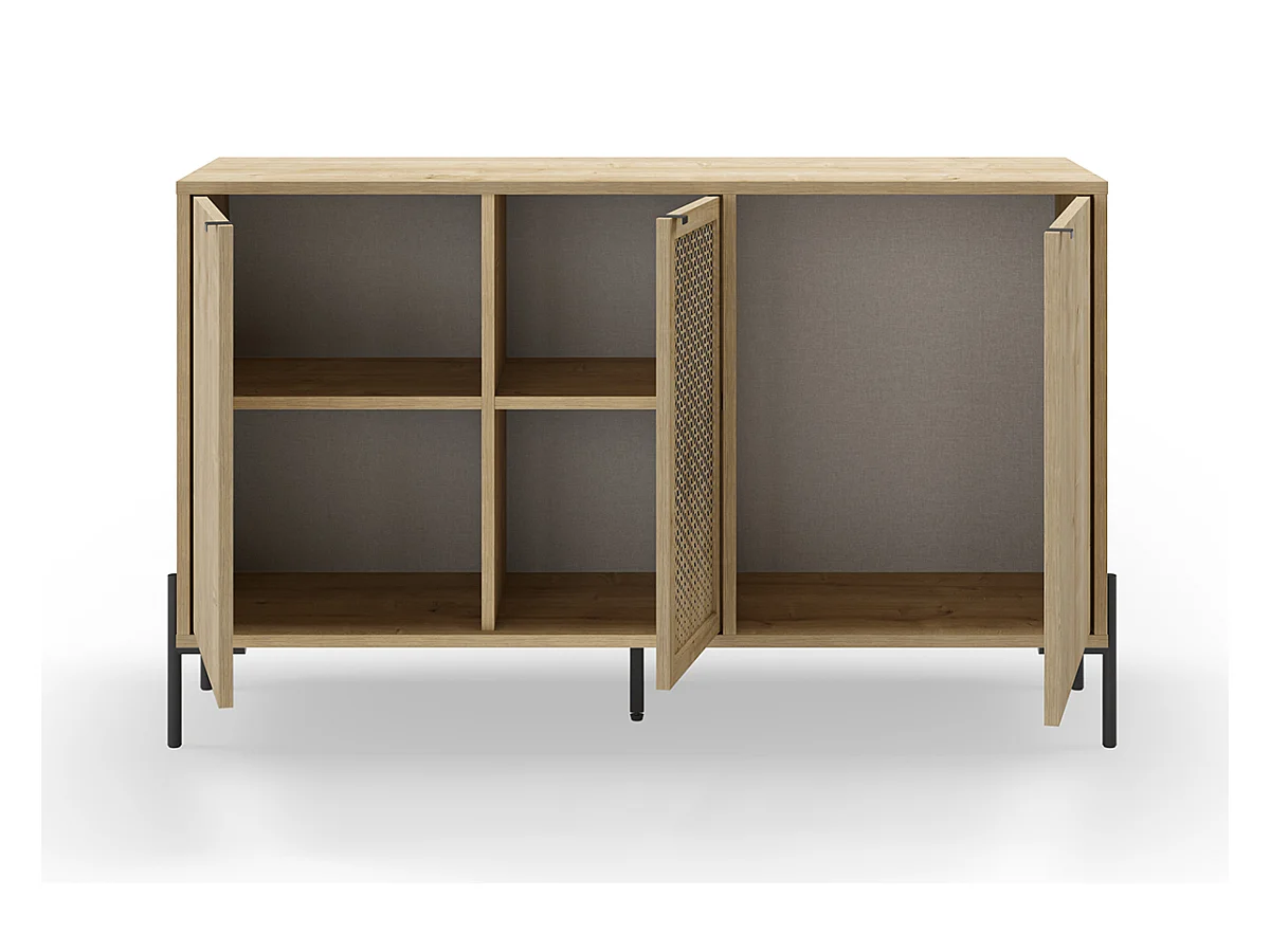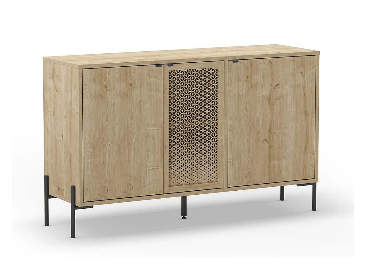 Buffet, meuble de rangement avec 3 portes aspect bois coloris chêne et pieds en métal noir - Longueur 125,60 x Profondeur 40 x Hauteur 80,50 cm