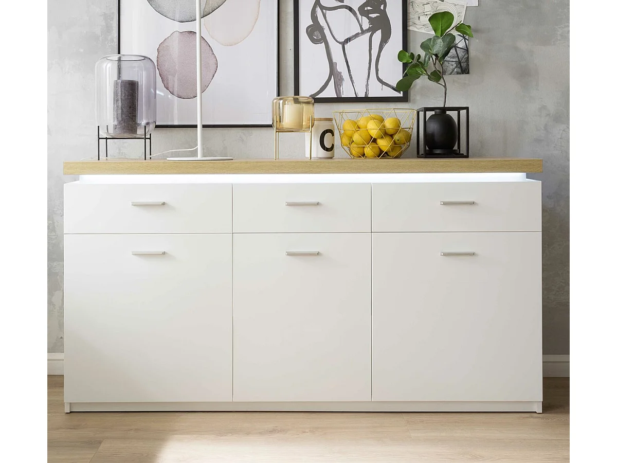 Buffet, meuble de rangement coloris blanc avec plateau finition chêne wotan - Longueur 156 x Hauteur 83 x Profondeur 44 cm