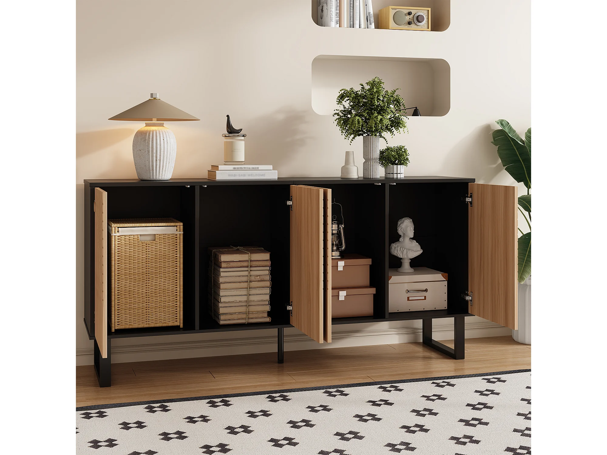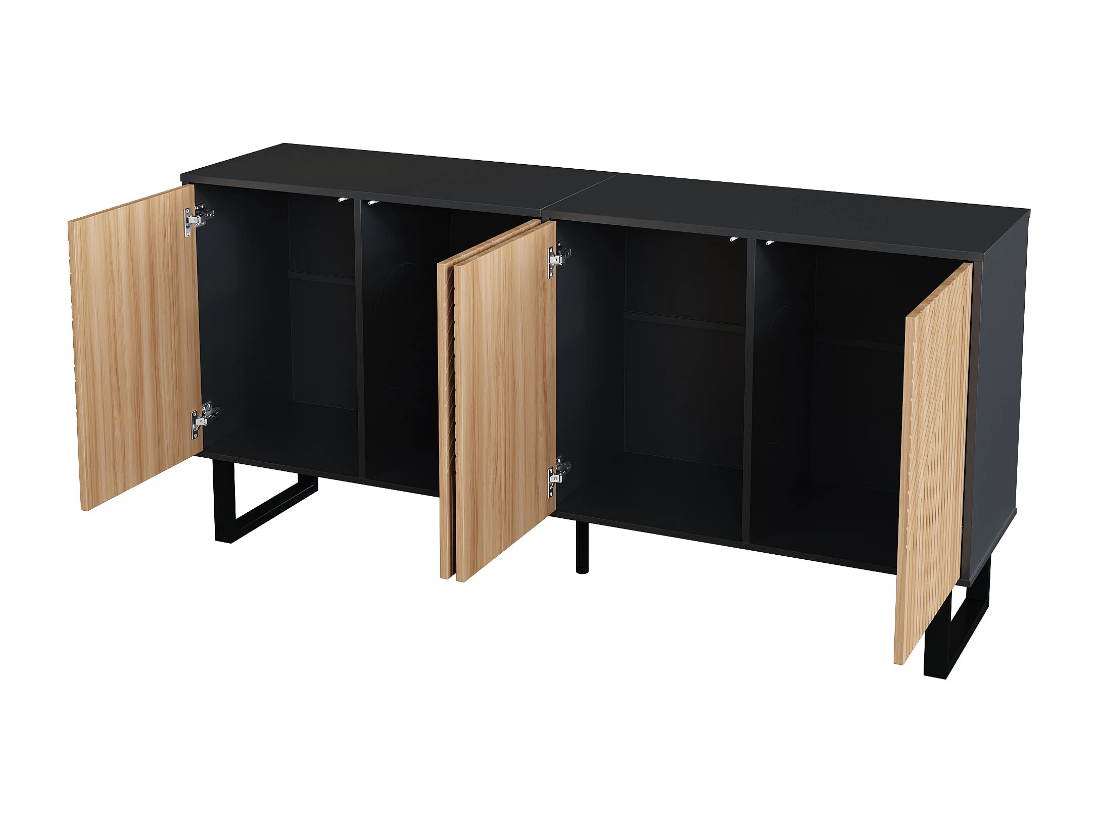 Buffet minimaliste avec 4 portes à rayures - Couleur bois et noir