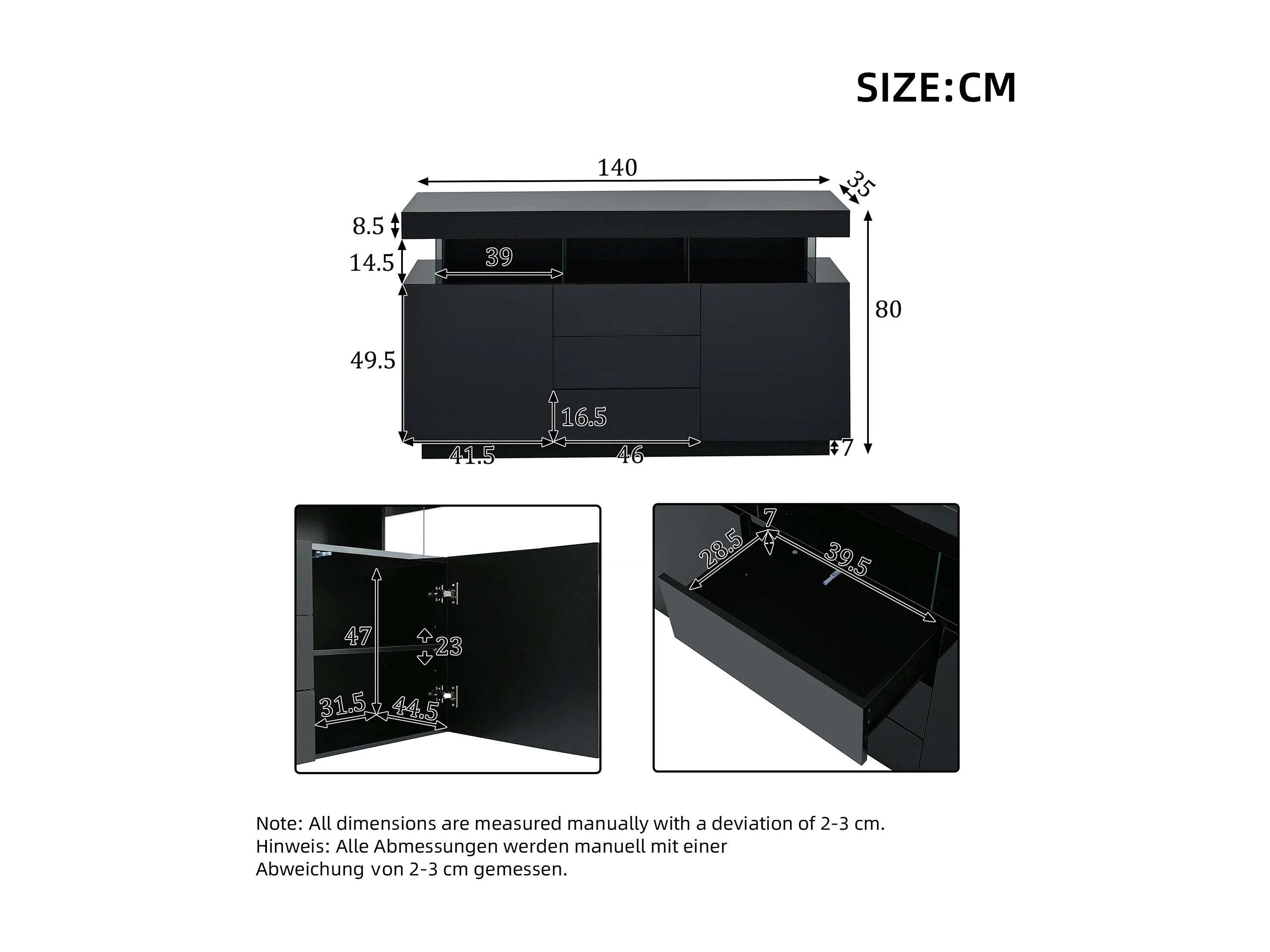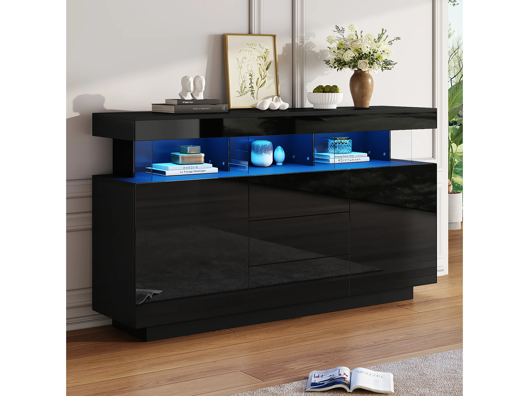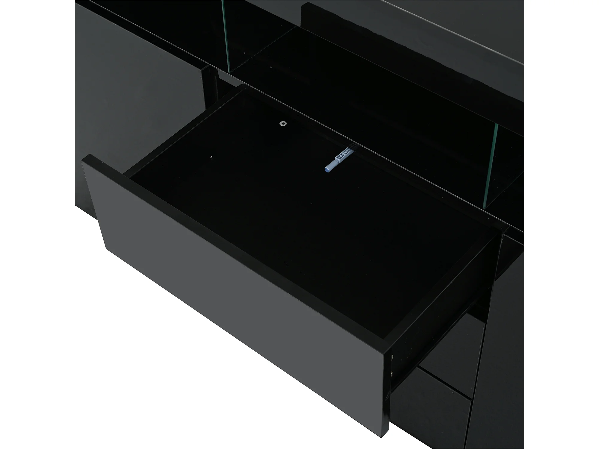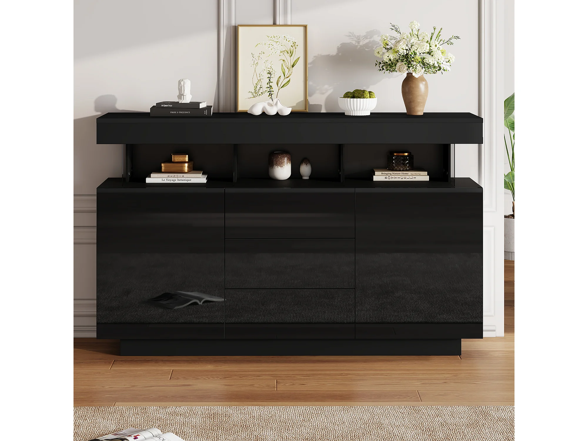 Buffet moderne 140x35x80 cm - 2 portes et 3 tiroirs - Éclairage LED - Étagères ouvertes - Finition brillante - Noir