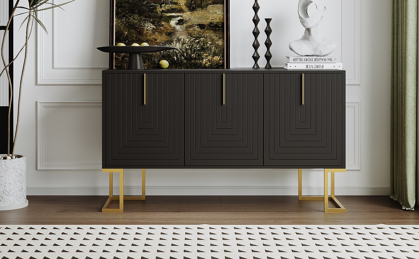 Buffet moderne 3 portes avec étagères réglables, portes en U, poignées et socle en métal – Idéal pour salle à manger et cuisine, Noir