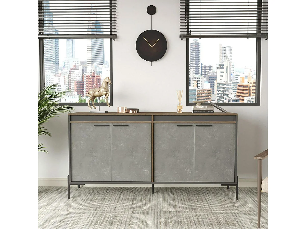 Buffet moderne 4 portes décor bois foncé, béton et gris JENA