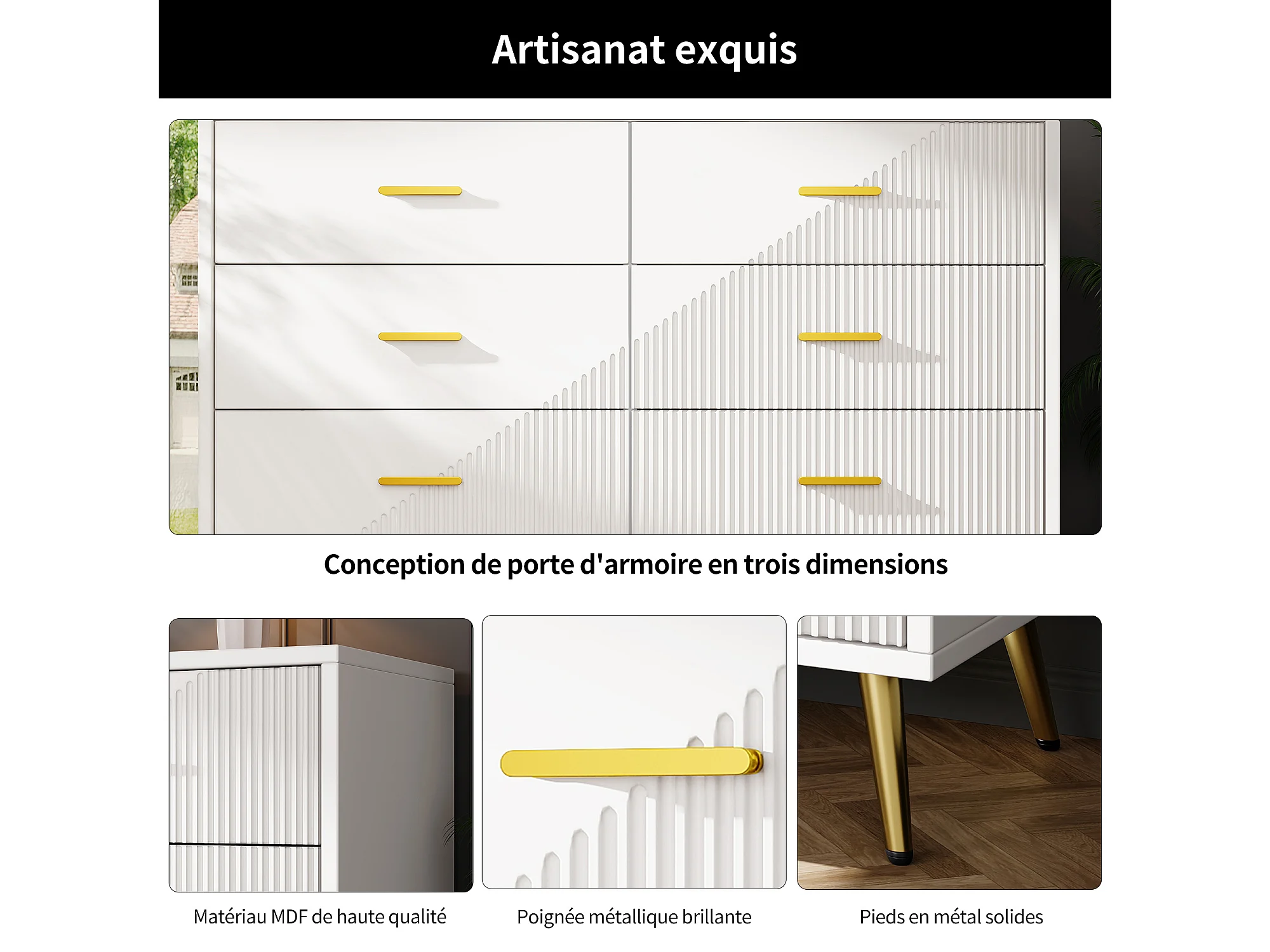 Buffet moderne 6 tiroirs avec décor, pieds dorés, pour chambre, salon, couloir, 120x40x75cm, blanc