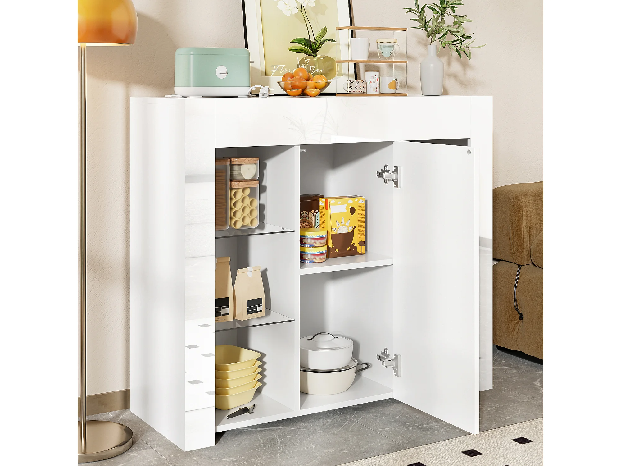 Buffet moderne 80 x 36 x 90 cm, pieds en acier, idéal pour le salon, espace de rangement, en MDF blanc
