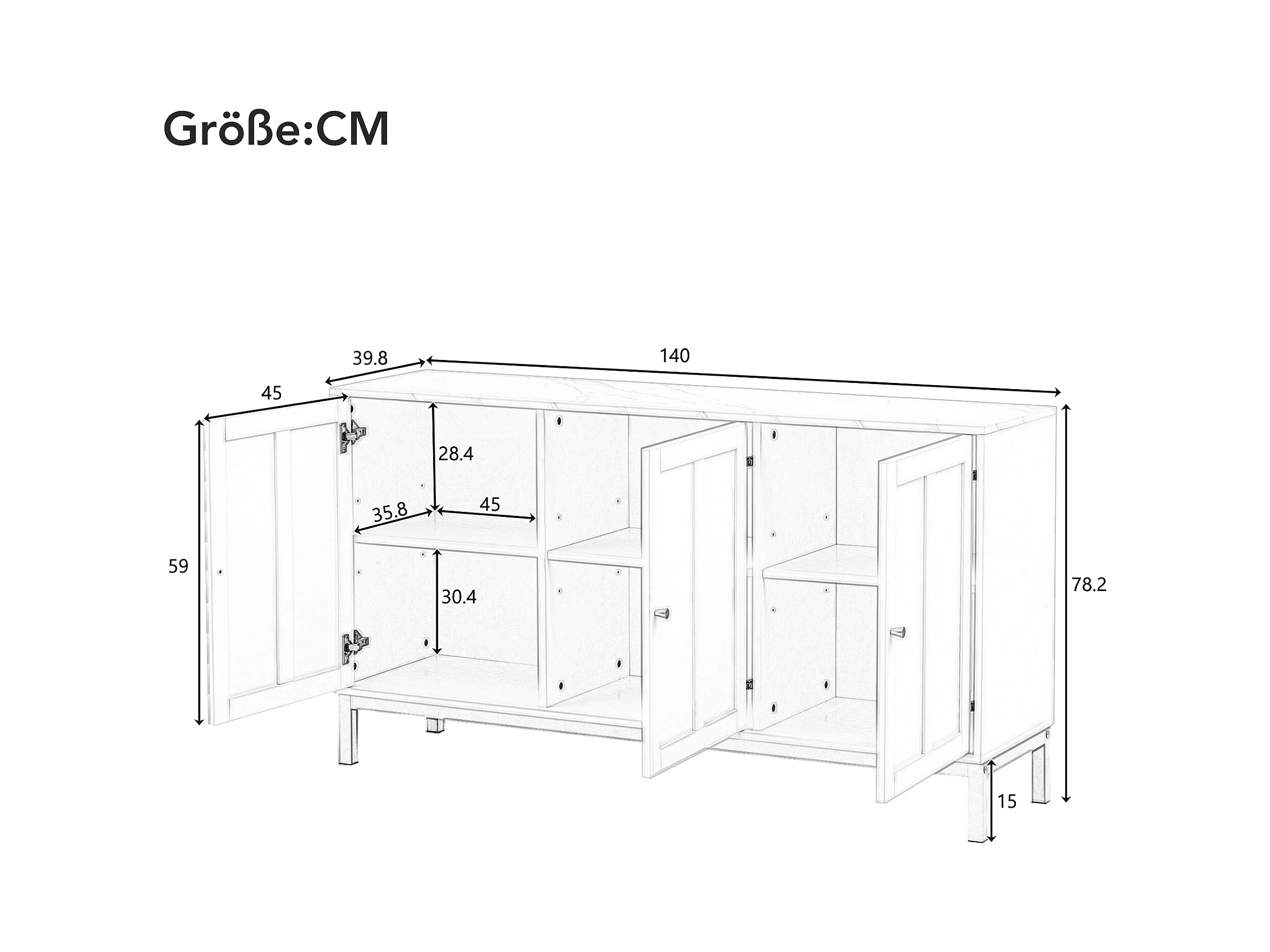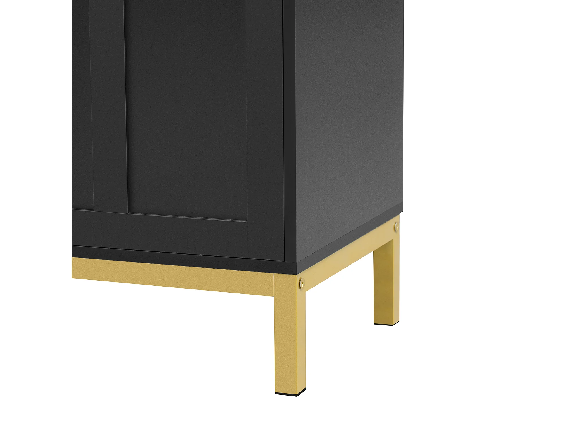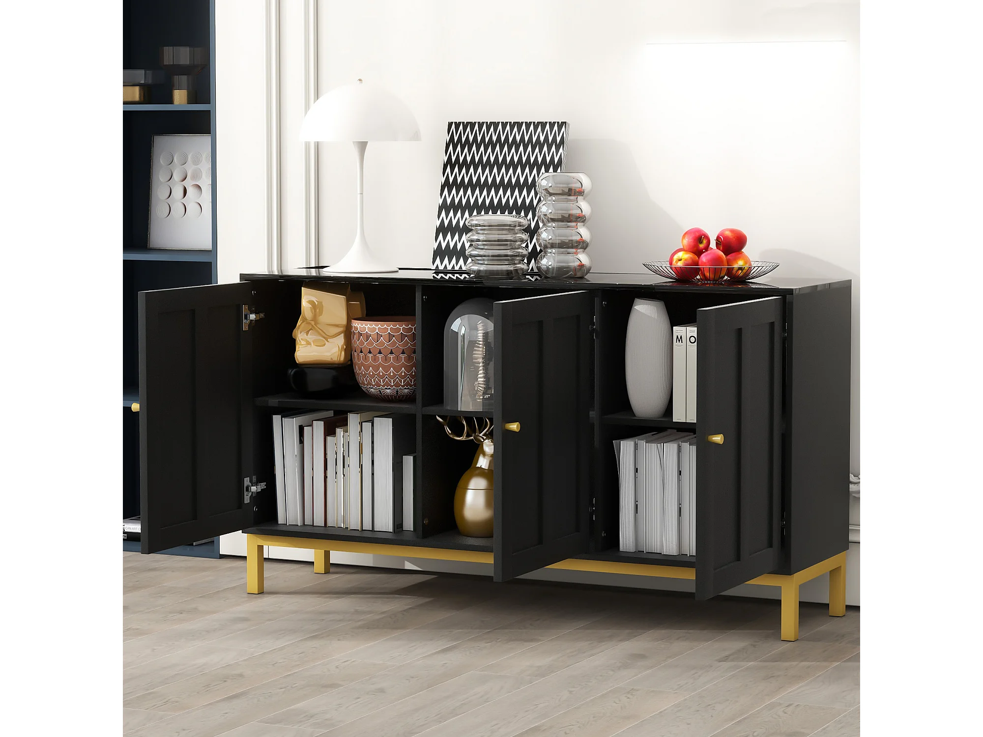 Buffet moderne, 4 portes, 4 tiroirs, finition bois et noir, avec détails dorés (140x37.8x82 cm)