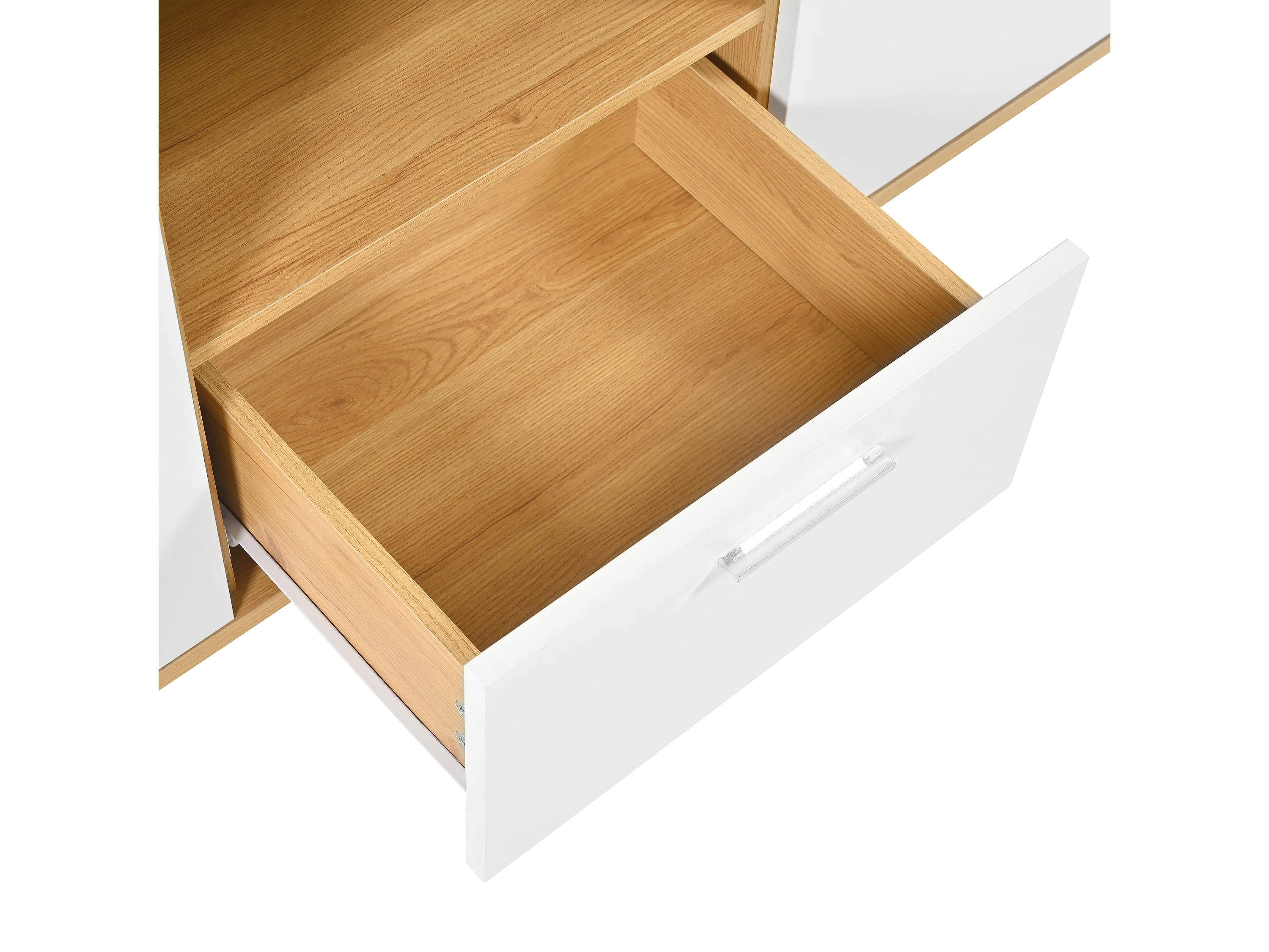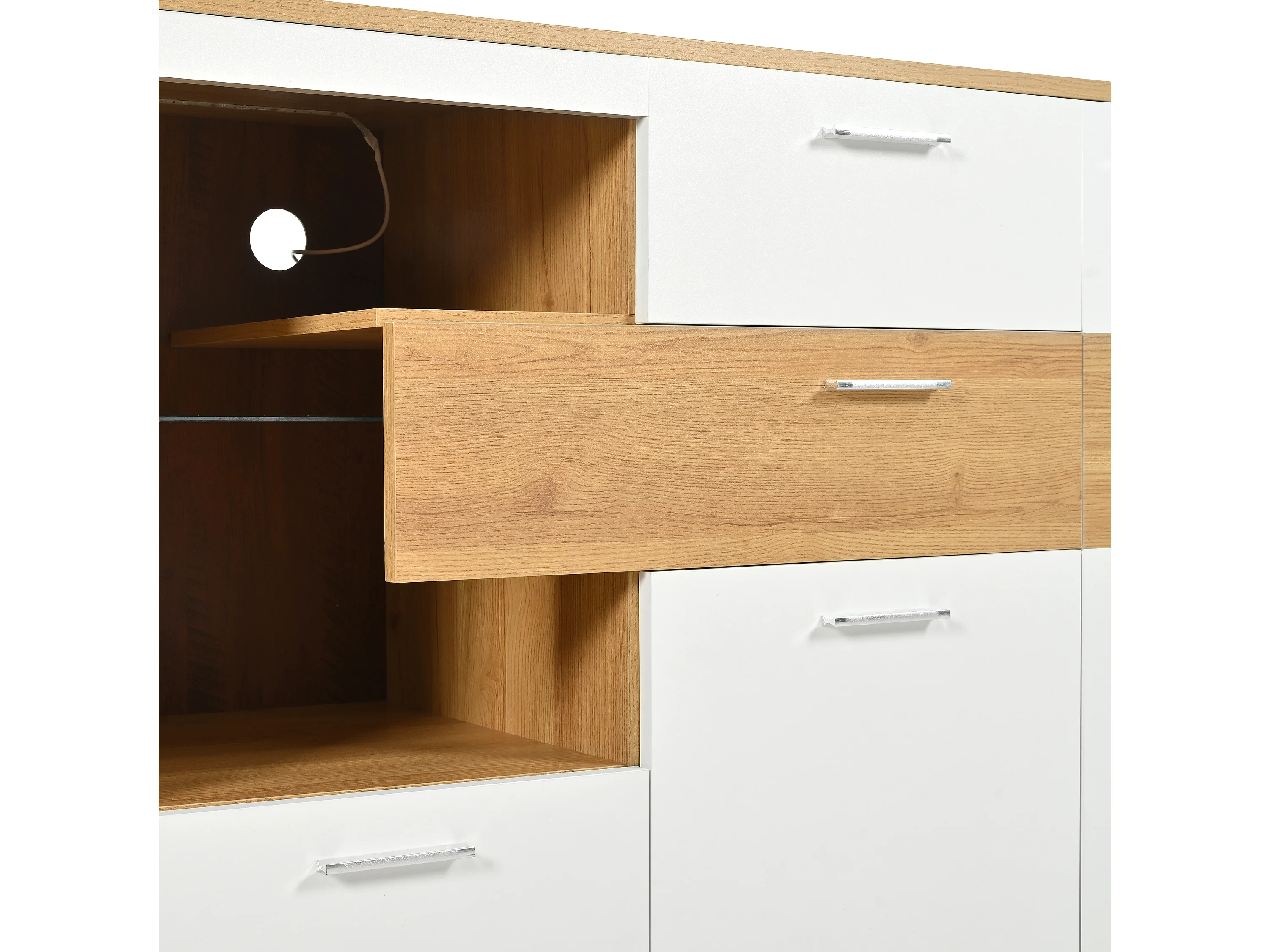 Buffet moderne avec rangement 160 x 40 x 77 cm, LED, portes et tiroirs, en MDF, naturel foncé et blanc