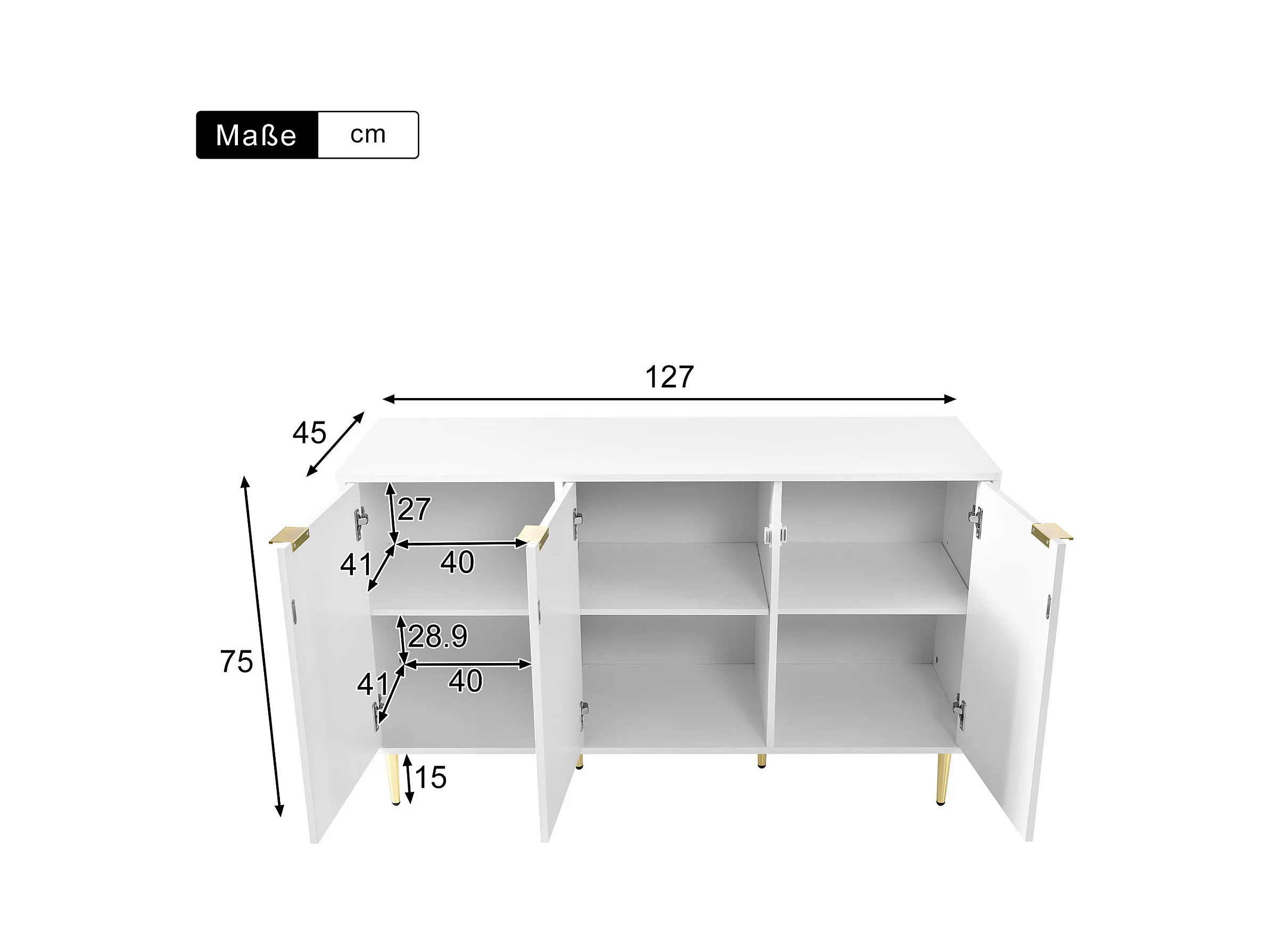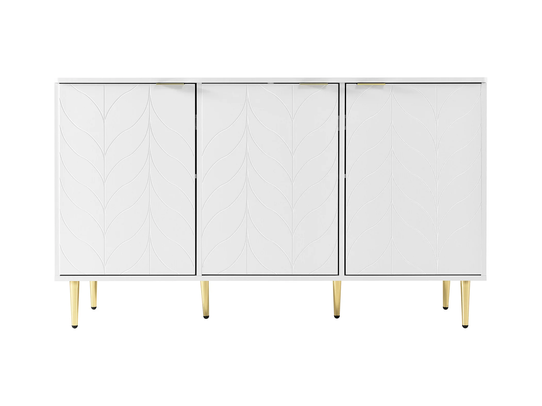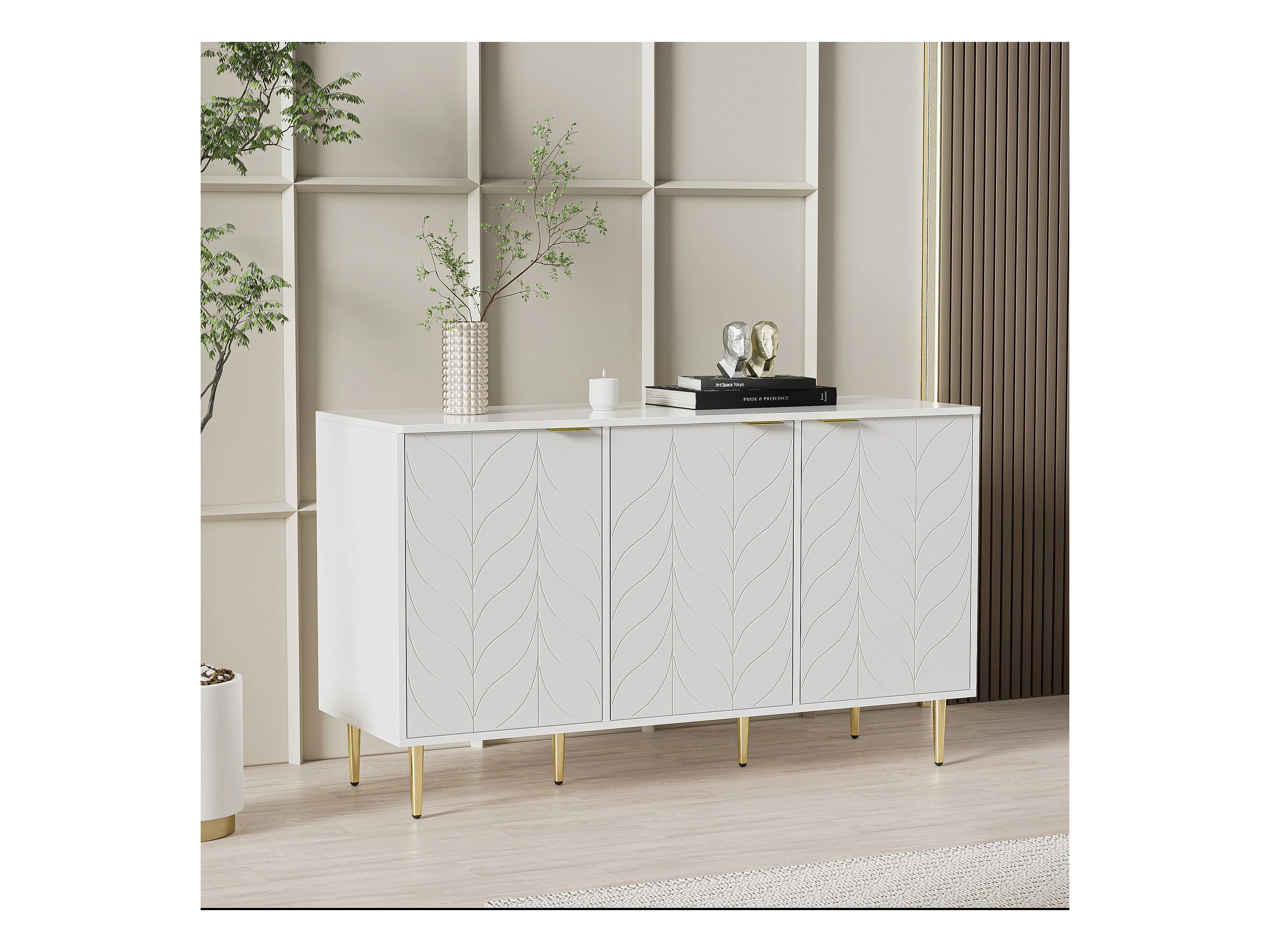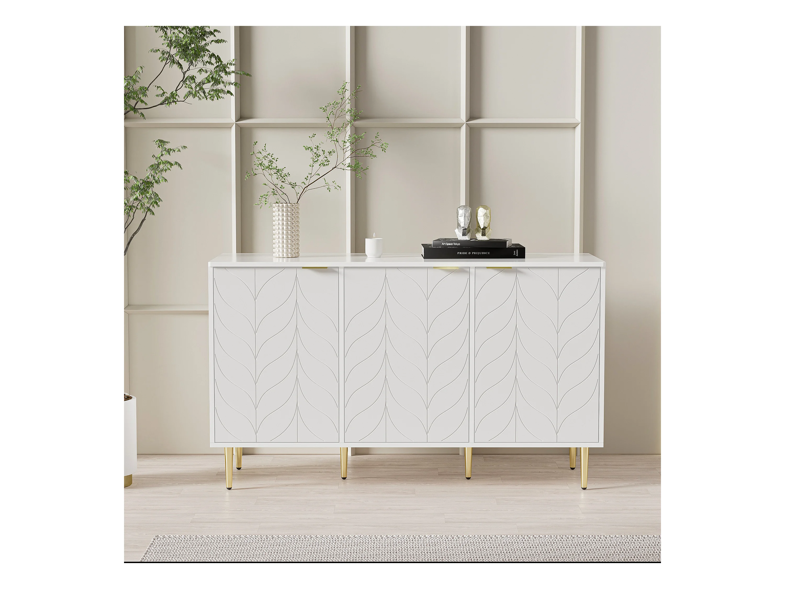 Buffet moderne commode blanc motif floral avec poignées et pieds plaqués d'or laqué, rangement 2 niveaux et 6 compartiments 127L*45P*75H