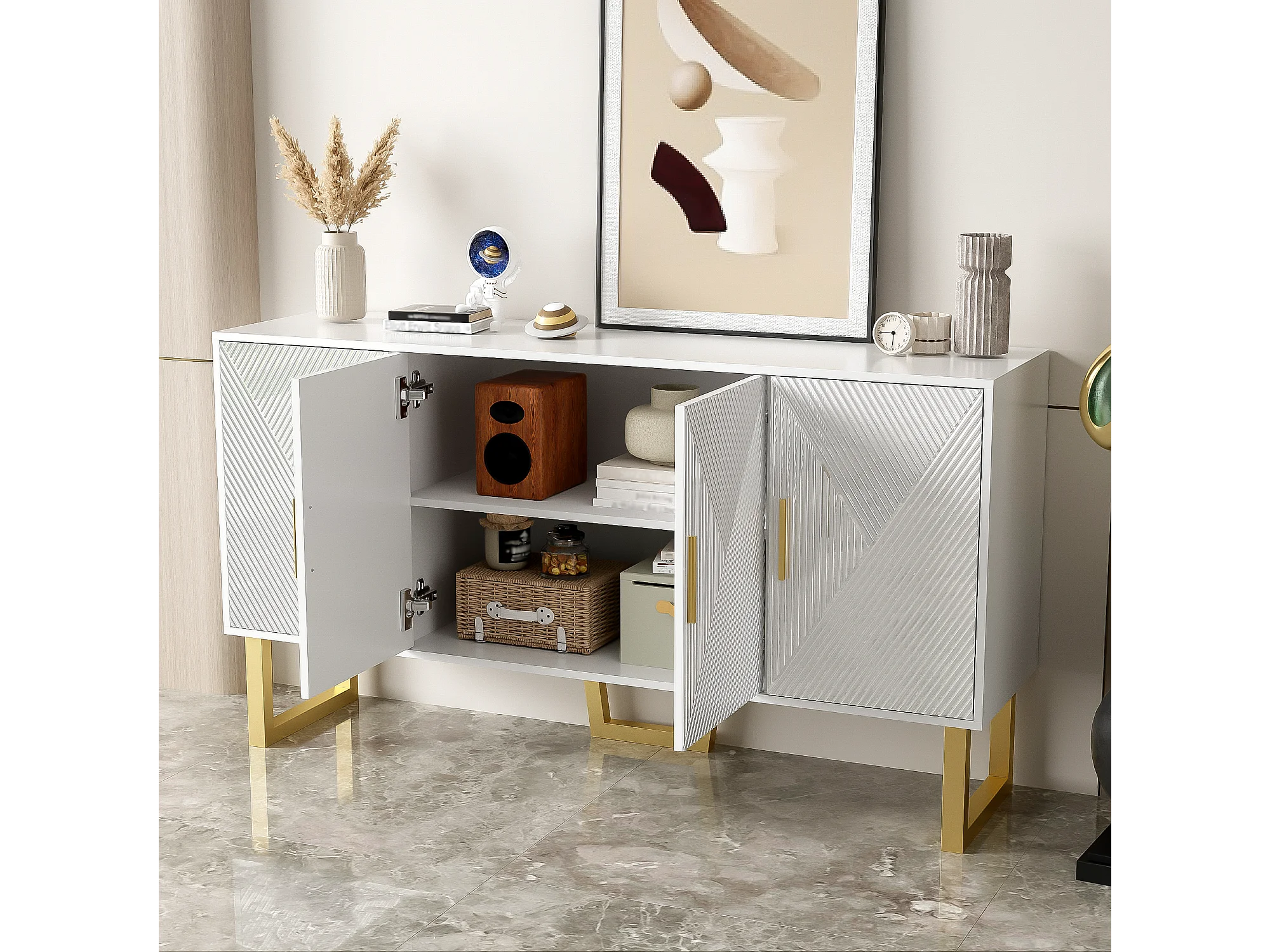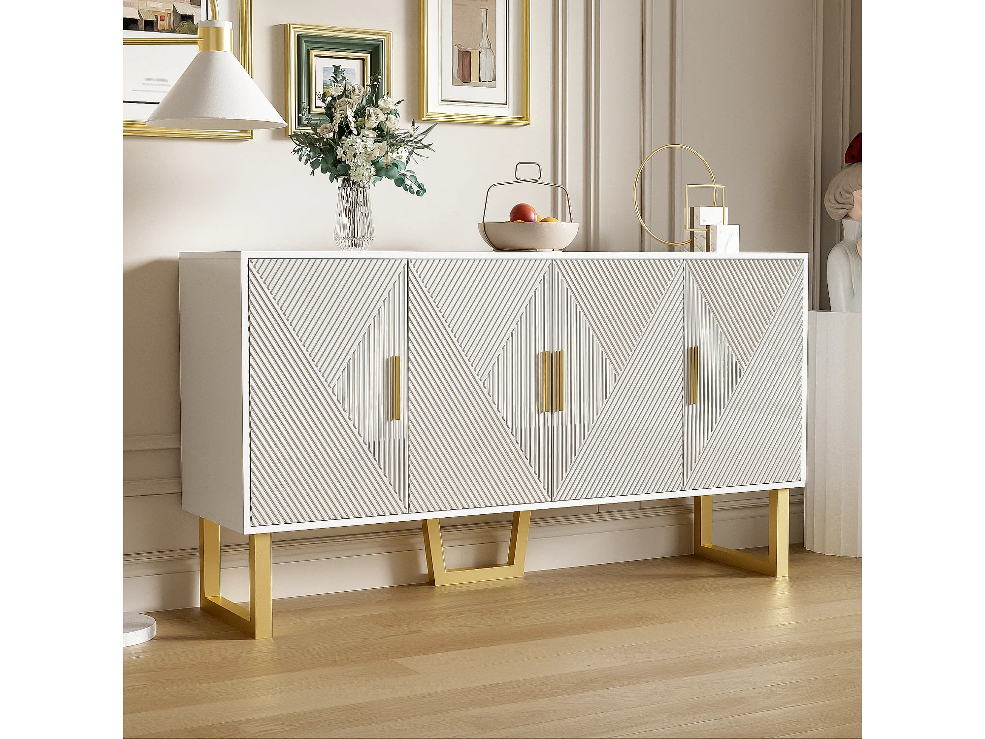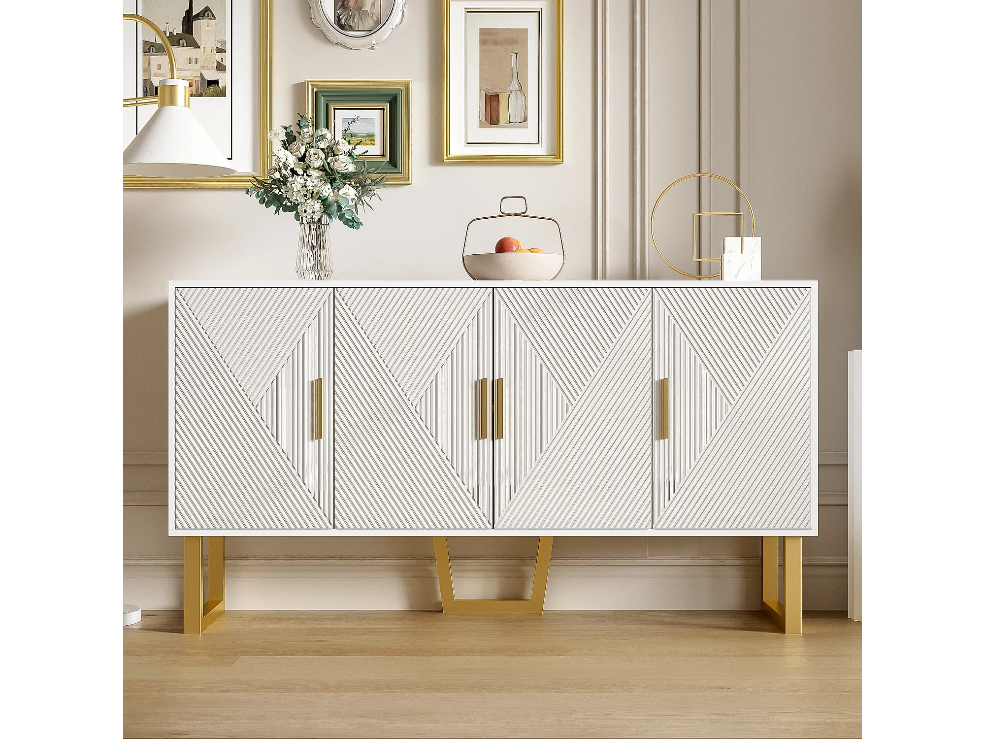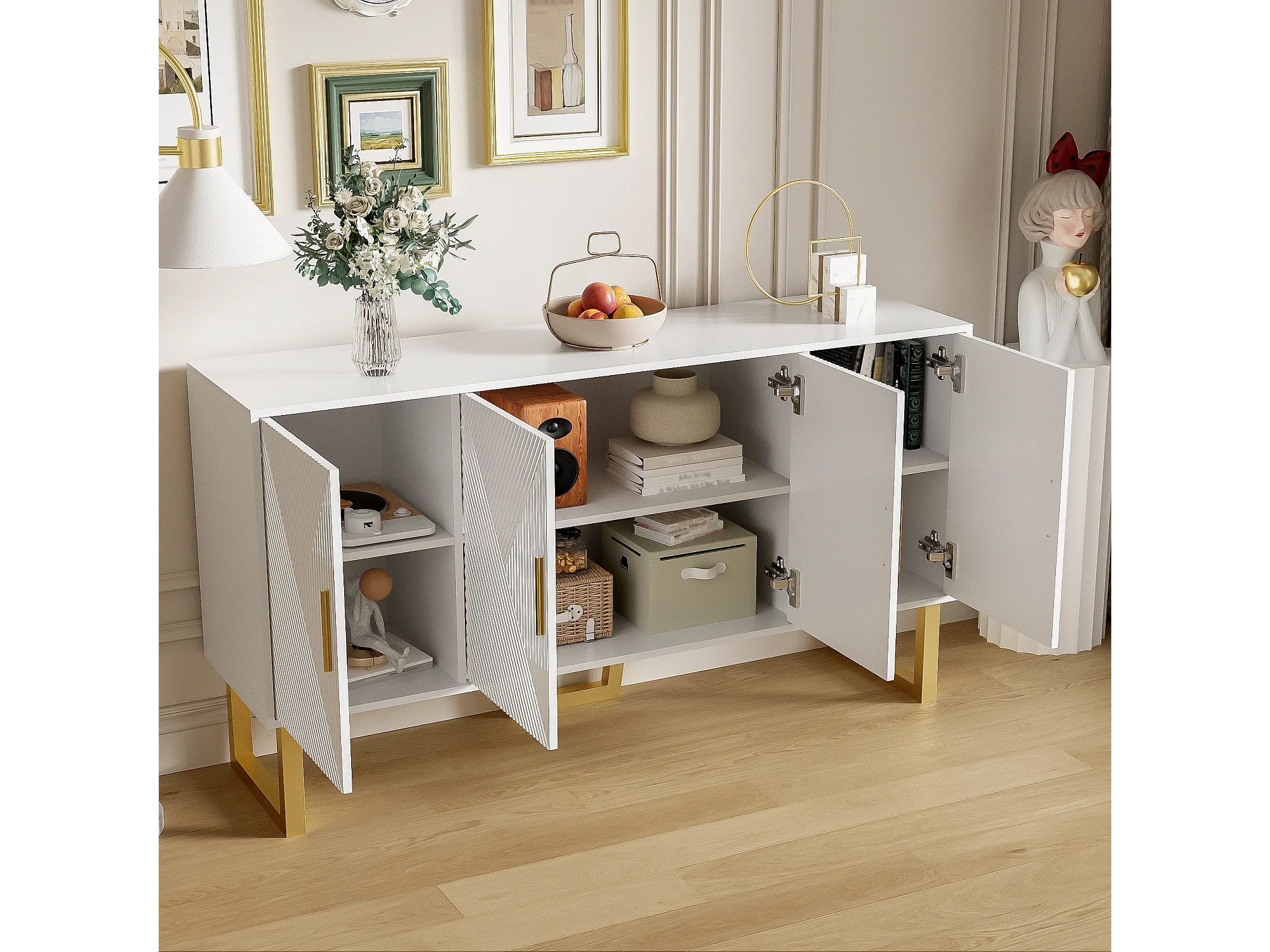 Buffet moderne en blanc laqué, portes texturées et poignées dorées, 4 portes, étagères réglables (150x40x82 cm)