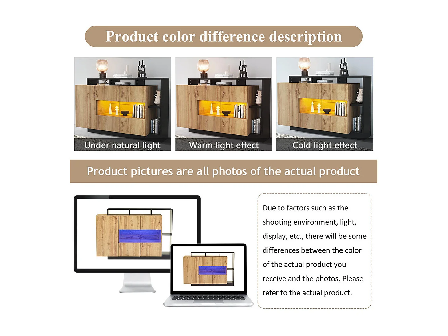 Buffet moderne LED en MDF pour salle à manger plateau en verre commande bluetooth et finition bois