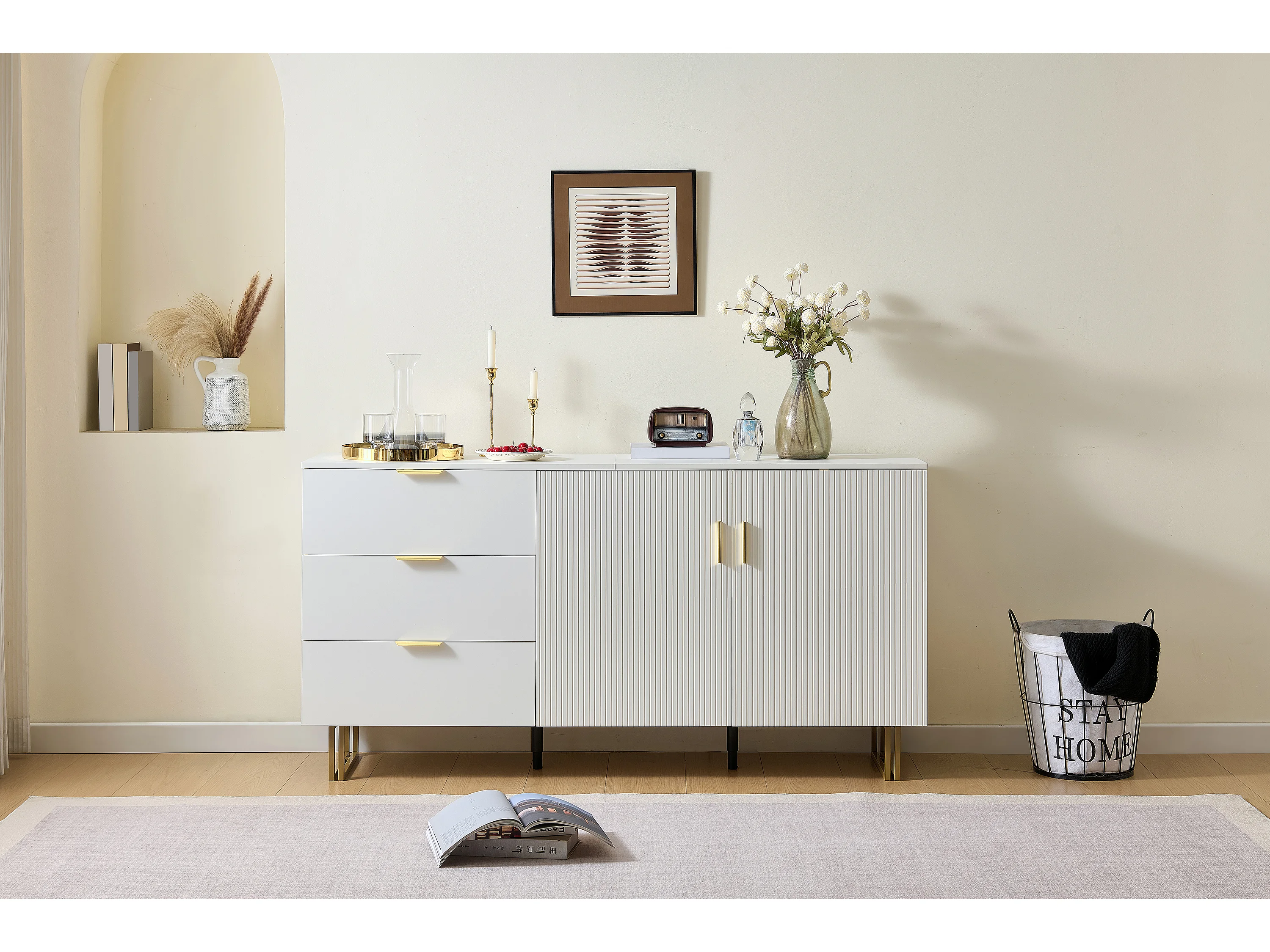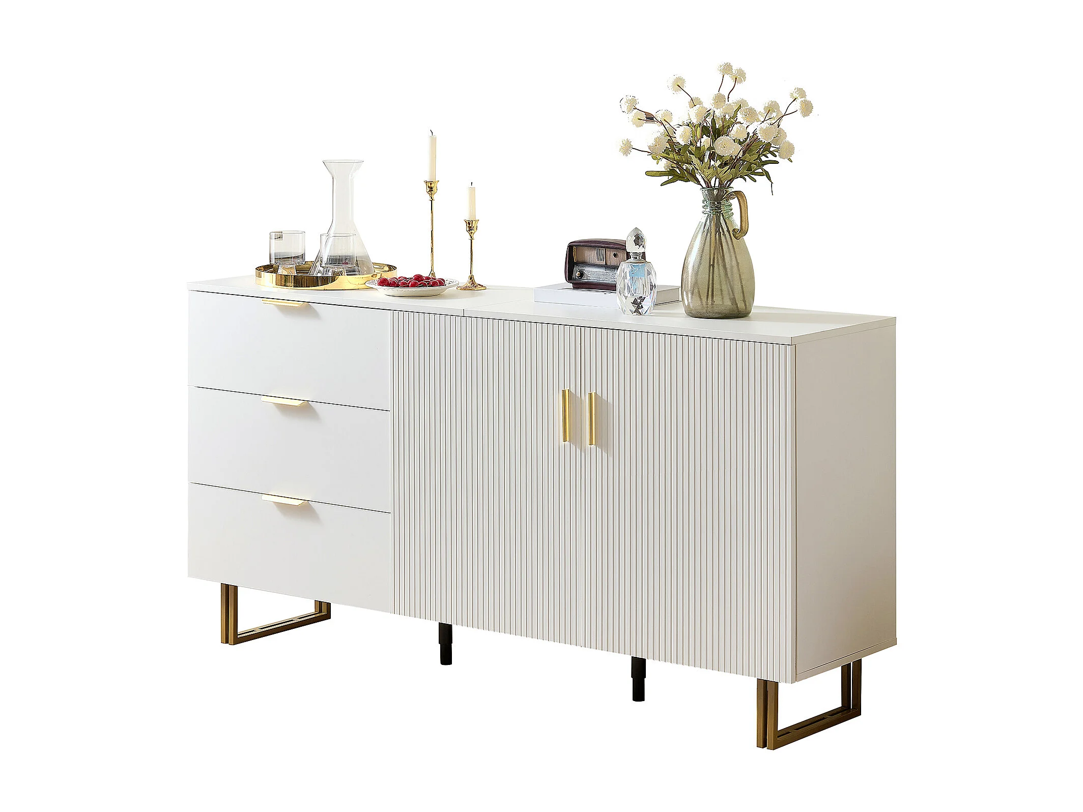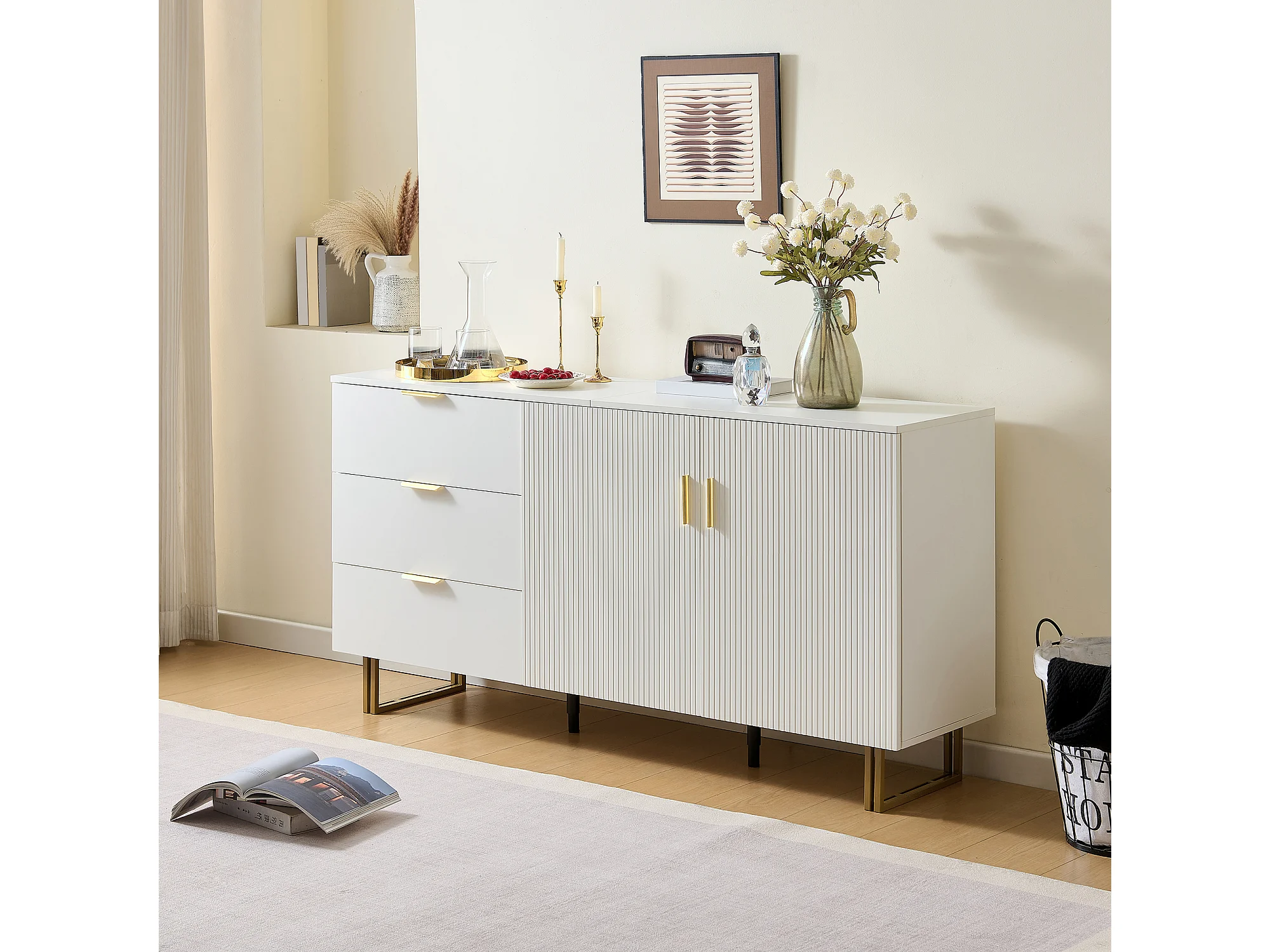 Buffet moderne pour salon - 160 x 40 x 81.5 cm - avec 2 portes + 3 tiroirs - MDF - blanc