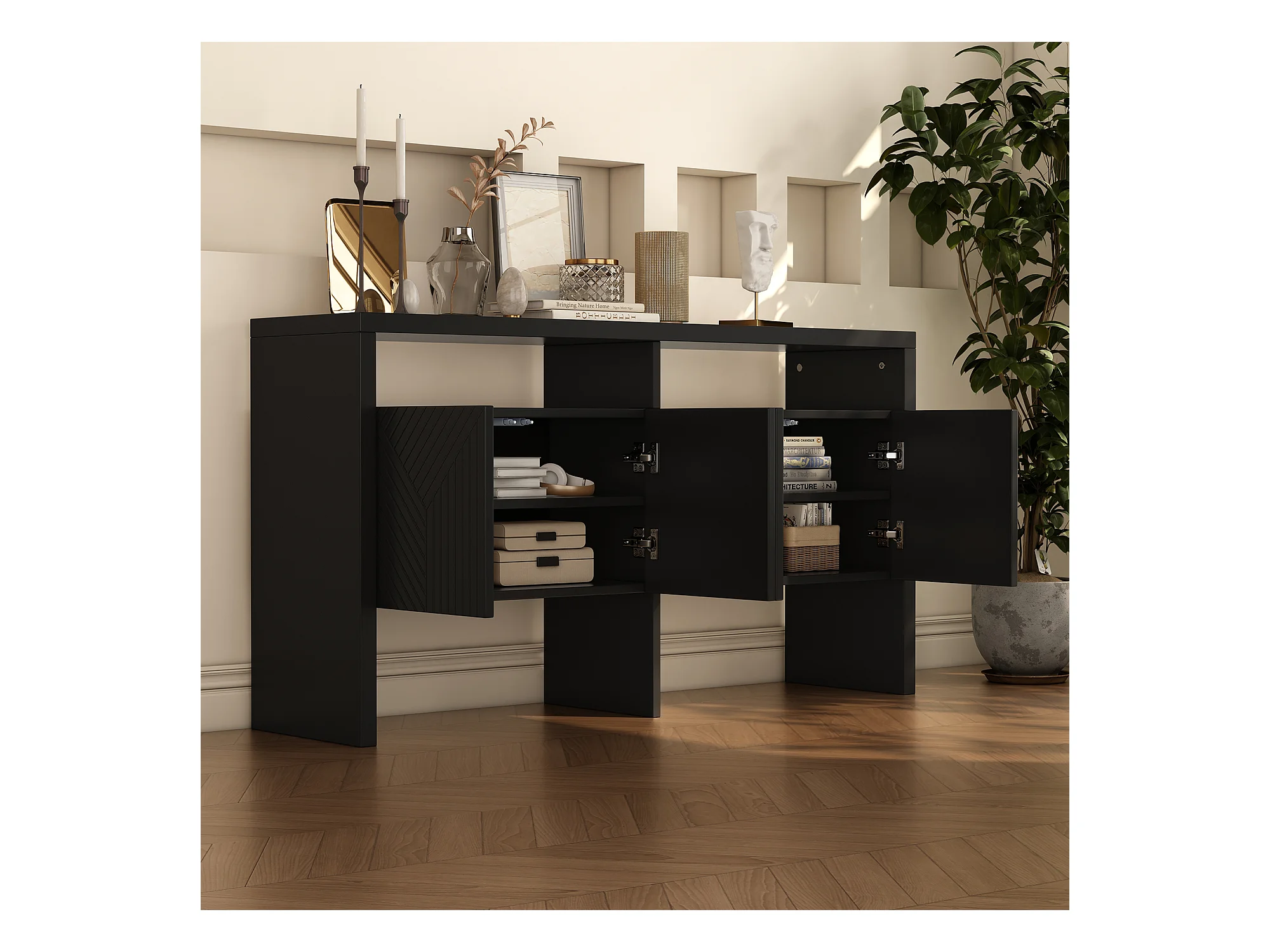 Buffet moderne - 4 portes à motif ondulé - en MDF - Noir