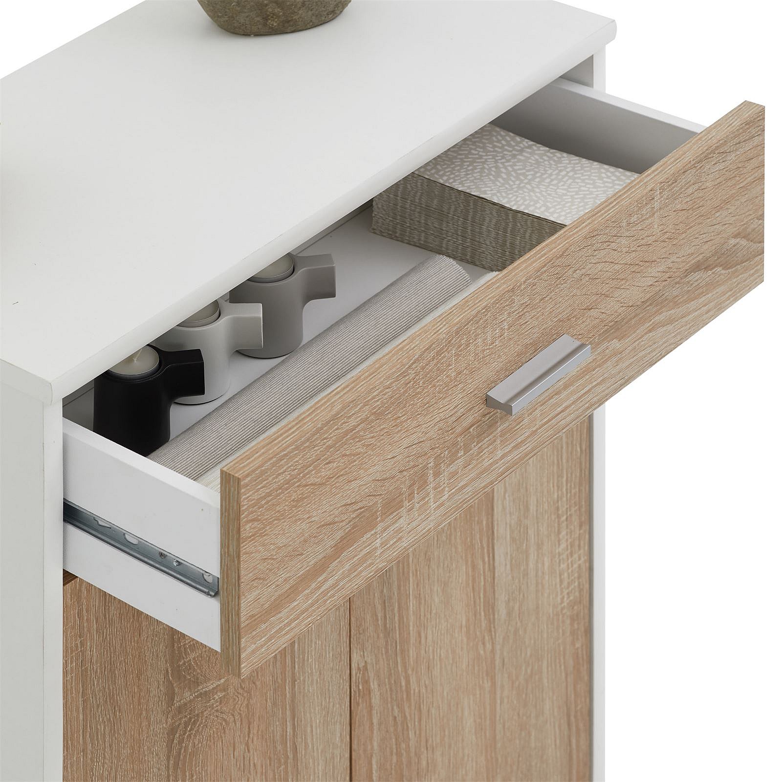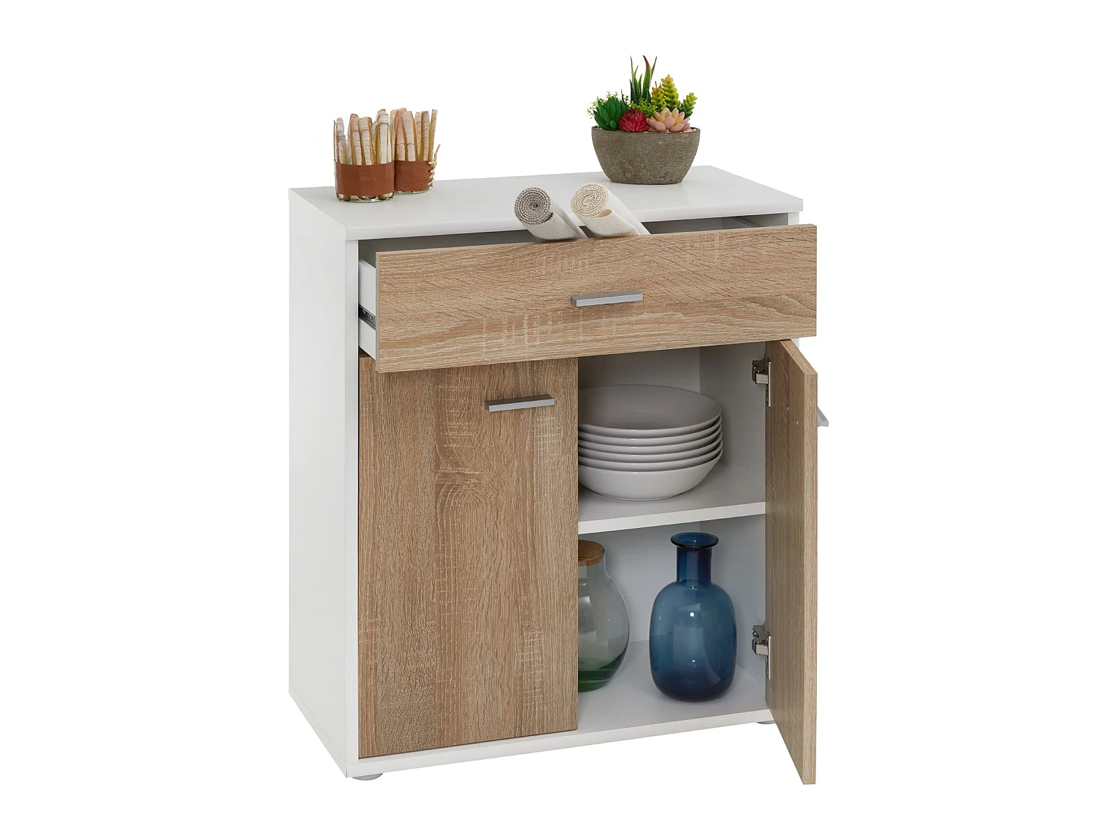 Buffet CALAIS, commode meuble de rangement avec 1 tiroir et 2 portes, en mélaminé blanc mat et décor chêne sonoma