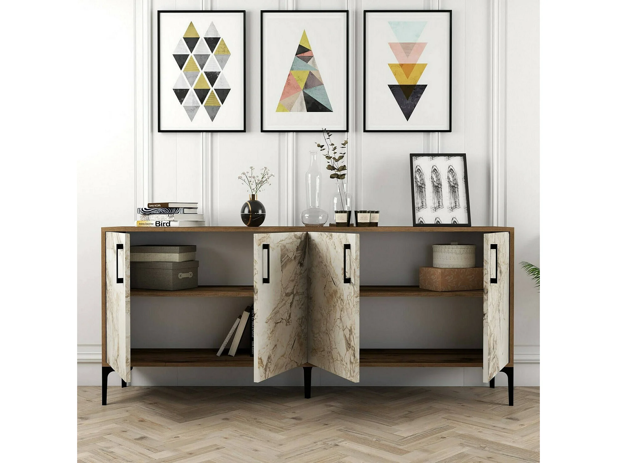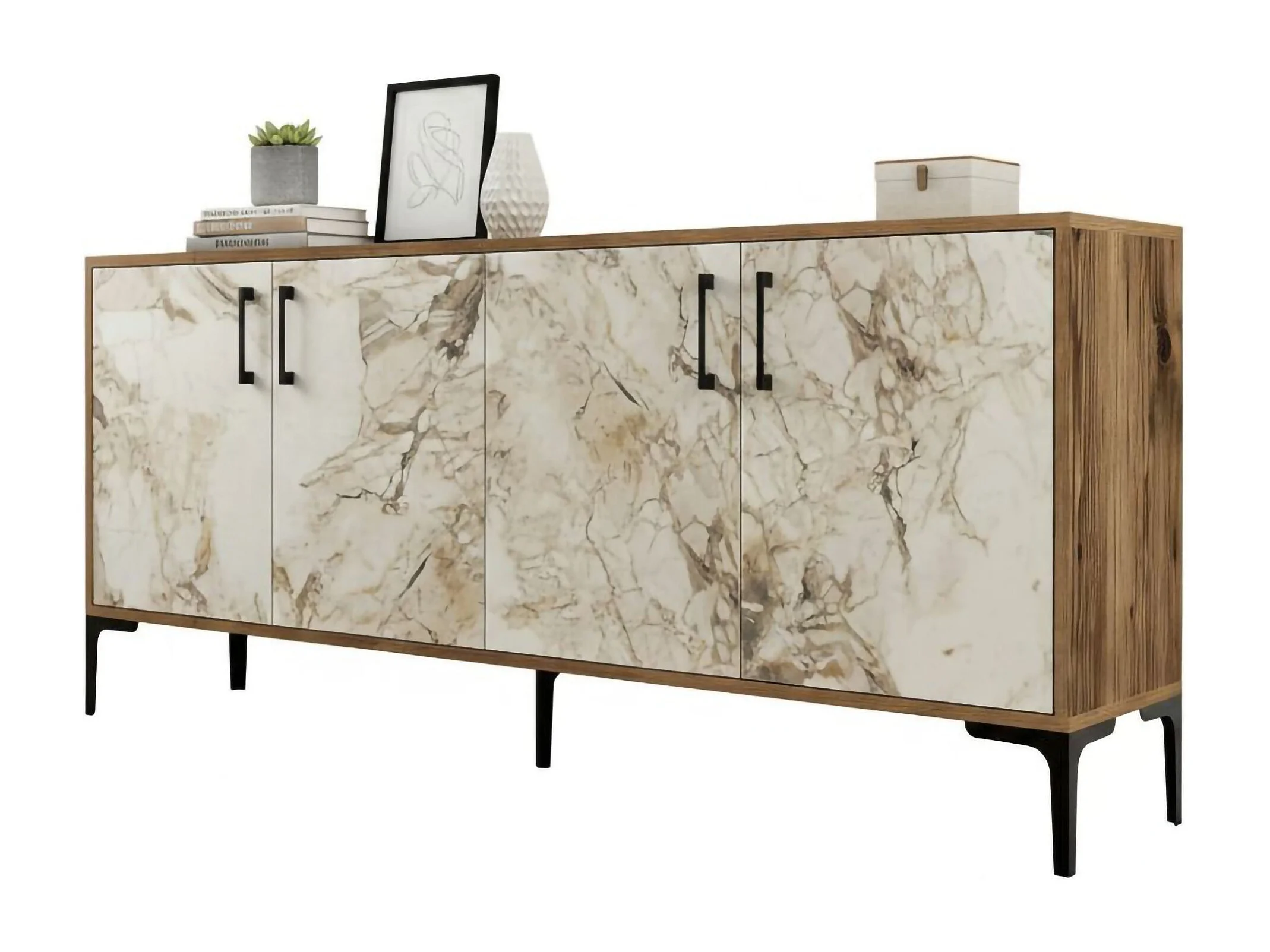 Buffet Orionis, Buffet du salon, Commode de salon, Garde-manger de cuisine, 180x35h78 cm, Noyer et Marbre Blanc