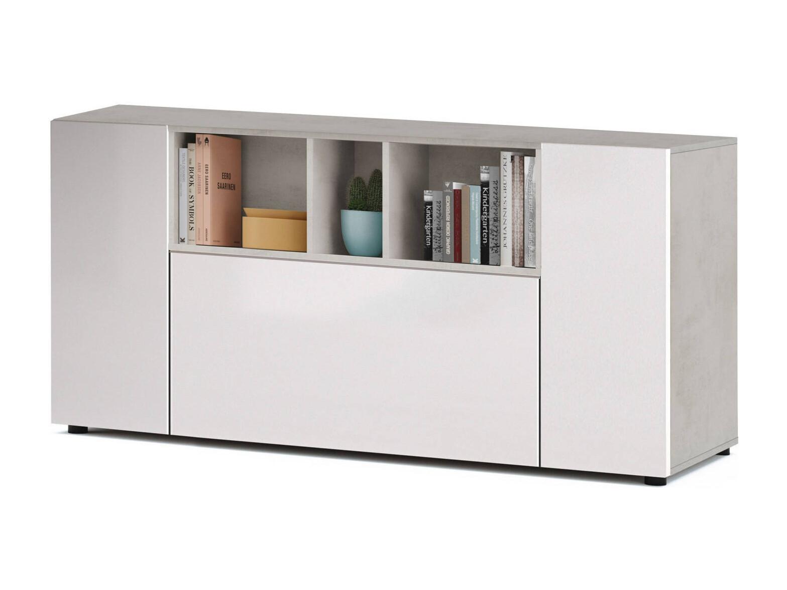 Buffet Paterson, Buffet de salon avec compartiments, Buffet de salon, Meuble TV, Armoire moderne avec 3 portes, 150x41h76 cm, Blanc et Ciment