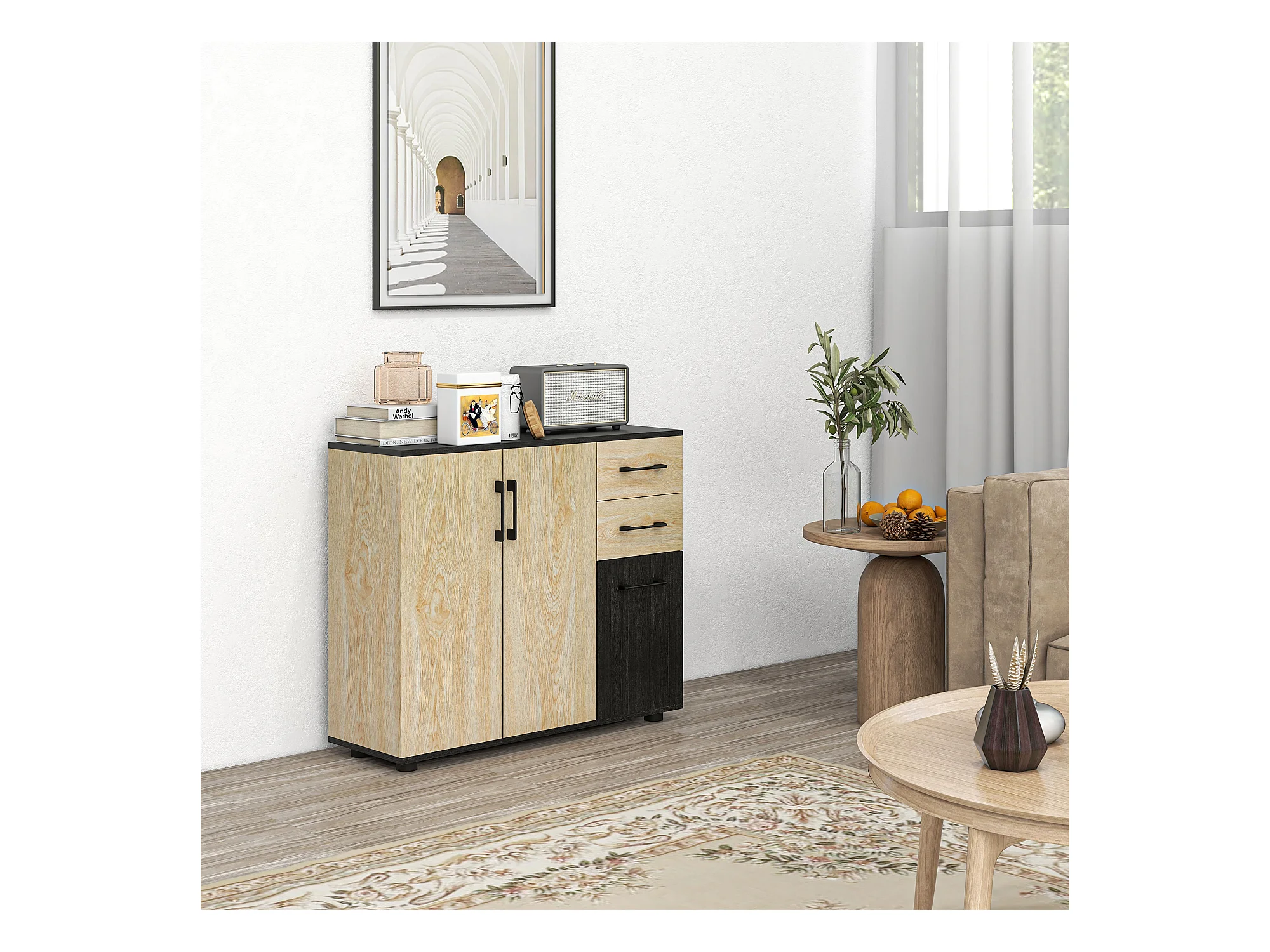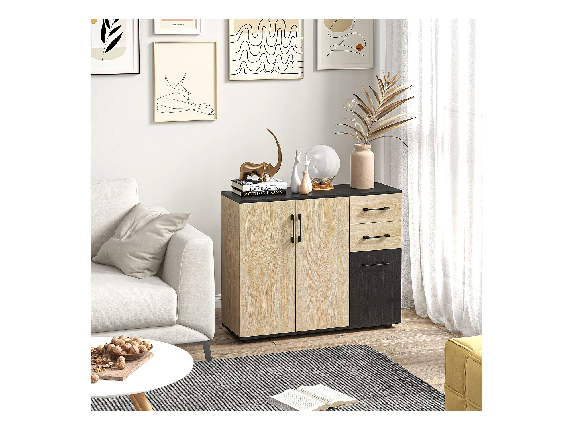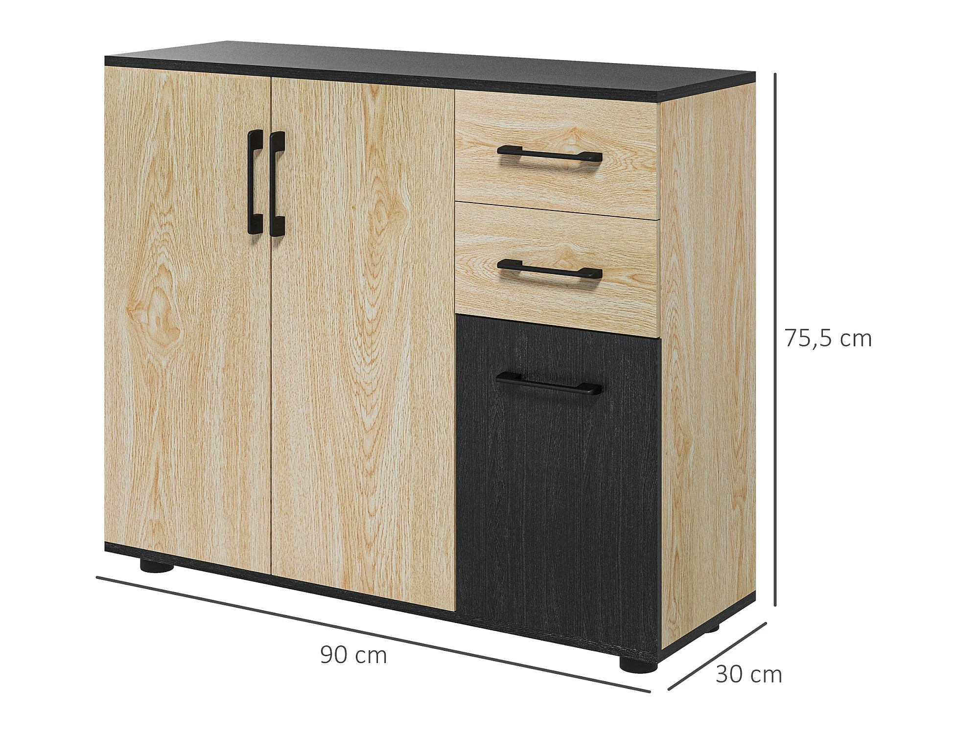 Buffet rangement 3 portes étagère 2 tiroirs coulissants panneaux aspect bois clair noir