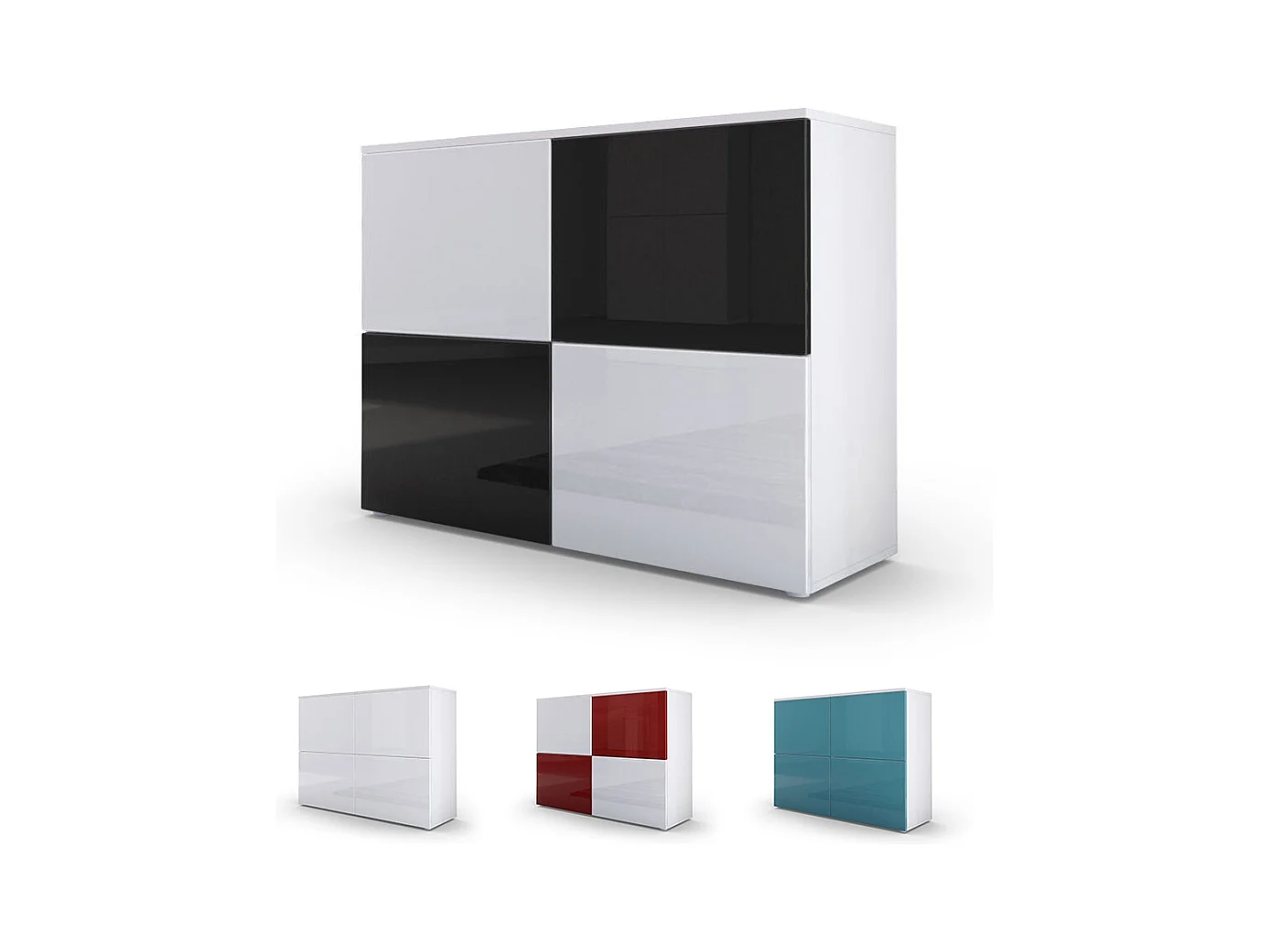 Buffet Rova, Commode avec 4 portes, Blanc mat/Blanc haute brillance/Gris sable haute brillance (92 x 72 x 35 cm)