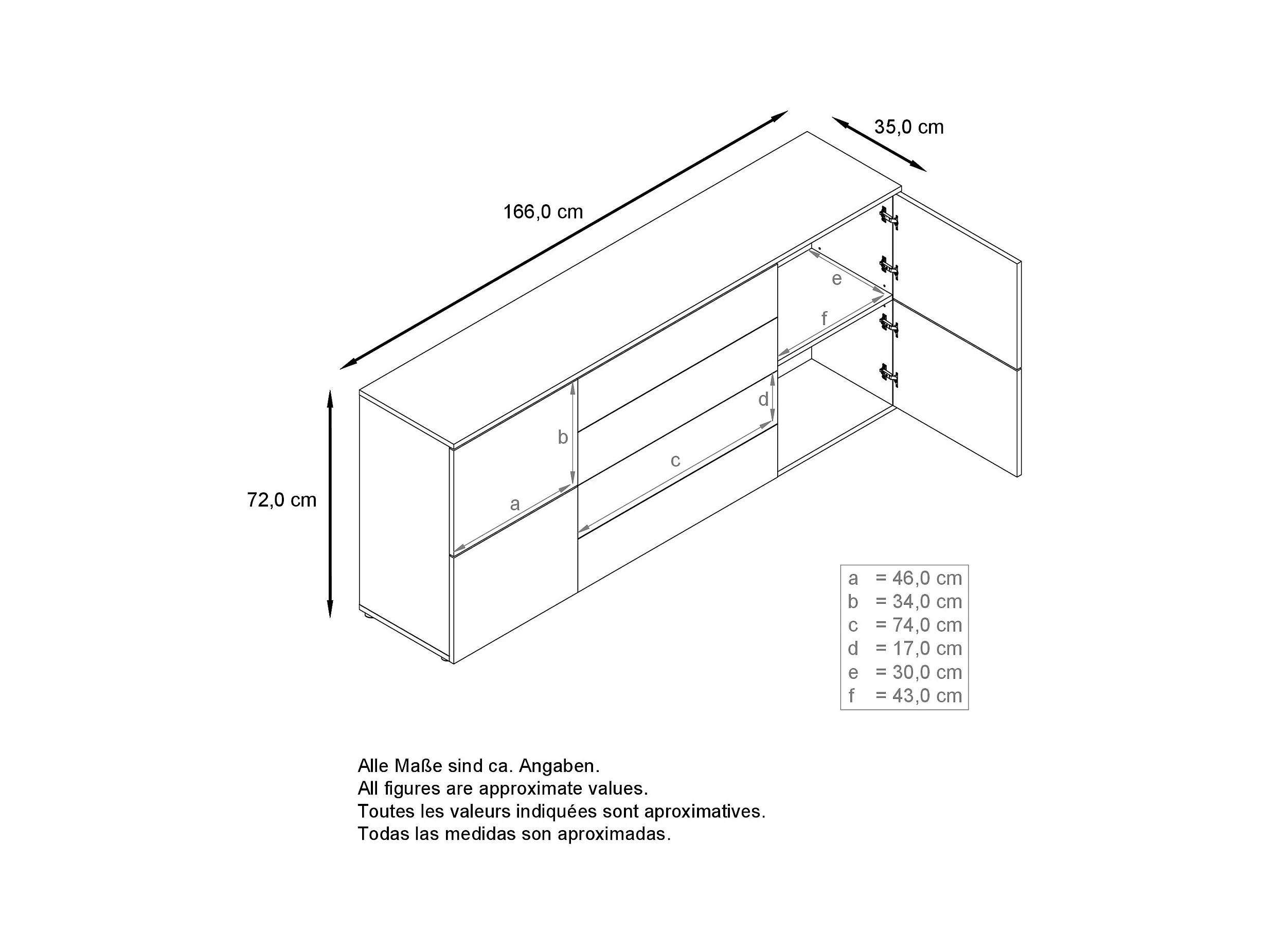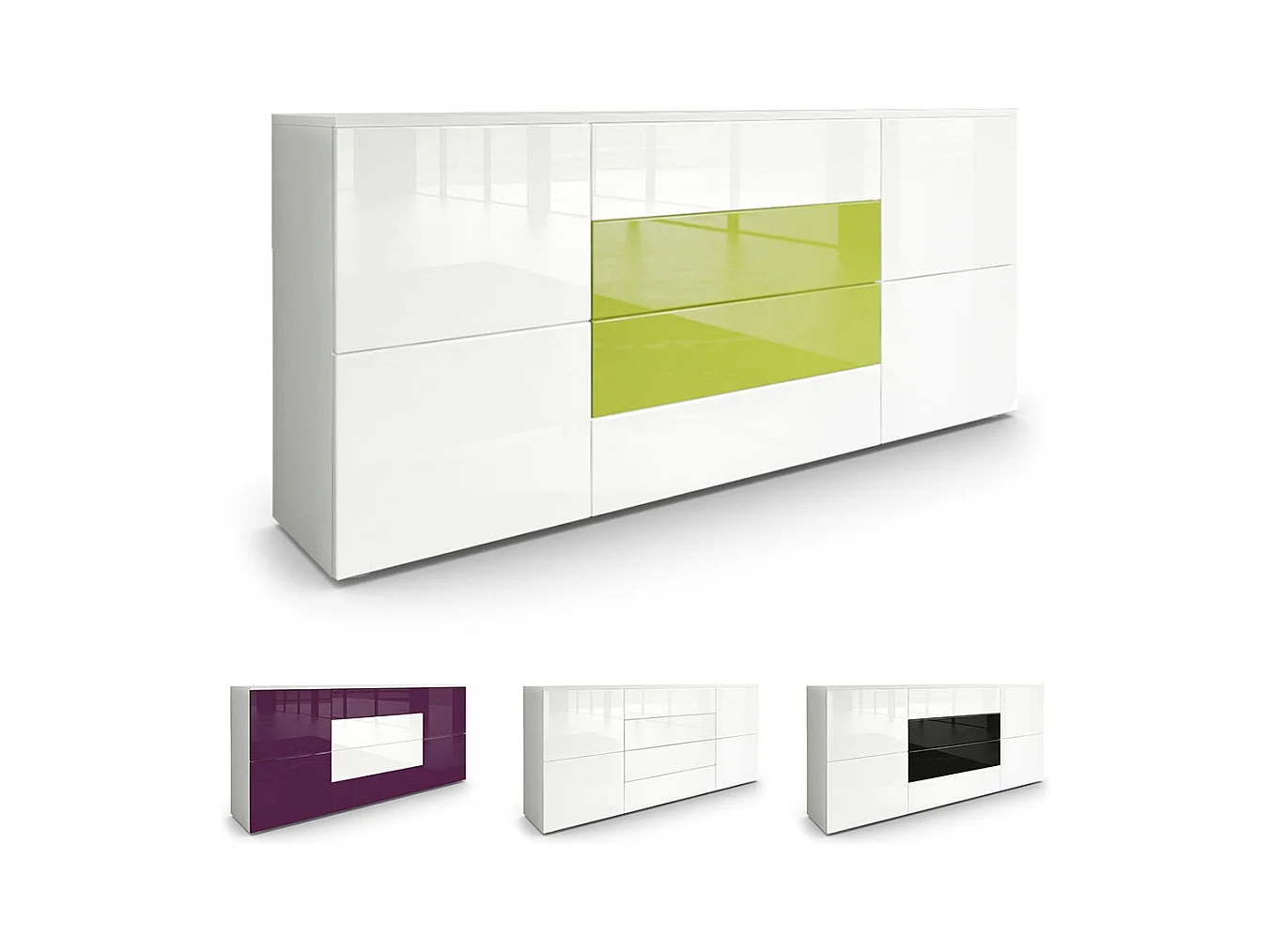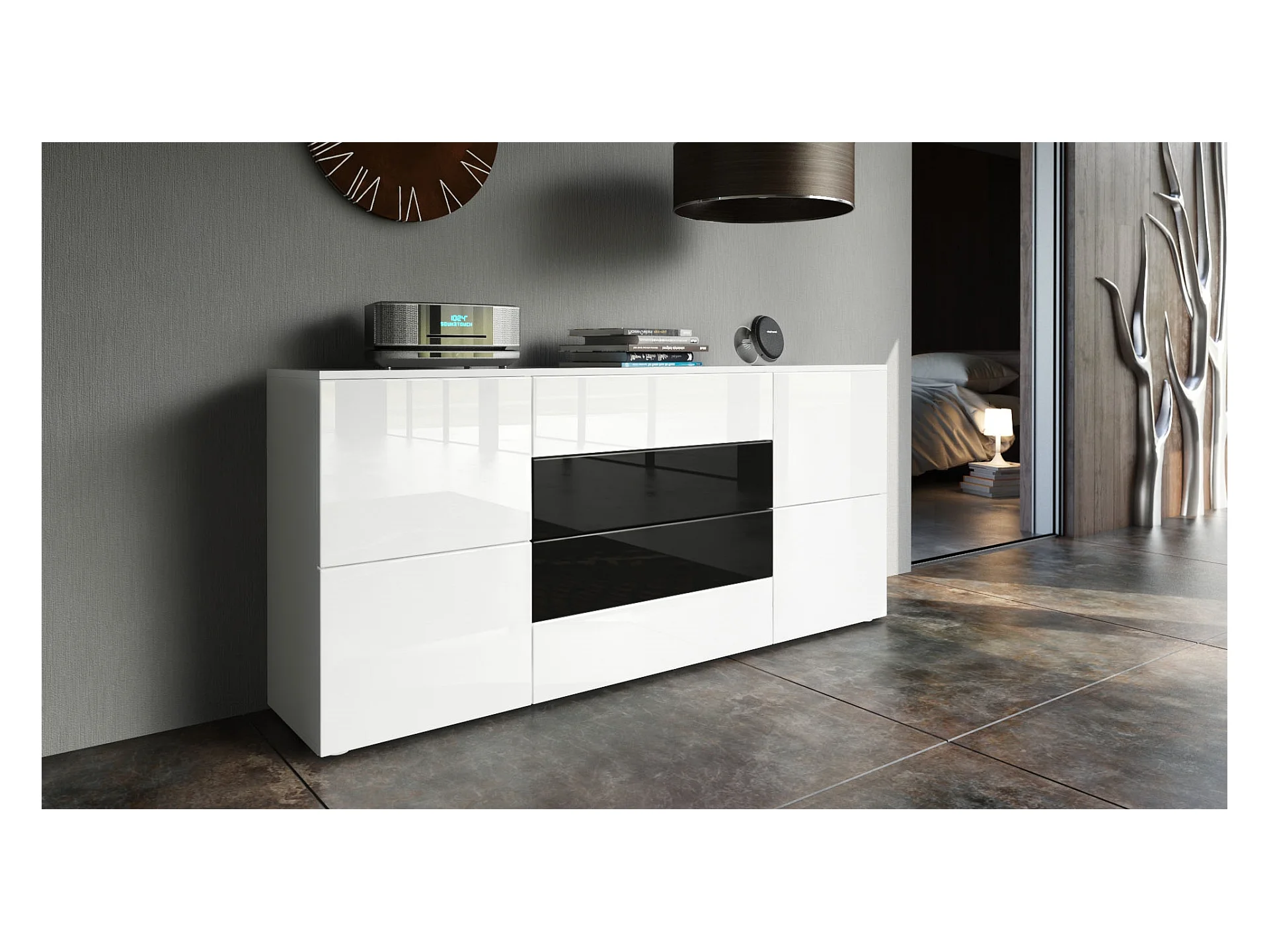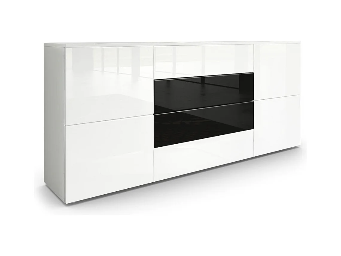 Buffet Rova, Commode avec 4 portes et 4 tiroirs, Blanc mat/Blanc haute brillance (166 x 72 x 35 cm)