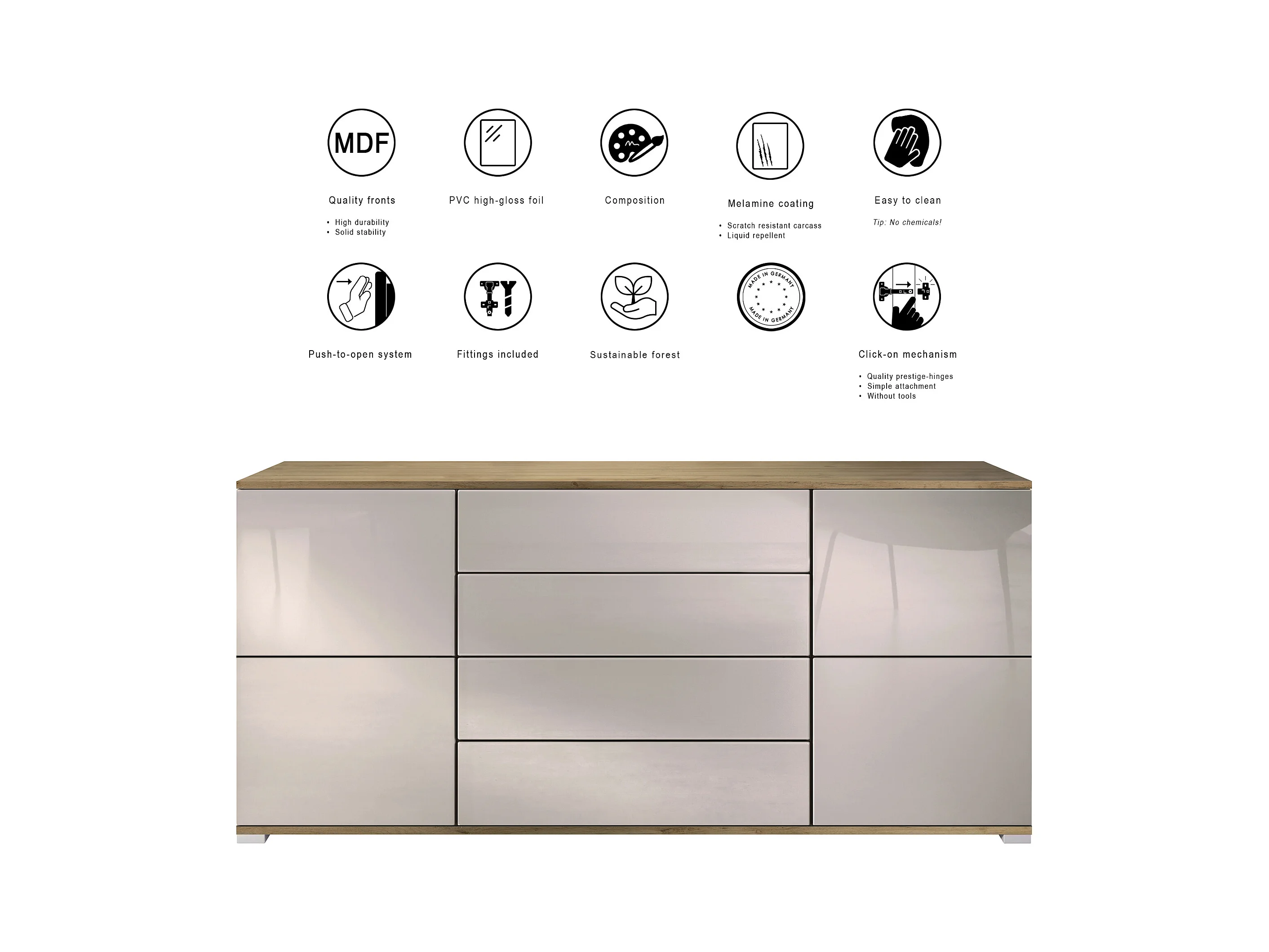 Buffet Rova V2 – Meuble avec 4 Portes et 4 Tiroirs, Chêne Evoke/noir haute brillance (166,5 x 75,5 x 35)