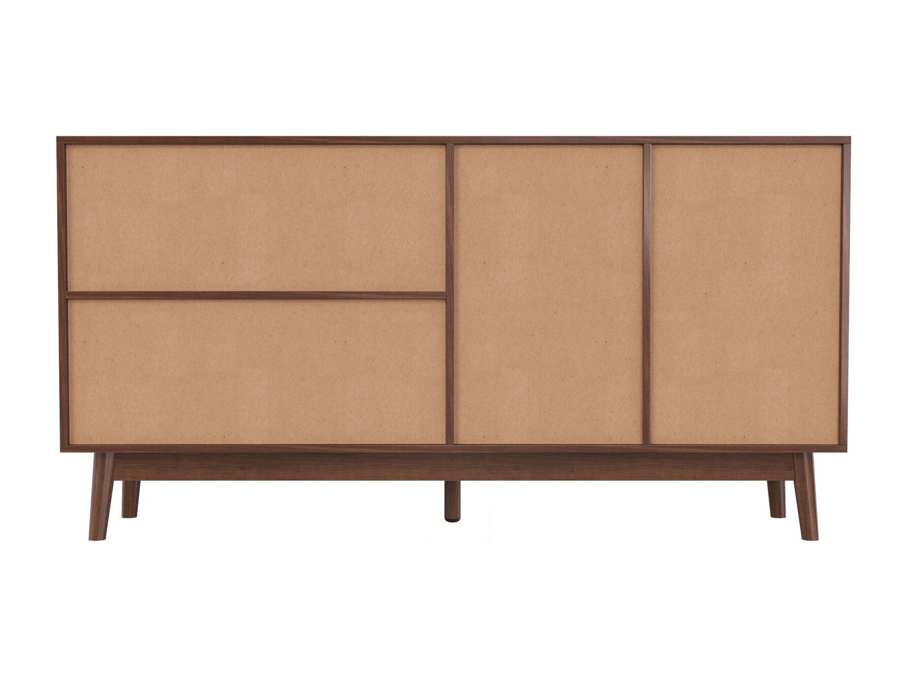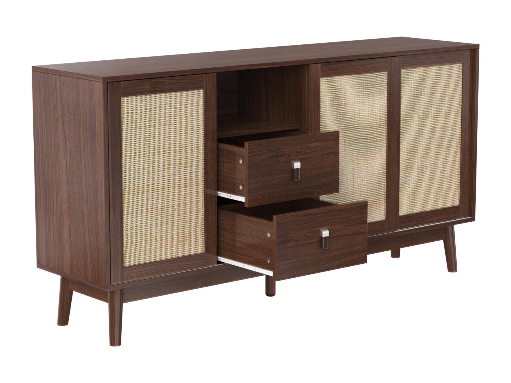 Buffet Salon avec 3 Portes Coulissantes en Rotin Véritable et 2 Tiroirs, Meuble de Rangement, Noyer