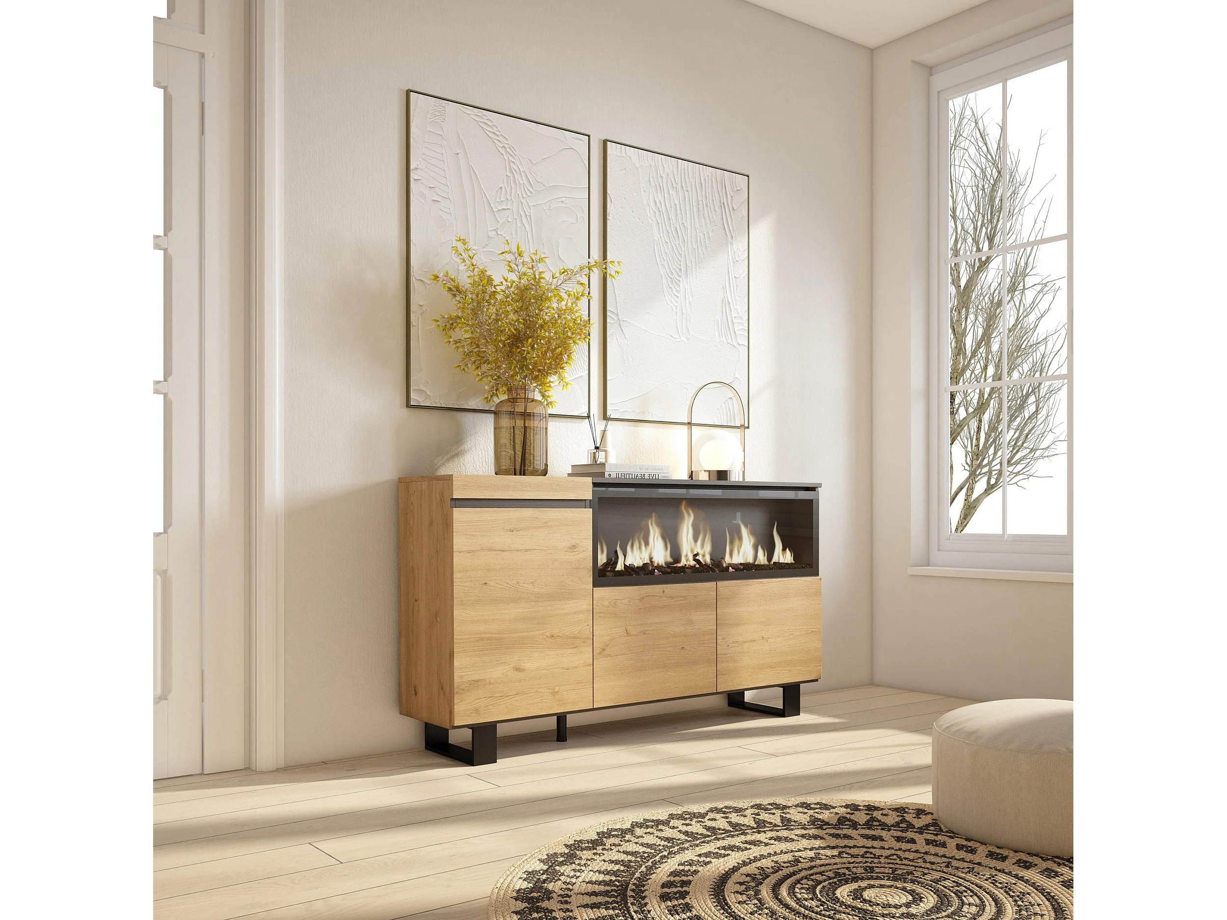 Buffet salon et cuisine, 158x35x87cm, 3 Portes, Cheminée électrique XXL, Design industriel, Chêne