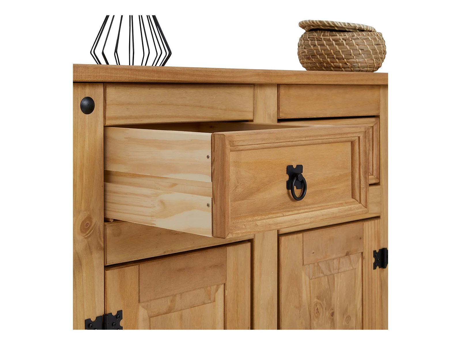 Buffet SALSA commode bahut vaisselier en bois style mexicain avec 3 portes et 3 tiroirs, en pin massif finition teintée/cirée