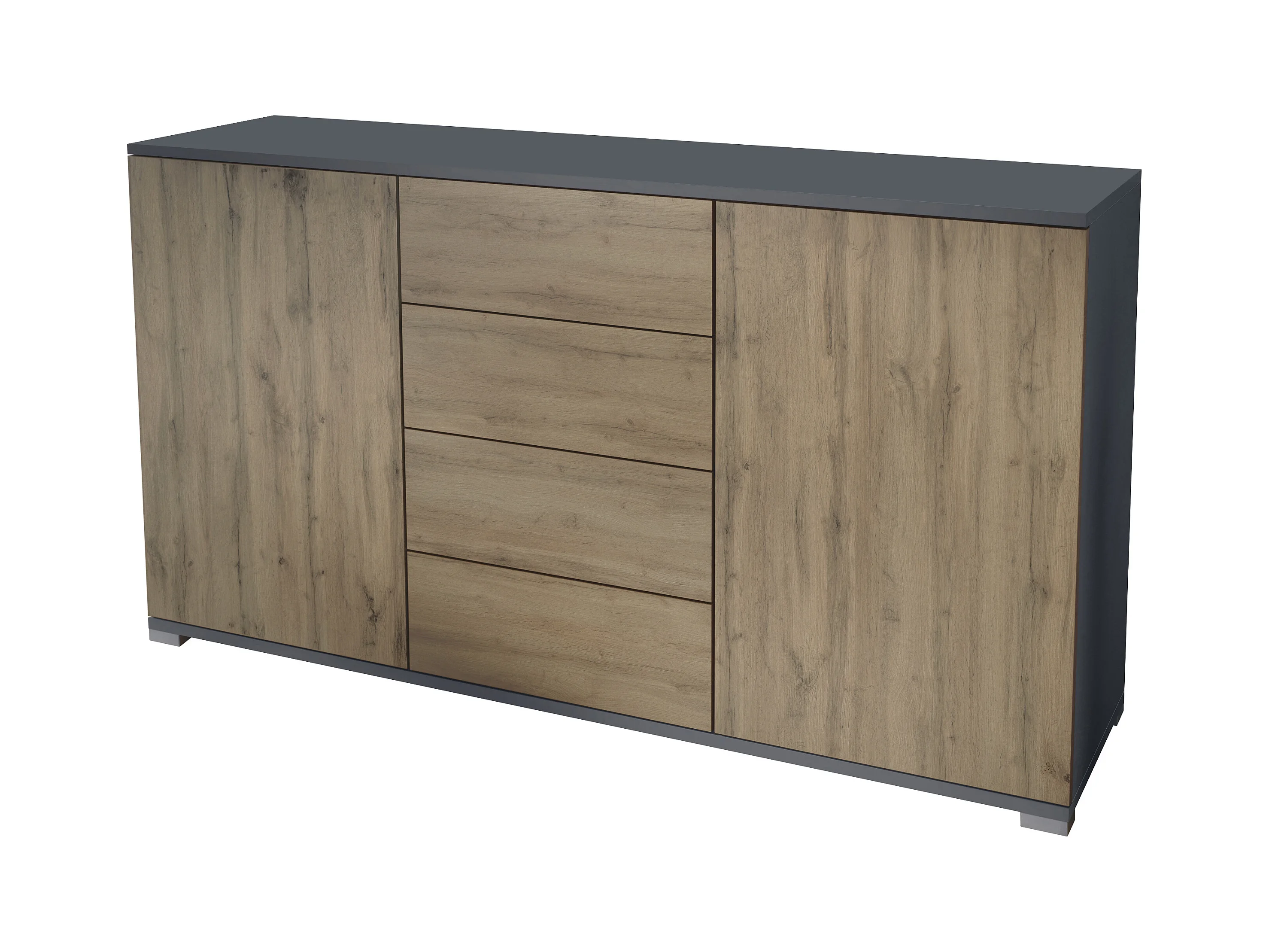 Buffet Santo V1, Enfilade avec 2 portes et 4 tiroirs, anthracite mat / Chêne Evoke (138,5 x 75,5 x 35 cm)
