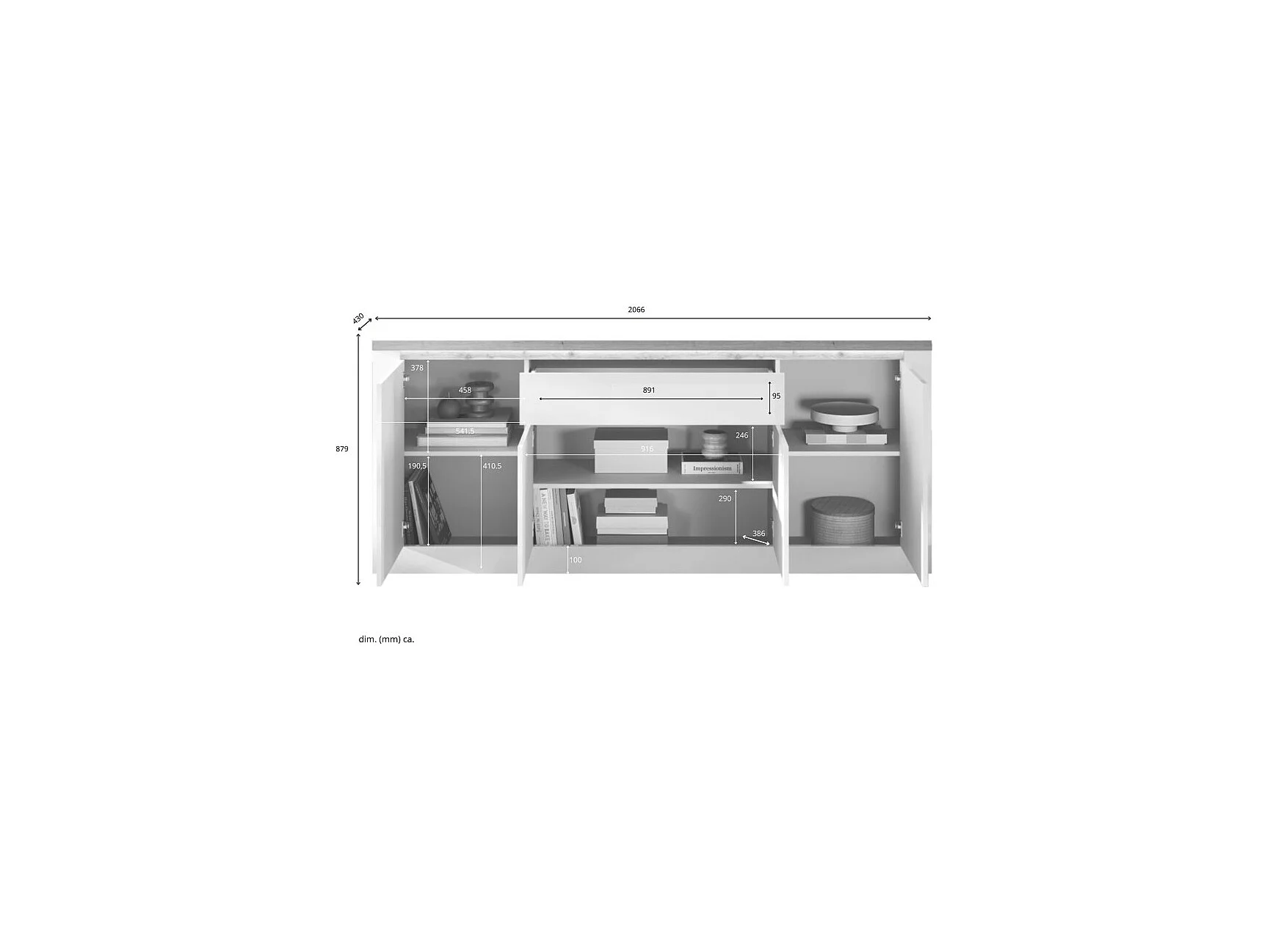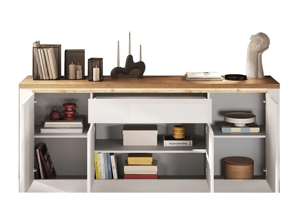Buffet SASHA – 4 portes + 1 tiroir avec LED intégrée – Blanc laqué et Chêne Cadiz