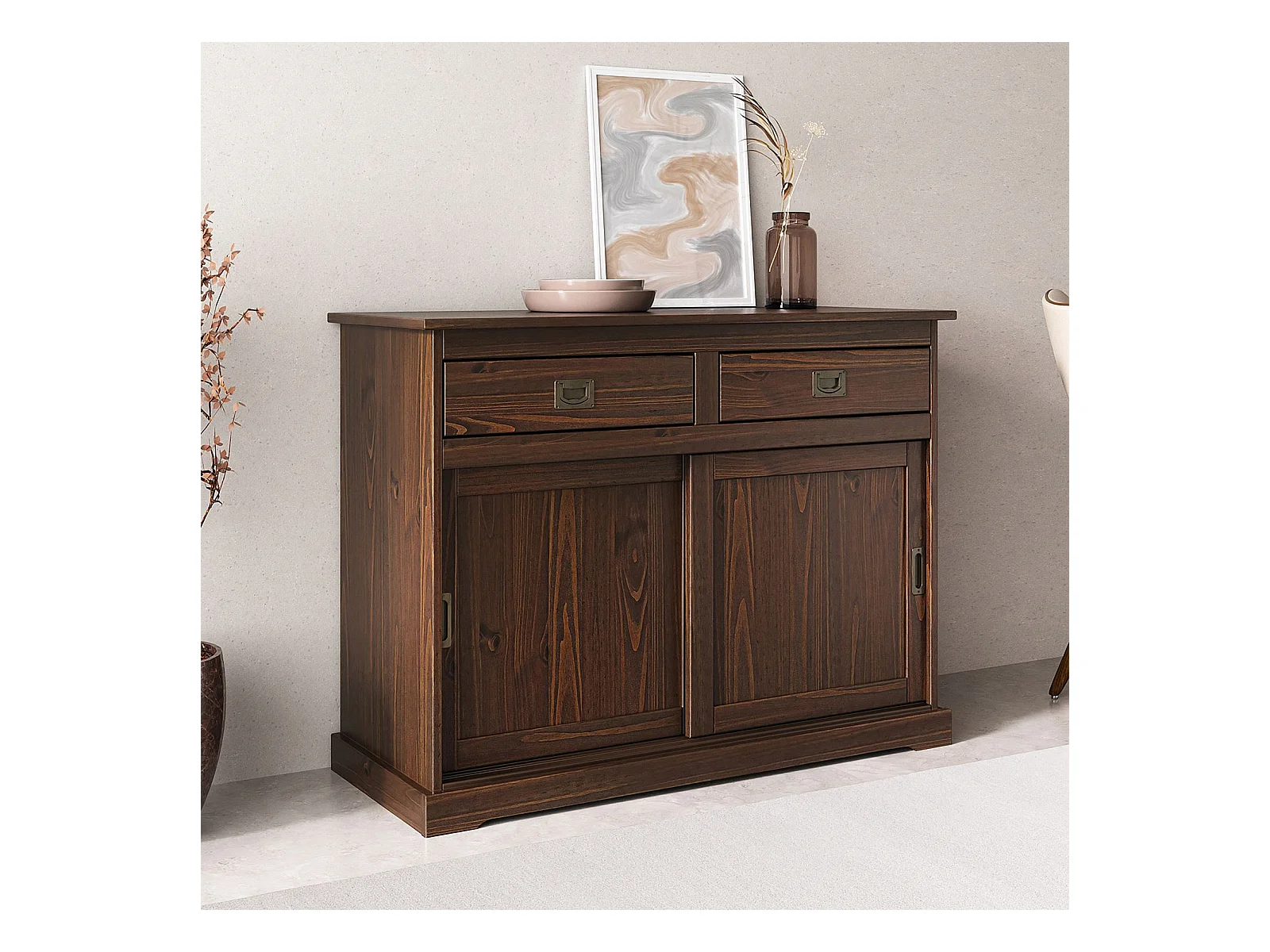 Buffet SAVONA bahut vaisselier commode avec 2 tiroirs et 2 portes coulissantes, en pin massif coloris noyer