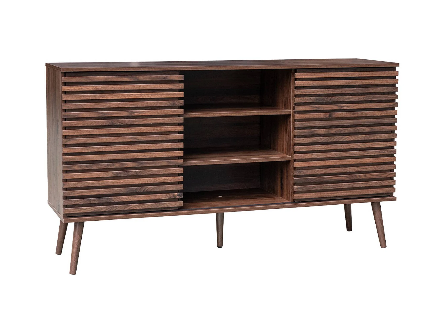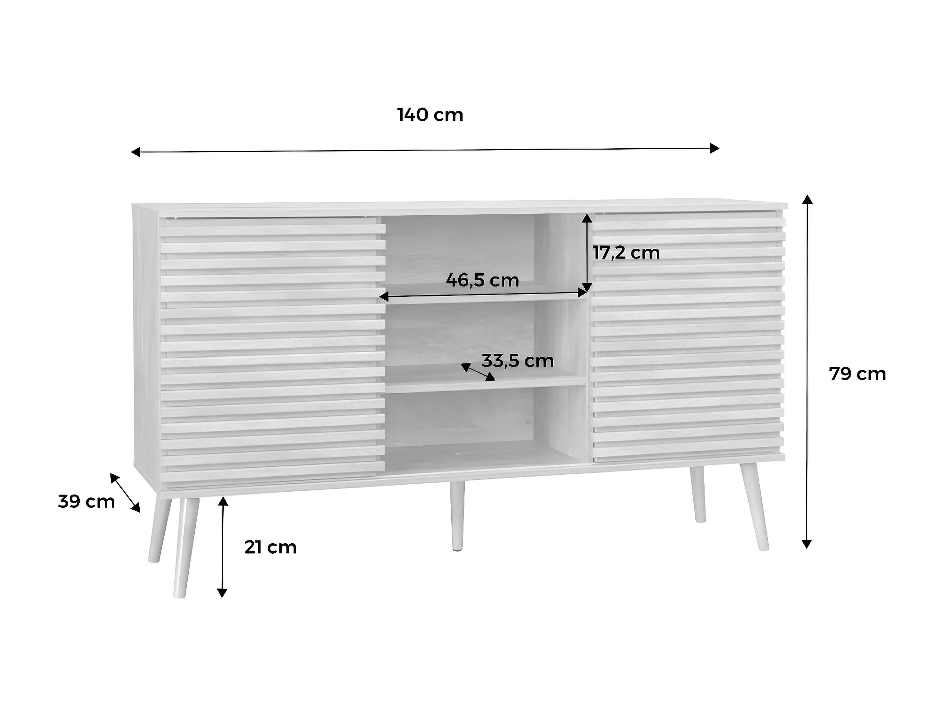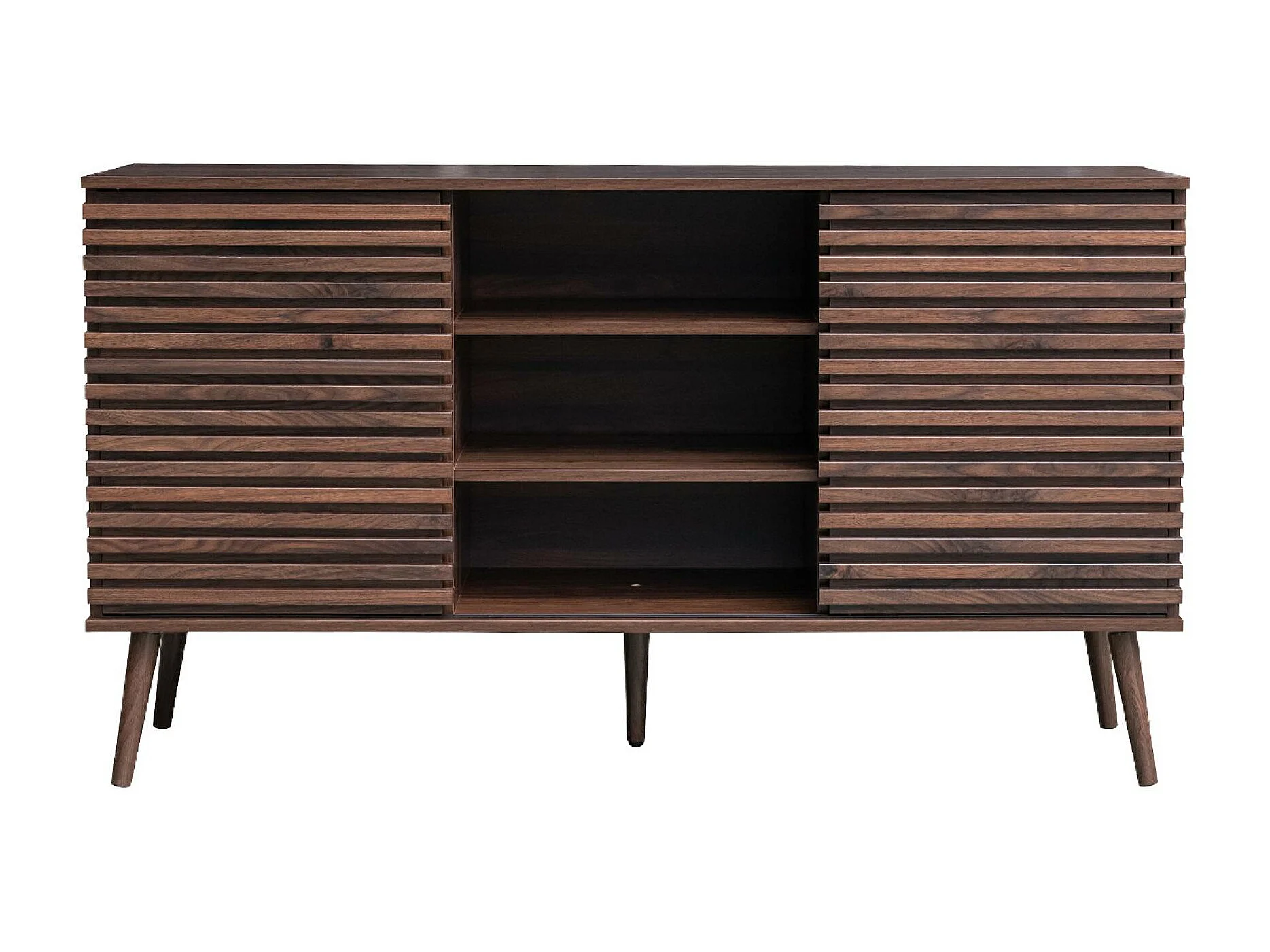 Buffet scandinave décor bois noyer avec 2 portes coulissantes rainurées et 4 étagères. buffet bas. L 140cm