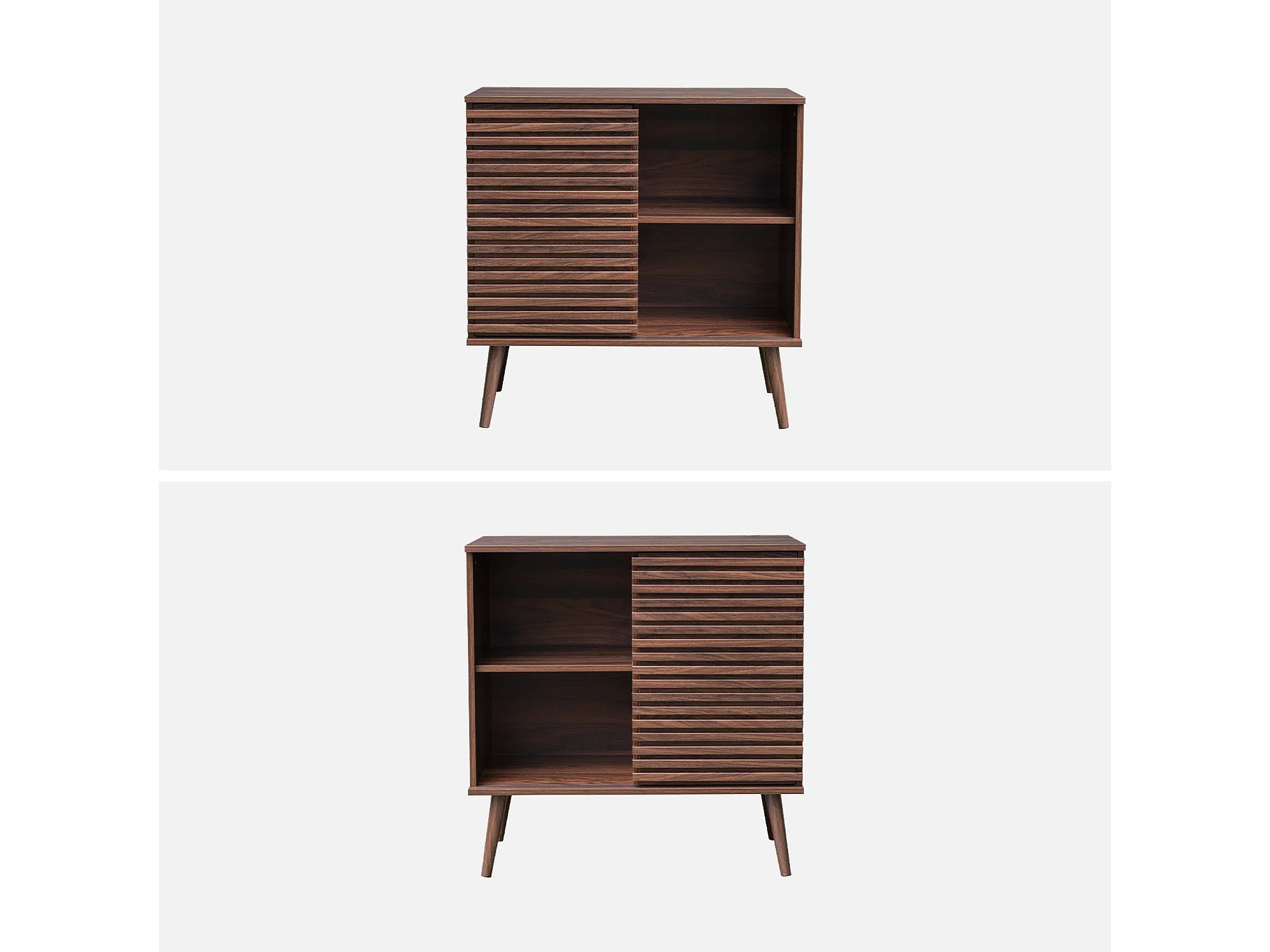 Buffet scandinave 2 portes coulissantes. 4 compartiments. décor bois rainuré. couleur noyer. buffet bas. L 120 x P 40 x H 75cm