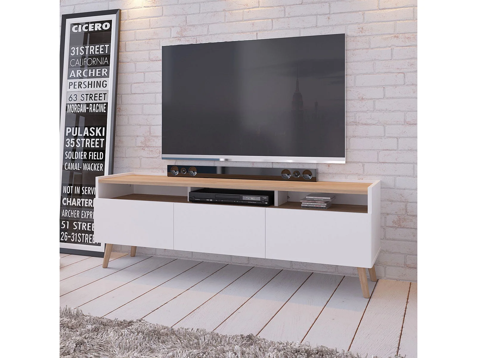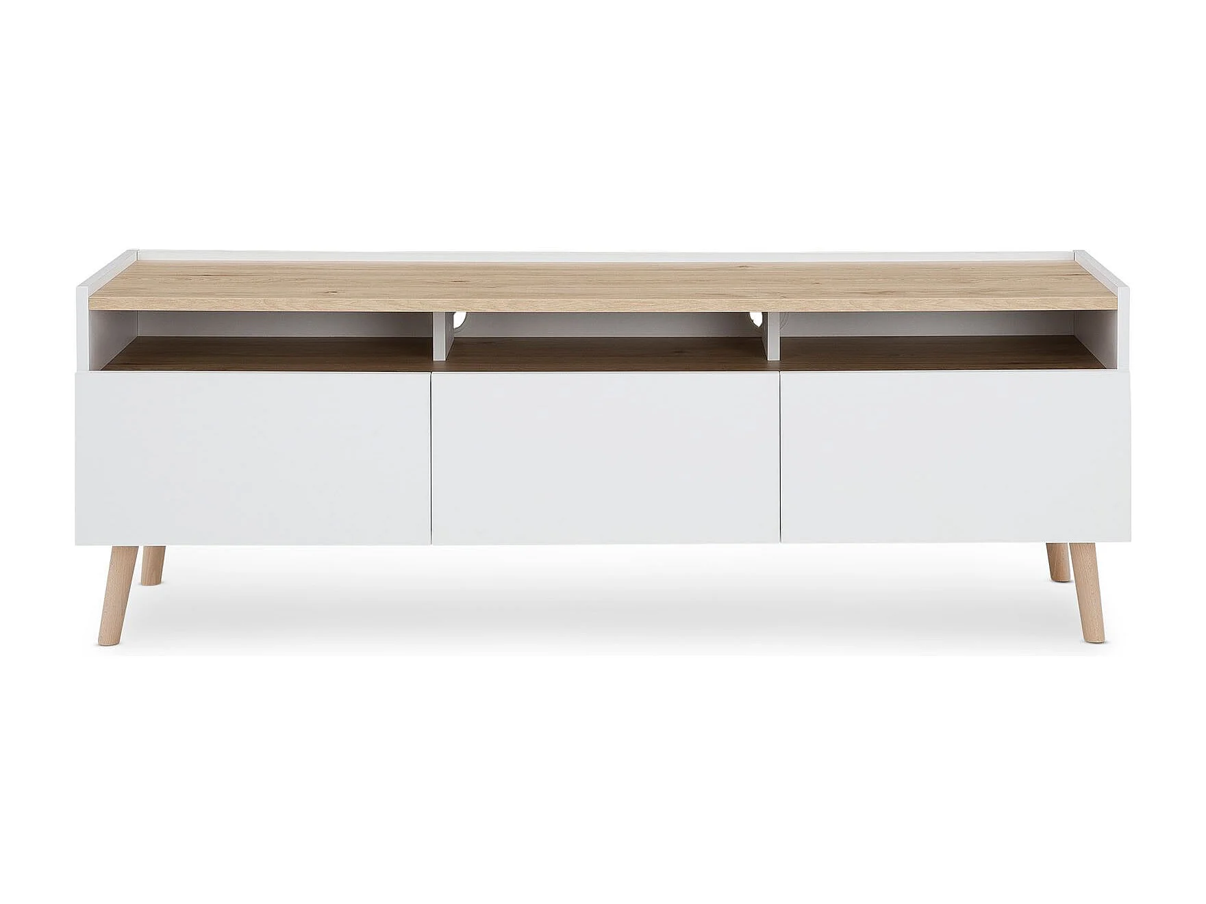 Meuble TV SKANDI L 150 cm en Bois Style Scandinave - Pour téléviseur jusqu'à 65" - Blanc avec 3 Portes
