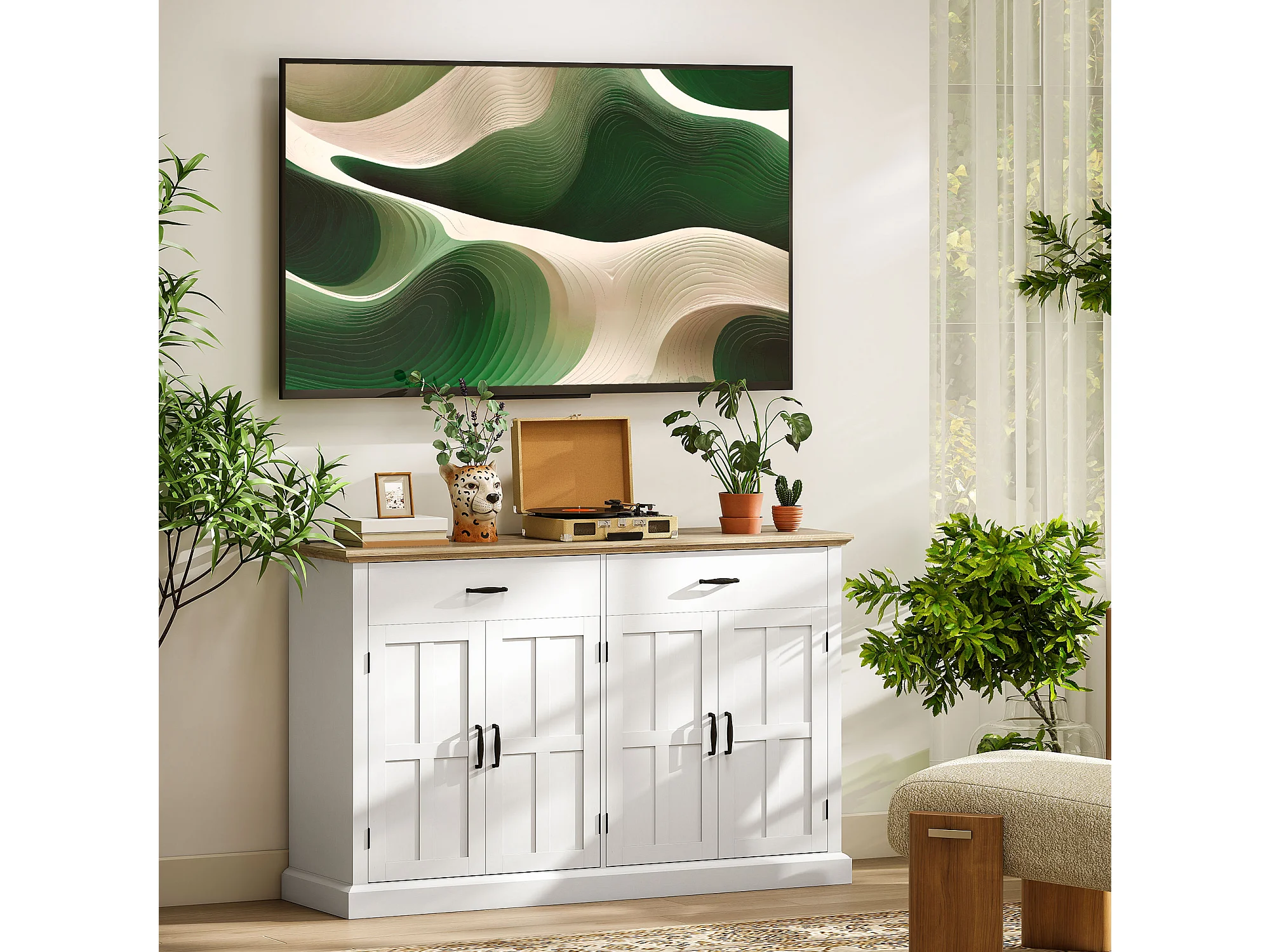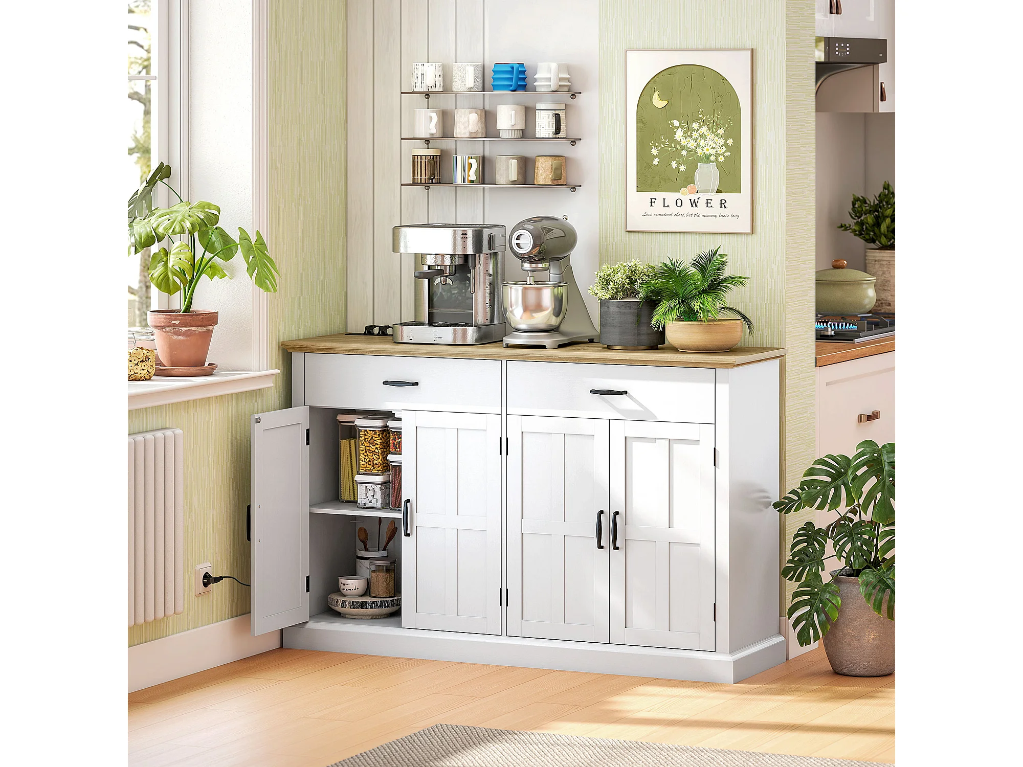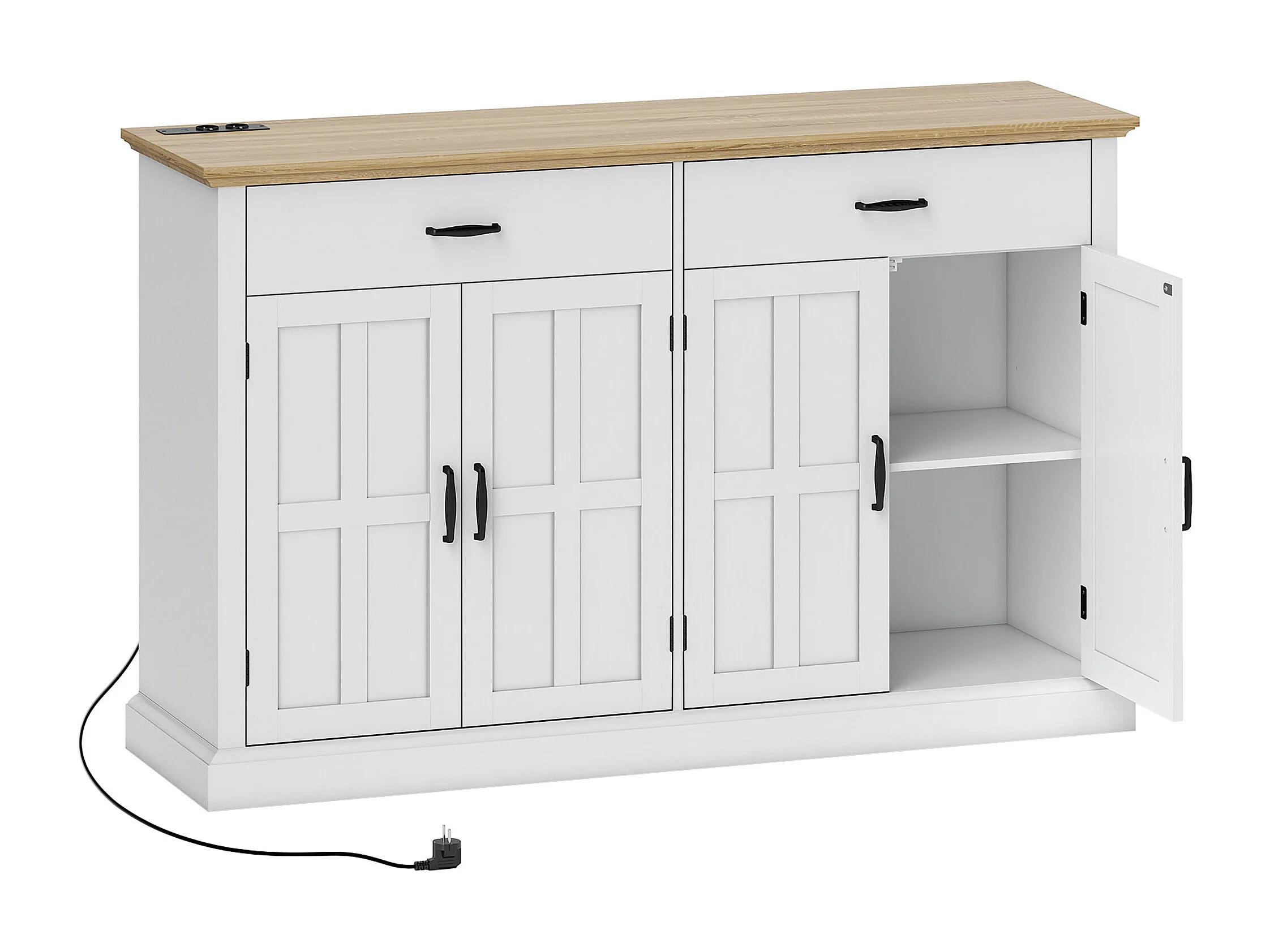 Buffet style rural chic - 4 portes 2 étagères 2 tiroirs - ports USB et multiprise intégrés - blanc effet bois chêne clair