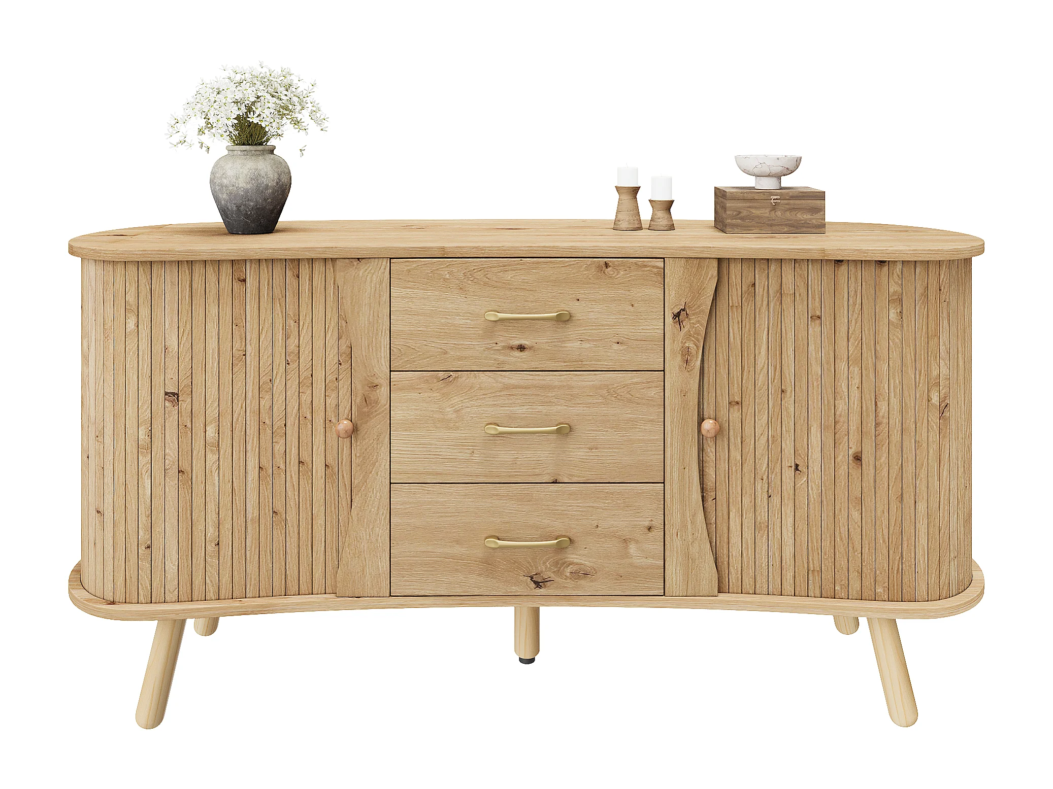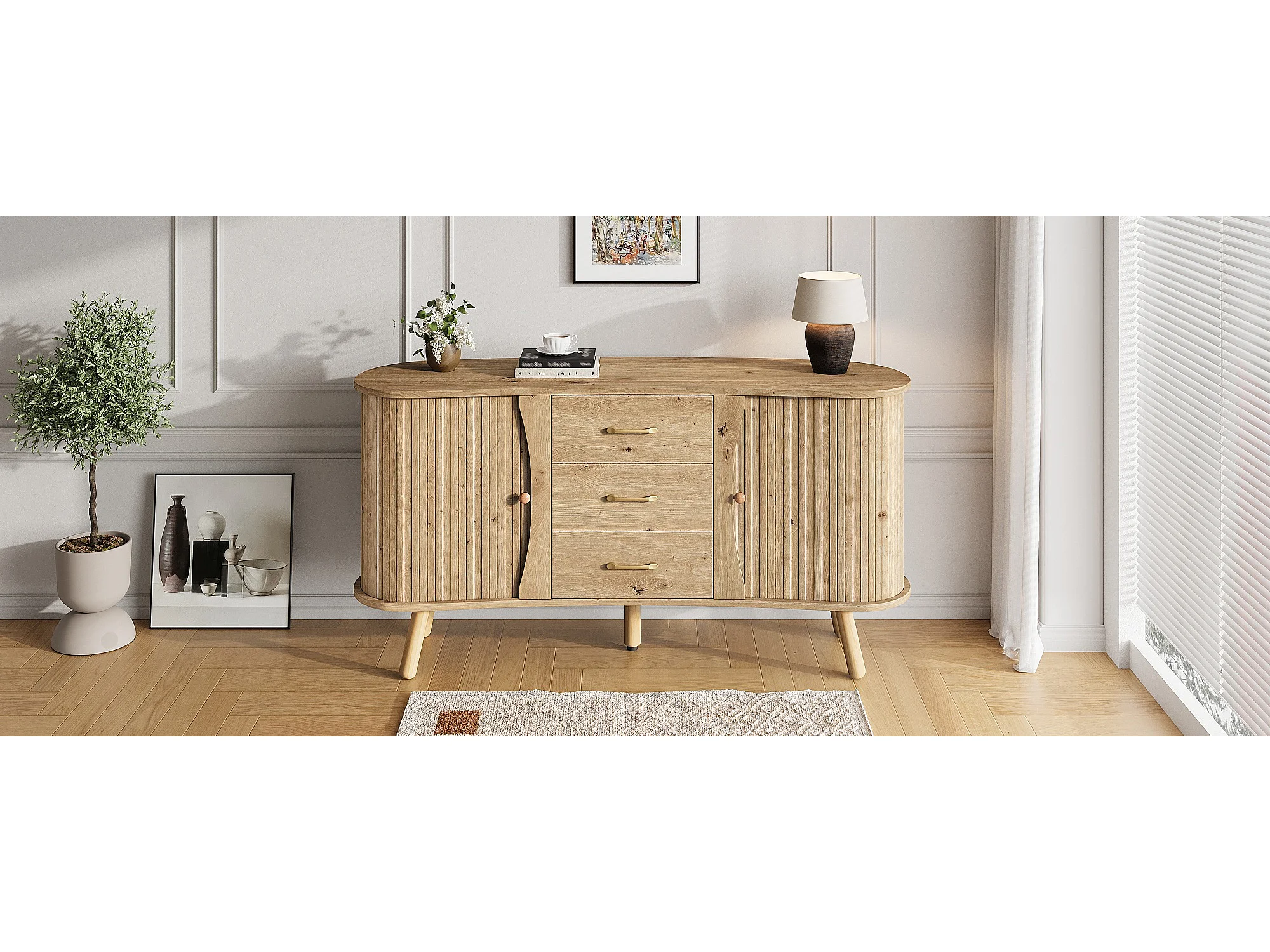 Buffet style scandinave moderne - 150 x 36.5 x 75 cm - avec 2 portes coulissantes + 3 tiroirs - MDF - naturel clair