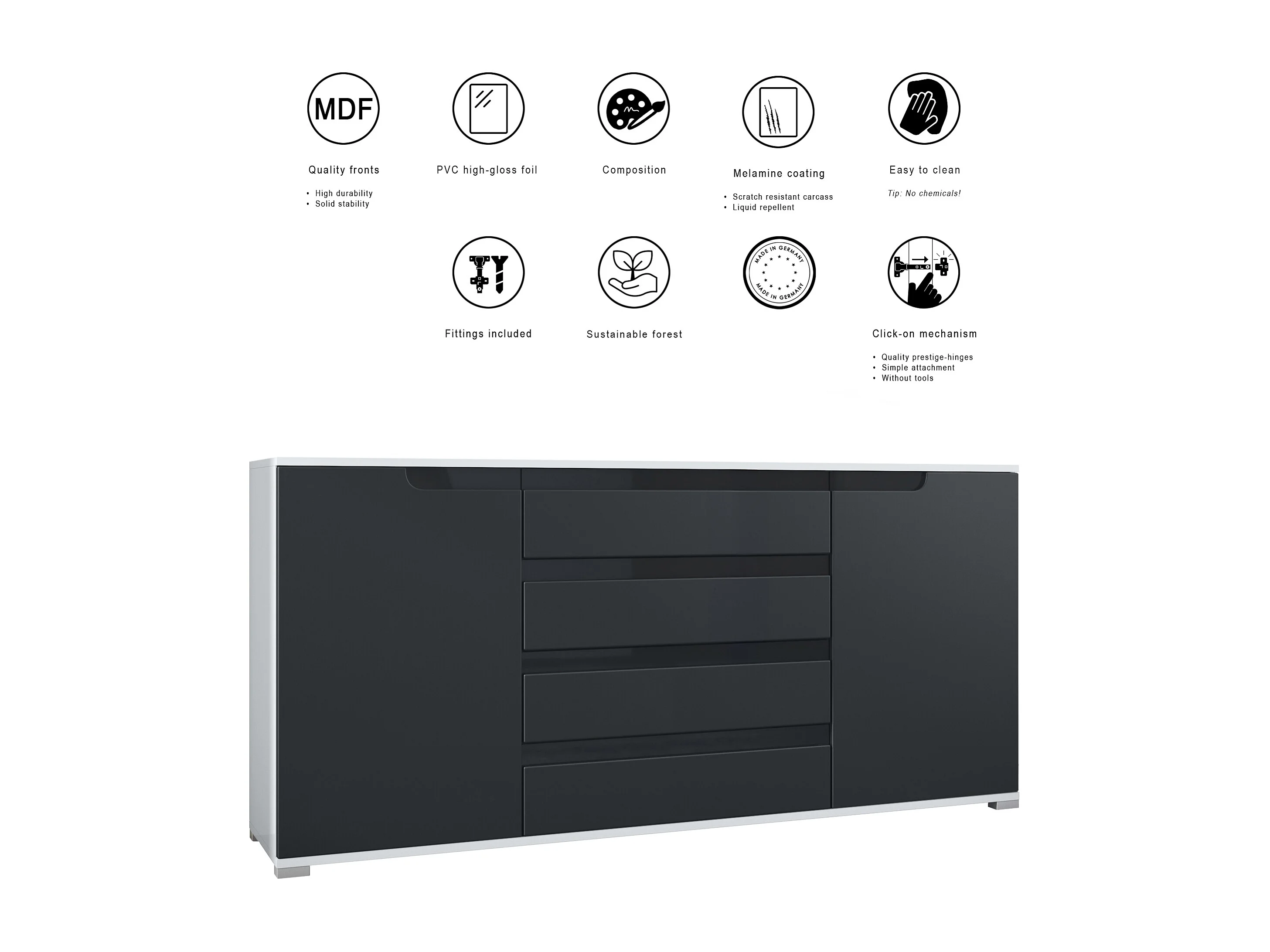 Buffet Sylt V2, Commode avec 2 Portes et 4 Tiroirs, Corps - blanc mat / Façade - blanc haute brillance / Détails - blanc haute brillance (166,5 x 75,5 x 35 cm)