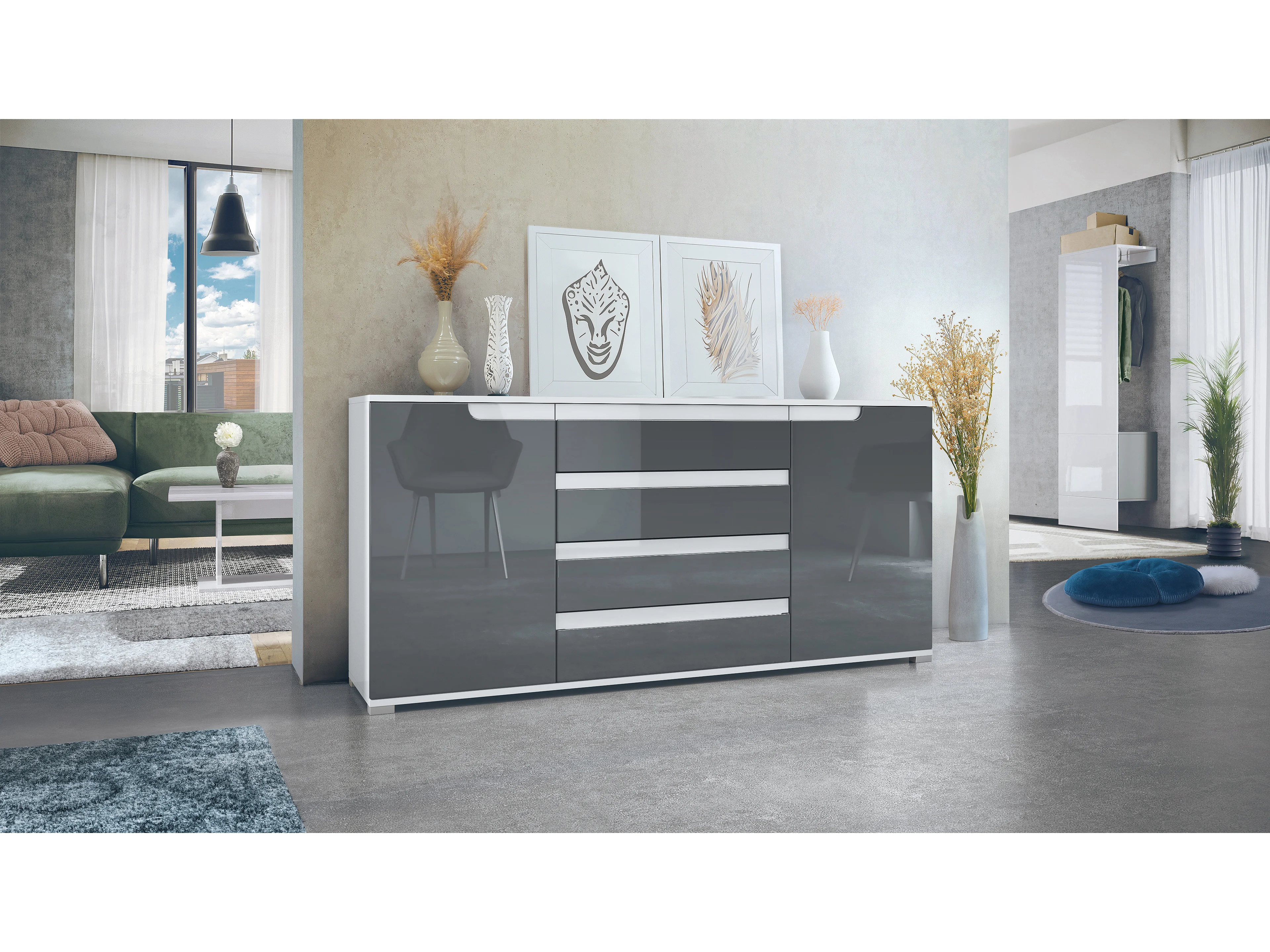 Buffet Sylt V2, Commode avec 2 Portes et 4 Tiroirs, Corps - blanc mat / Façade - gris haute brillance / Détails - blanc haute brillance (166,5 x 75,5 x 35 cm)