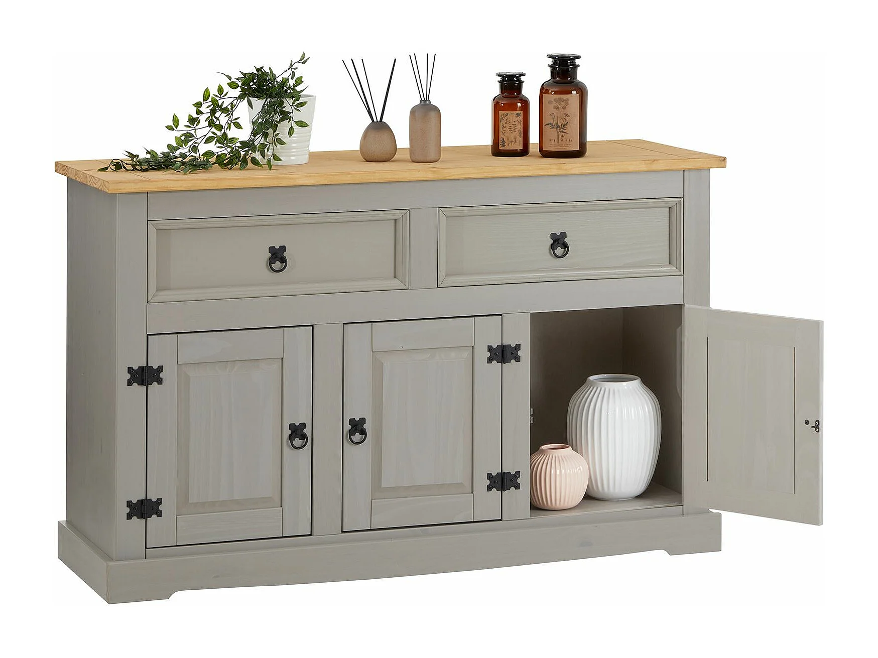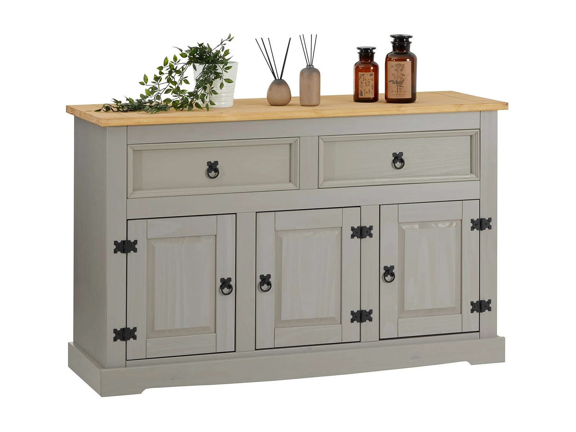 Buffet salle à manger TEQUILA L 133 cm en bois massif gris avec 3 portes et 2 tiroirs meuble de rangement bas