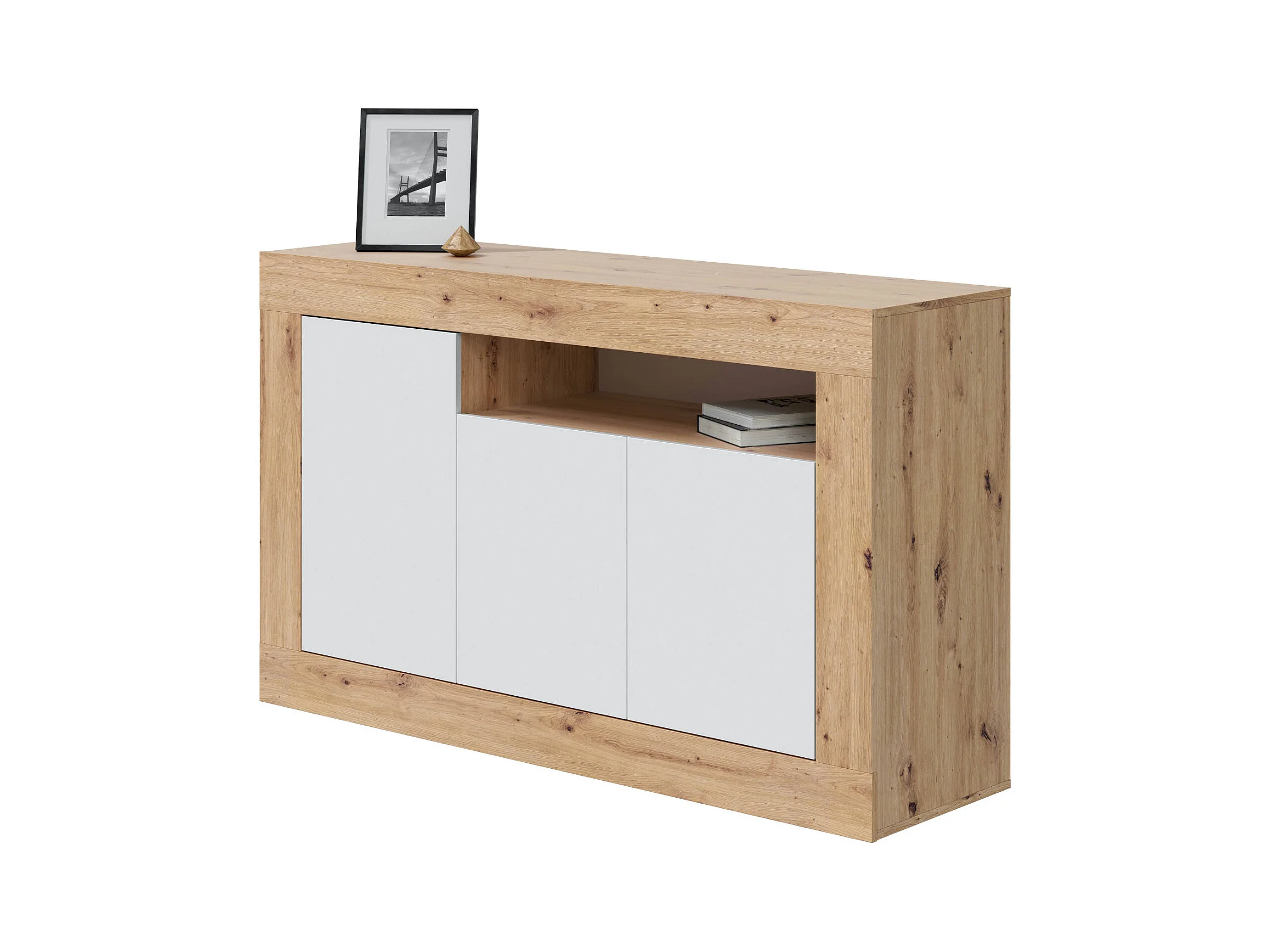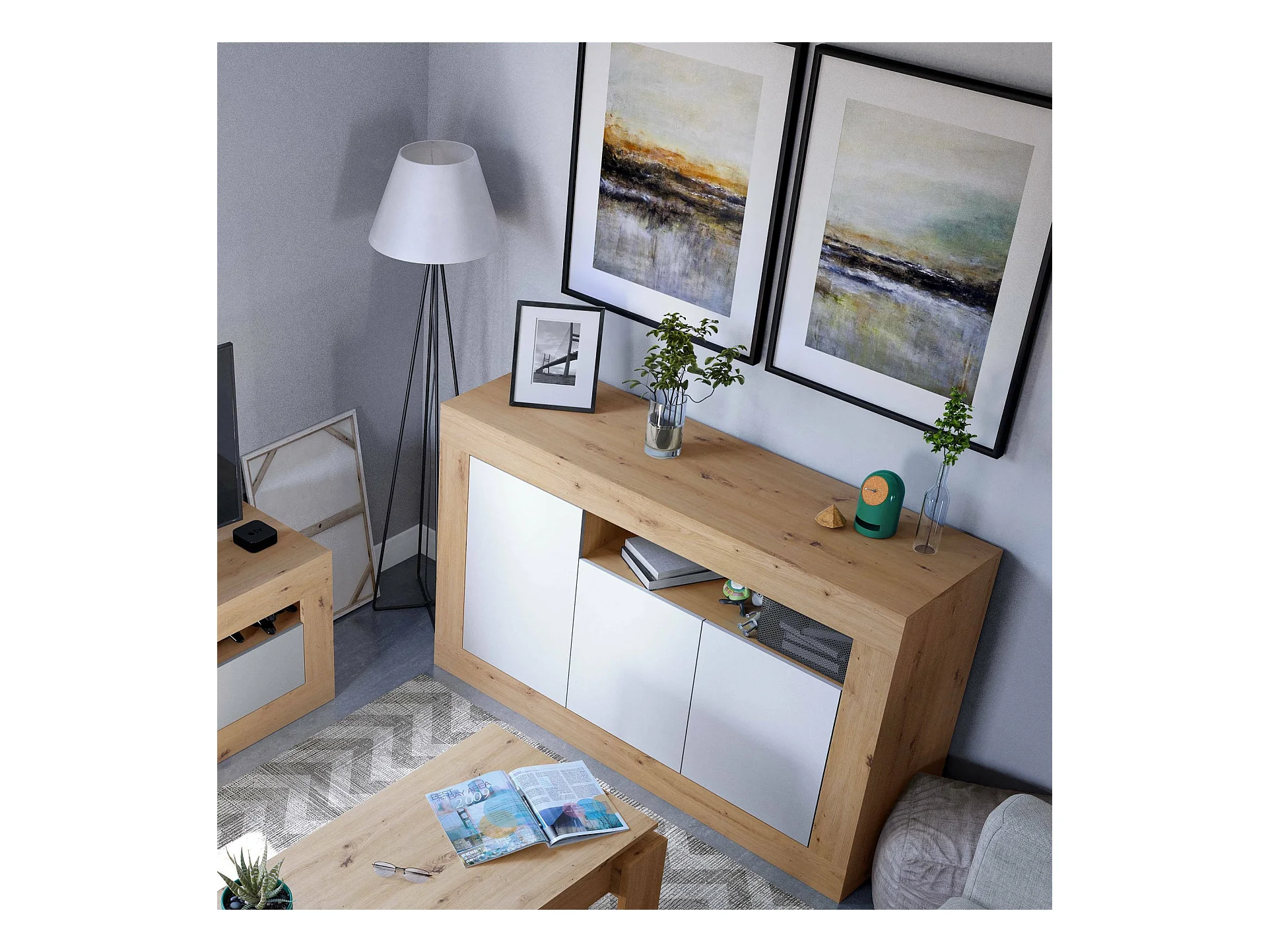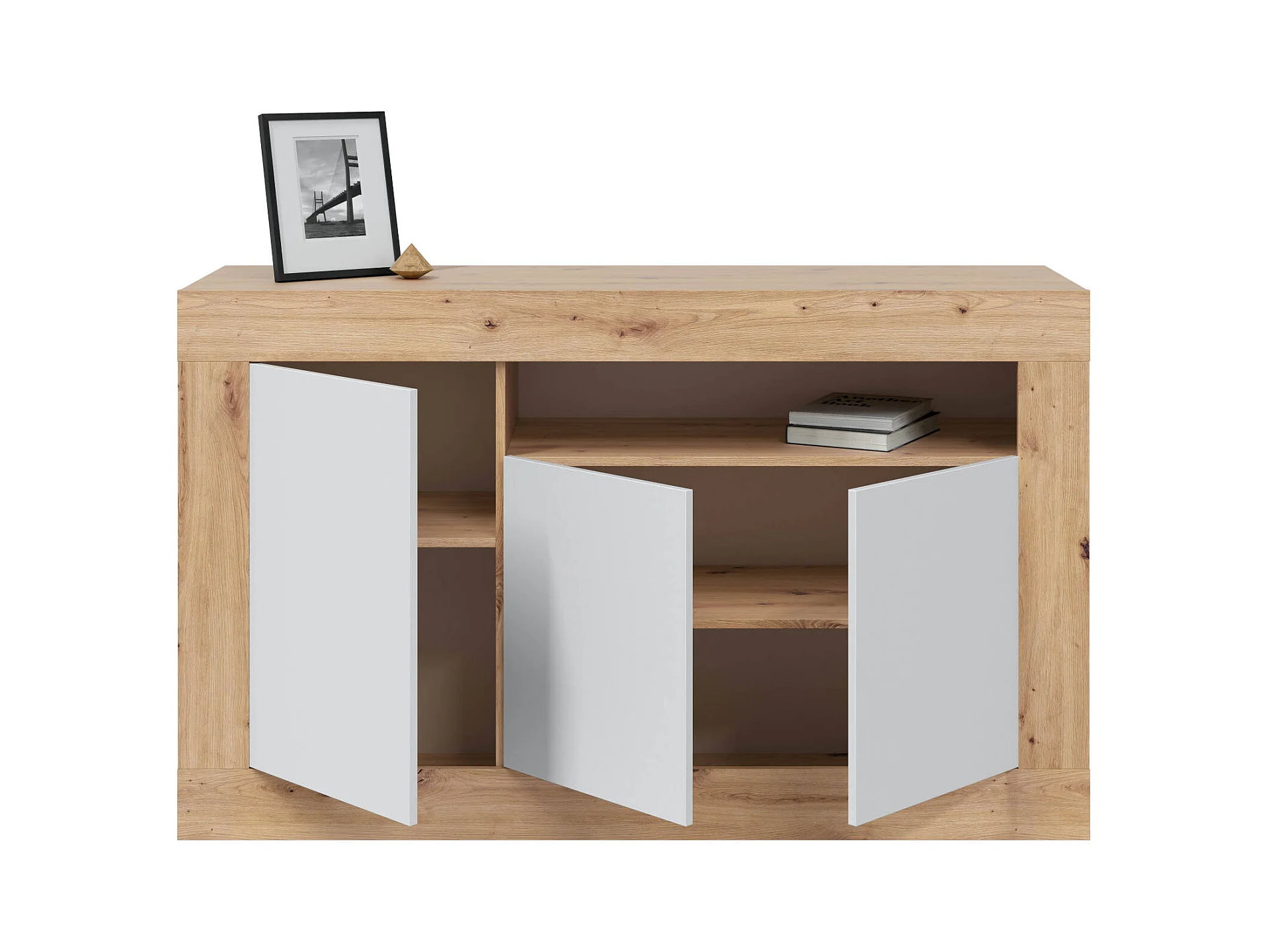 Buffet Thornton, Armoire de salon, Buffet de salon avec compartiments, Meuble TV, Buffet moderne avec 3 portes, 144x42h87 cm, Chêne noué et Blanc