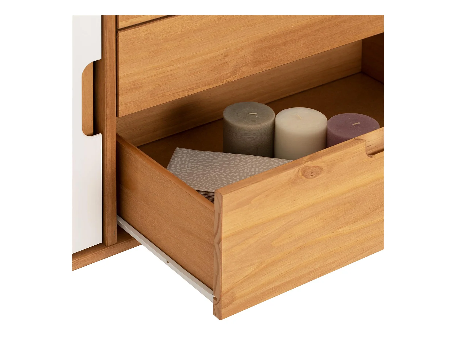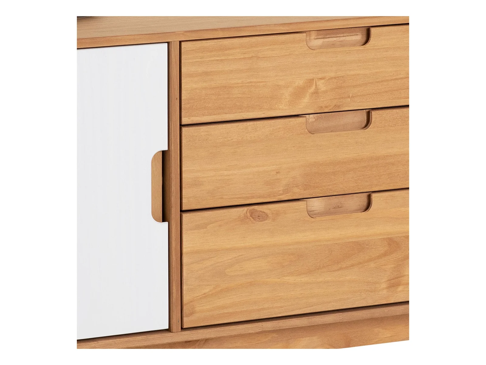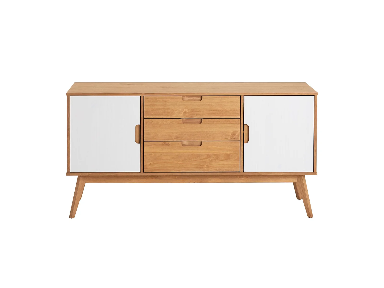 Buffet TIVOLI design vintage scandinave nordique commode bahut vaisselier 3 tiroirs 2 portes, pin massif finition bois teinté/blanc